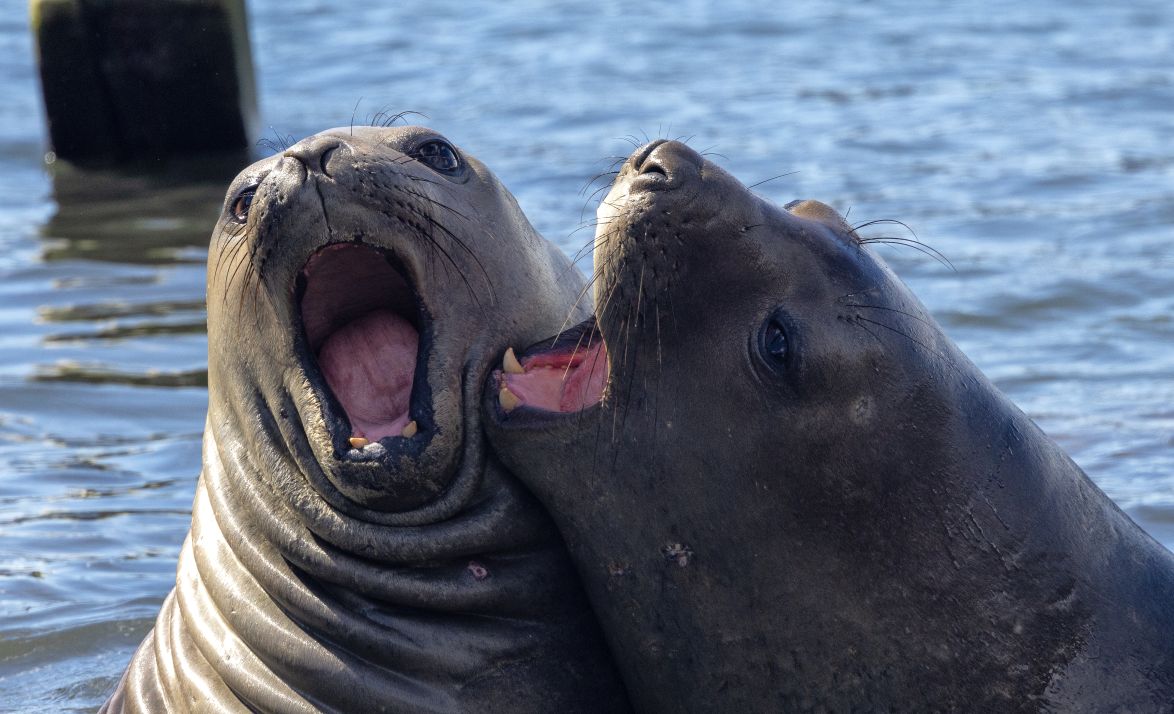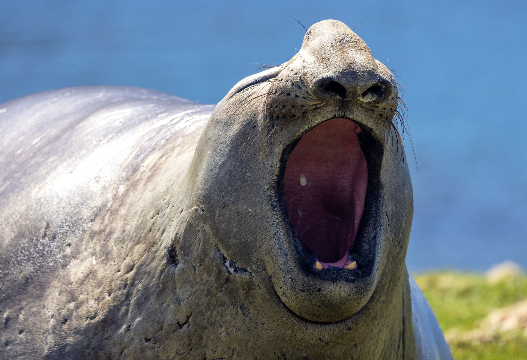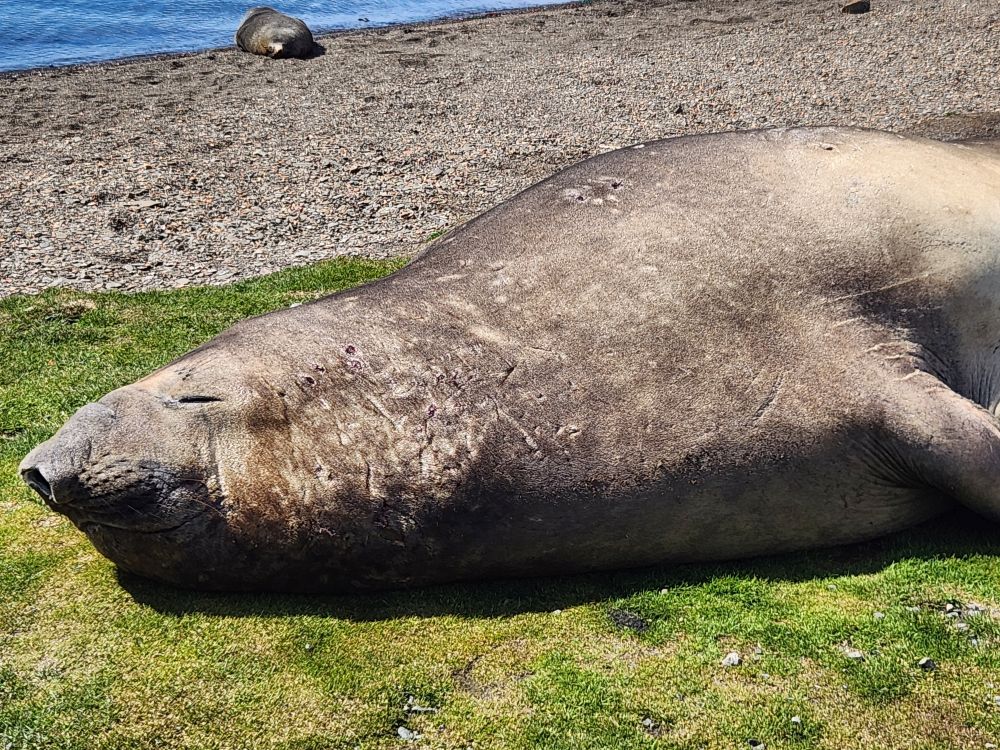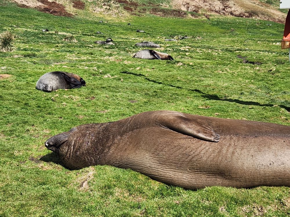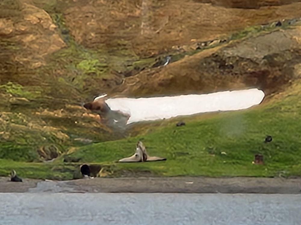 Closer and closer we sail – finally dropping anchor in the cove – where we are treated to the sight of hundreds (probably thousands) of seals – everywhere! There are even two elephant seals fighting or mating (who knows?) on the shore. Incredible. When they break up and move away they look like giant pre-historic worms inching their way along the grass above the shore line.