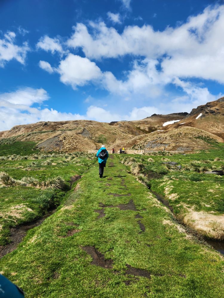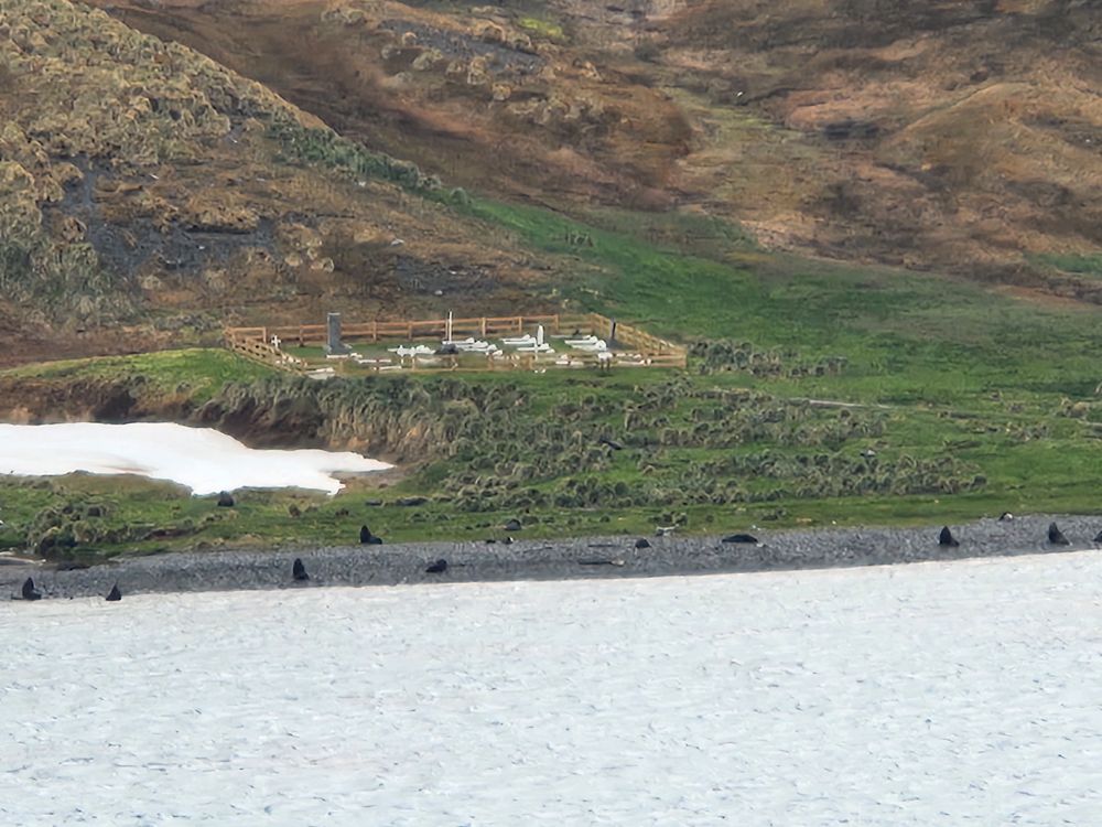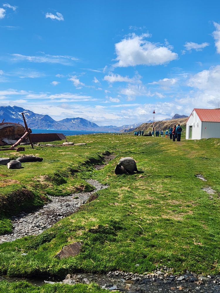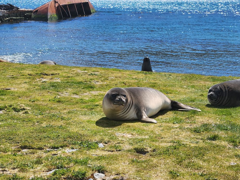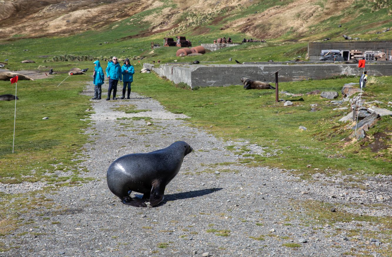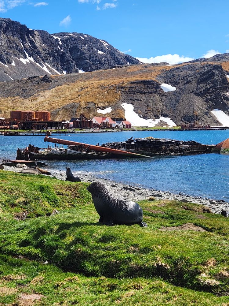 Upon arrival, our group is directed over the cemetery first, so off we trek – following the red flags marking our paths – and always watching out for those seals that are absolutely everywhere making grunting and whining sounds at us. This place is amazing – the remains of the old whaling station, the beached old whaling ship – the scenery, the damn seals! Although some are really cute and posing for us – others, well, not so much.