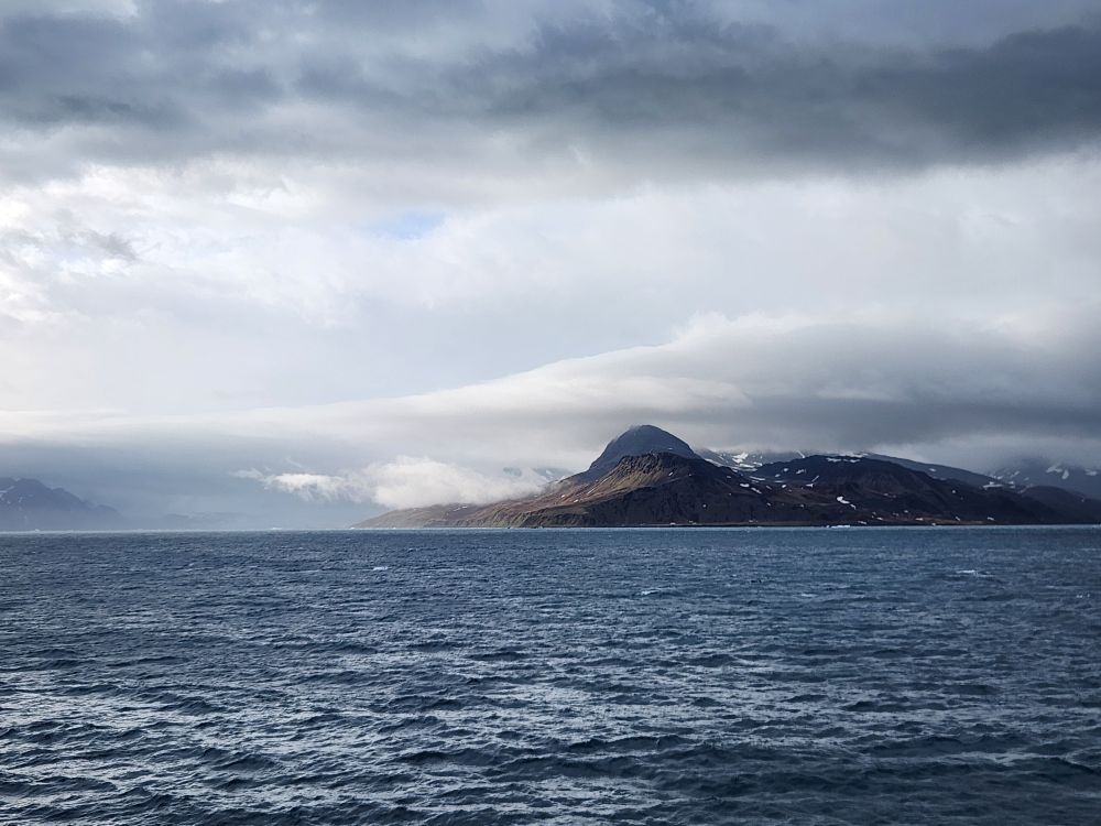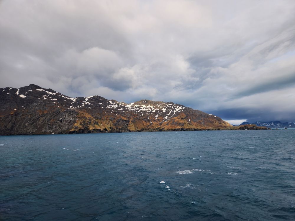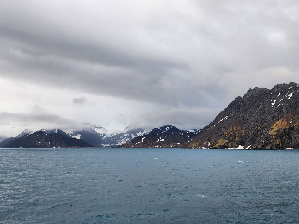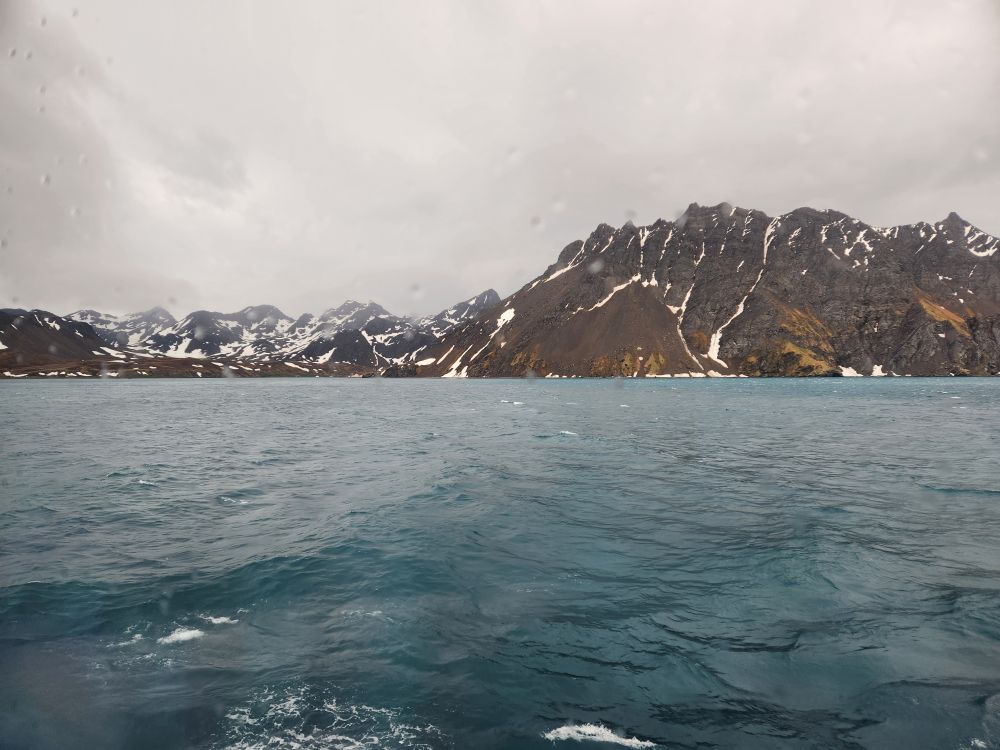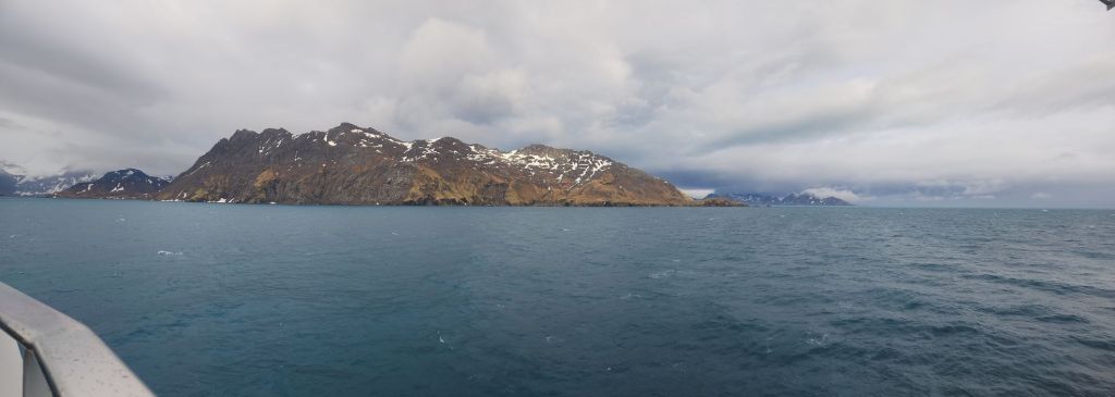 A little before 8:45, we head down to Base Camp to gear up and hop on the tender for the quick ride to Grytviken. We are all (including the expedition staff) happy we are using the tender – much easier and quicker than trying to load 5 or 10 zodiacs full of people. Our entire Yellow group can go over in one tender, which is perfect. We hop aboard first and follow Mark to a great seat by the door – but then we decide to head outside in the bow for the fresh air and scenery. It is brisk to say the least! Ed bails – but I stay for our beautiful ride into Grytviken.