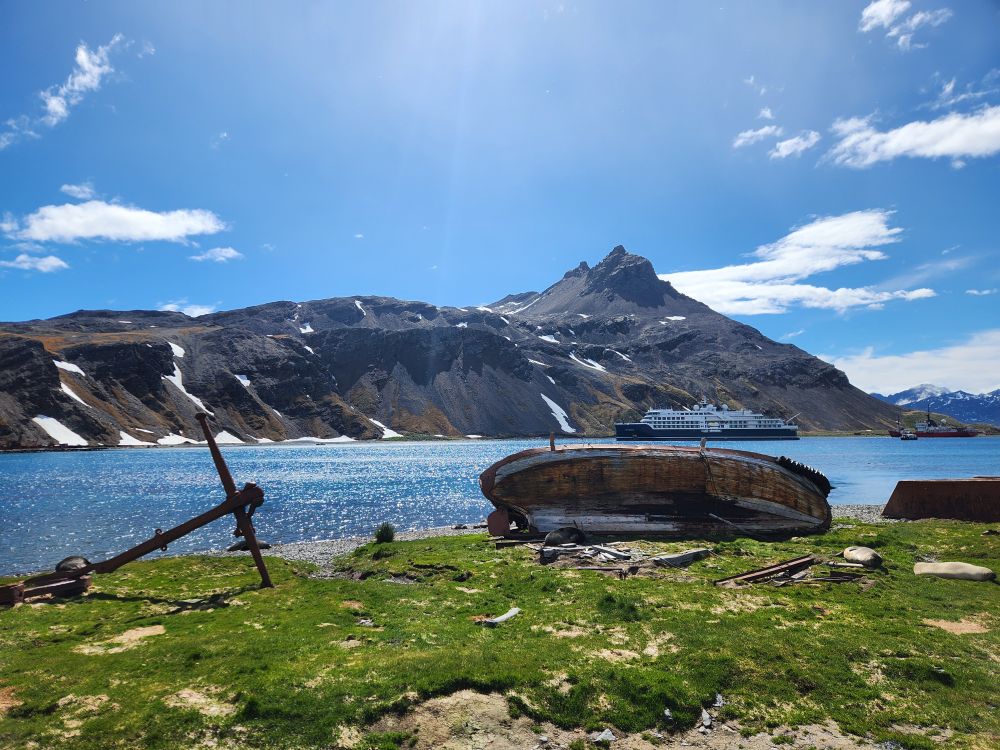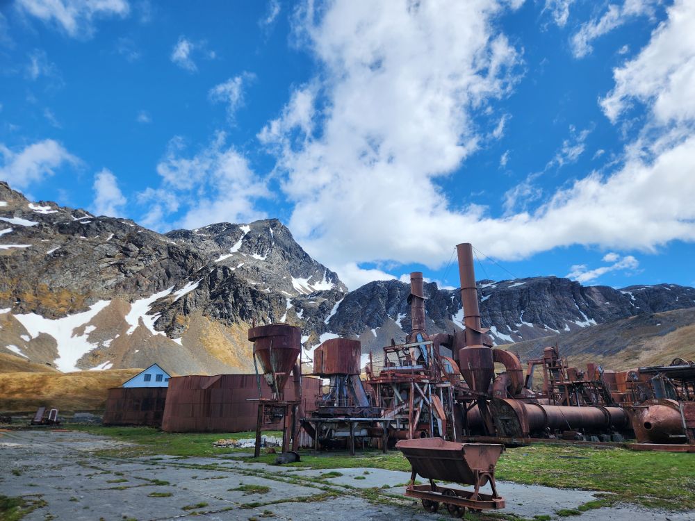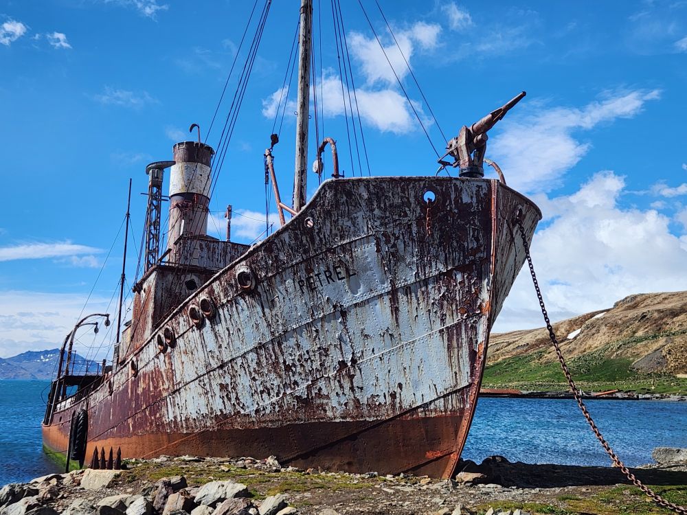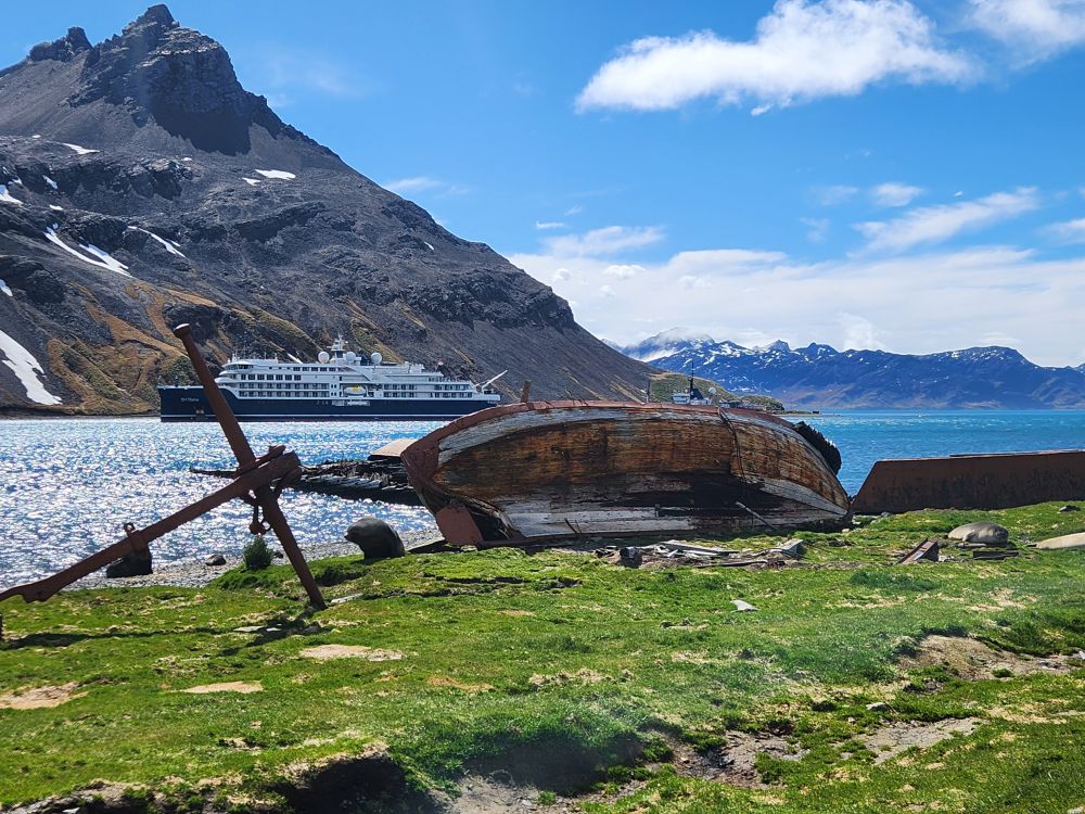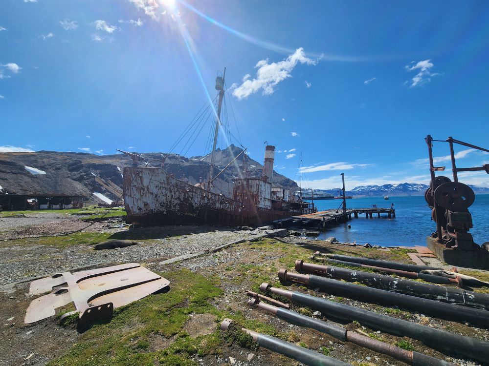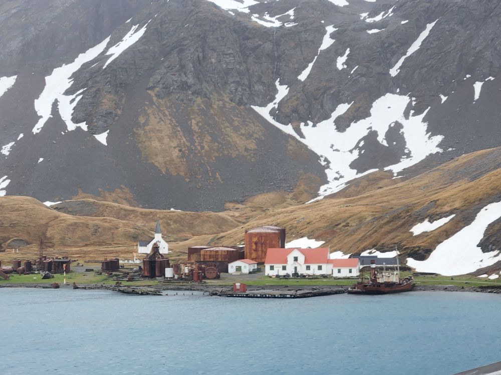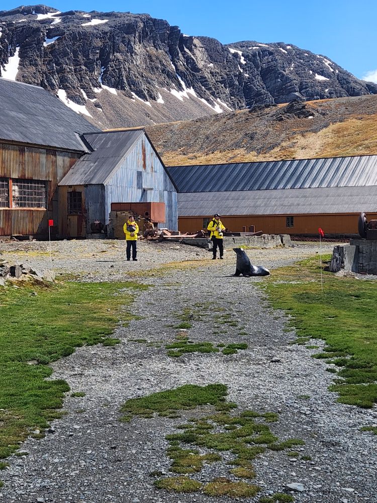 What started out as a cold and rainy day has now turned into a beautiful sunny and slightly chilly day. Fantastic. At the appointed hour, we all head up to the lounge for a Grytviken briefing by the onsite director of the South Georgia Heritage Trust, Deirdre Mitchell, a lovely Scottish woman who tells us all about the Trust and the restoration projects they have going on. All the while the S. Geogia customs agents and biosecurity folks are onboard clearing the ship for arrival.