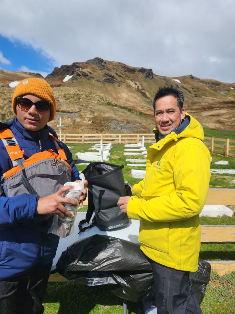 Safely arriving at the Cemetery, Renato, our fantastic F&B Manager is there handing out whiskey for our toast to Shackleton at his grave.