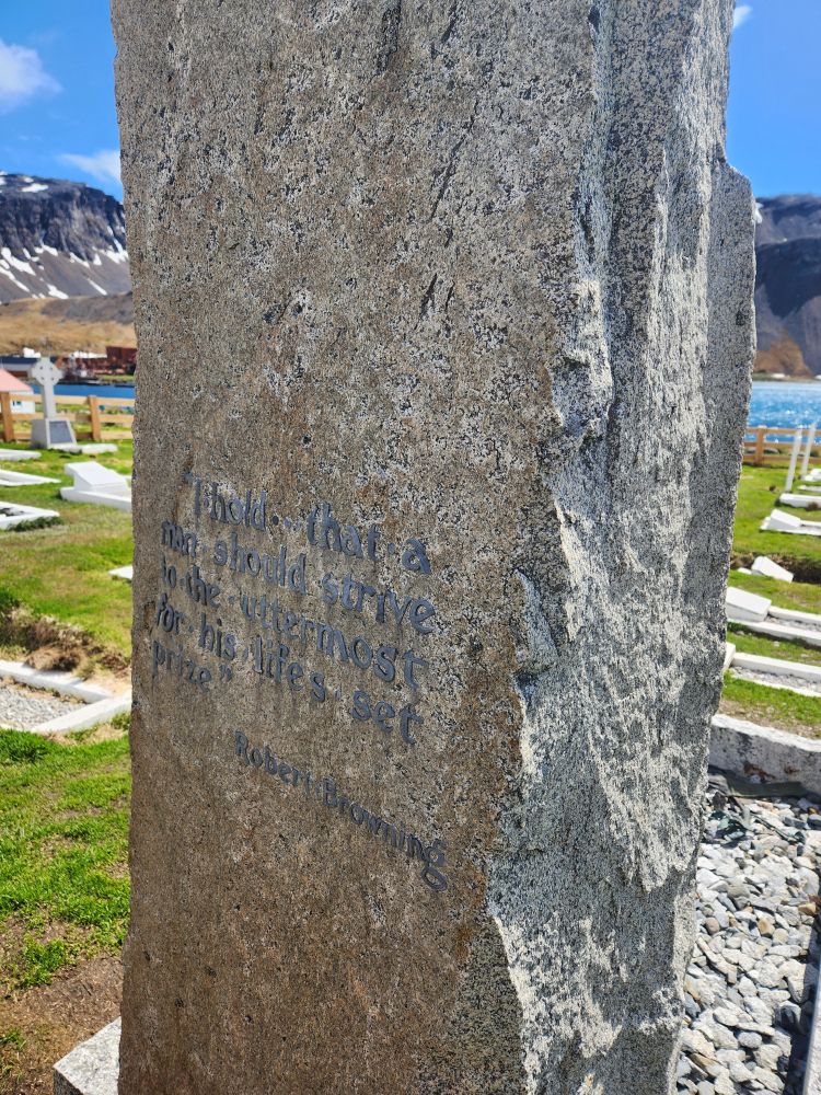We are one of the first up here – which makes for an awesome visit and experience. We drink our whiskey toast – yes, even I drink the whiskey – and then, against all rules, but because it is established tradition, we throw a little whiskey on the grave and begin to wander about the graveyard. There is a Robert Browning poem on the back of Shackleton’s grave: “I hold that a man should strive to the uttermost for his life’s set prize.” Sounds just like Shackleton. A little trivia – all the graves except Shackleton’s are facing east. Shackleton’s head is facing toward the South – as that was his major quest in life.