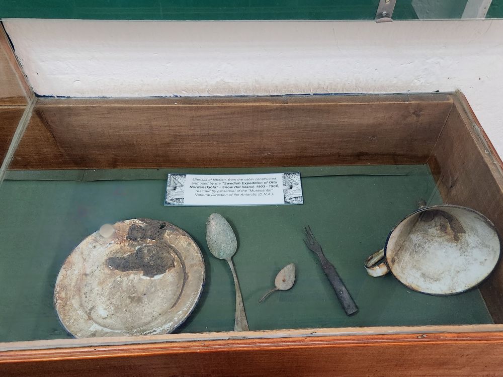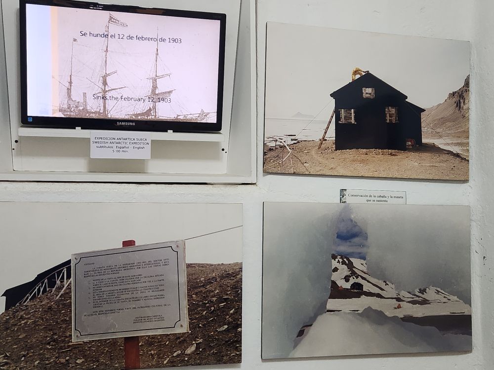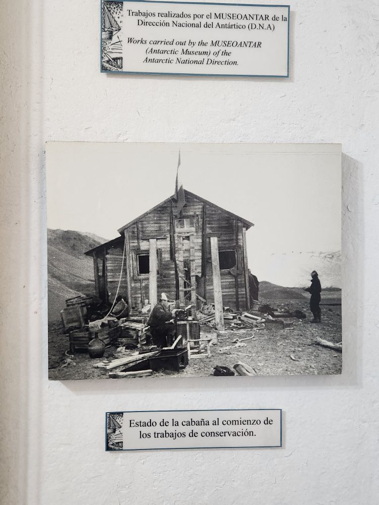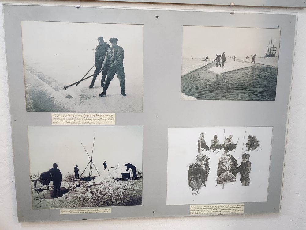 Turning back to the cell block, we begin our examination of the Antarctic voyages and Explorations chronicled here. We have learned about virtually everything here from our lectures on board! Totally cool – lots of additional info – and amazing photographs. A whole series of rooms about the SS Antarctica, the Swedish Expedition led by Nordenskjold we just learned about yesterday. Two years on the snow! Here though we can see actual photos of the cabin they built, the huts, the dogs, the skis, plus artifacts that were found later when others went back to create a museum in the buildings.