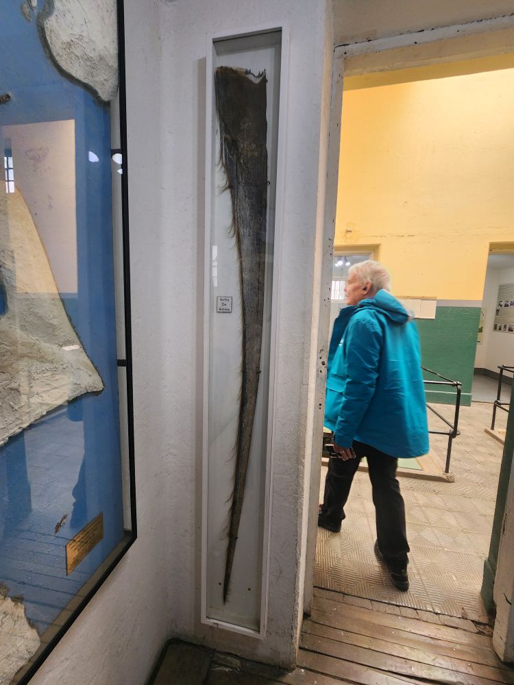 There are fossils that show sea and plant life where it doesn’t exist now on the White Continent. An exhibit on the Belgica, with photos of how the men cut the ice to get the ship free. Cool displays of carved whale bone (ok, not cool it was whale bone, but the little dog sled was just amazing) and an example of a piece of baleen from a whale’s mouth. You can see how big it is compared to Ed – it must be about 7 feet in length.
