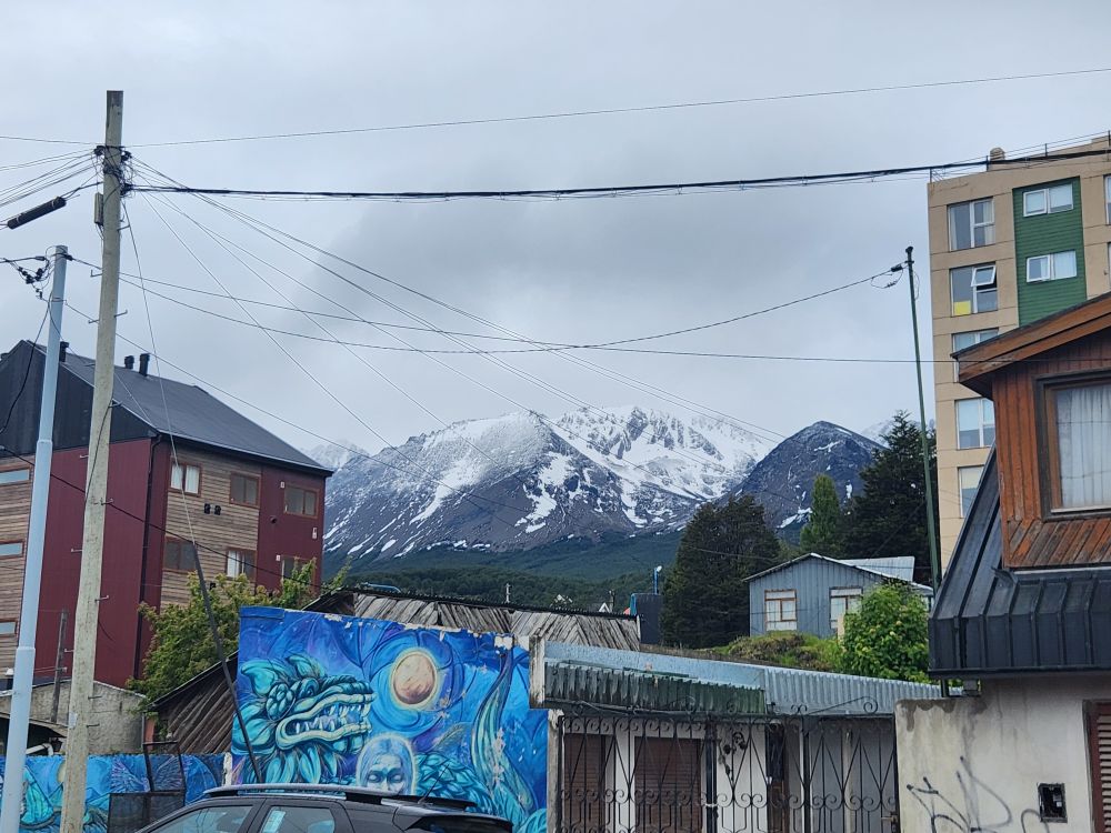 A fantastic way to spend a few hours though. Very immersive and full of interesting information and displays. Outside, the weather has brightened a bit – at least there is no more rain – and we enjoy the brisk walk looking at the snowcapped mountains -which we’ll be darned if we can’t get a good picture of them without the ubiquitous electrical wires strung everywhere. You’d think we were in Thailand or Nepal!