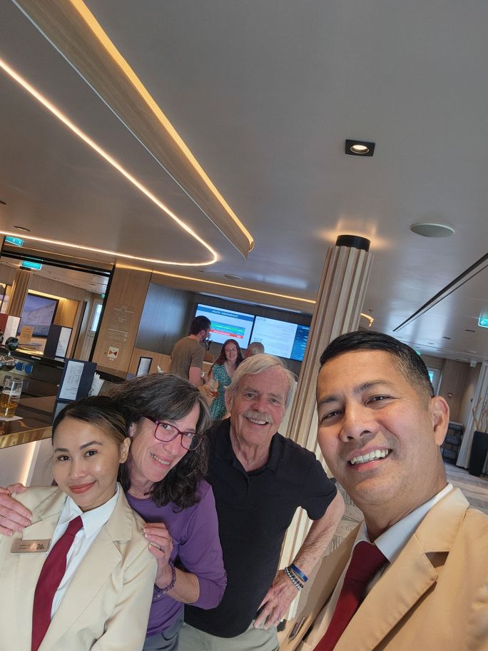 Then it is the sad night when we wish everyone farewell – saying goodbye to all our wonderful waiters and Cherry, our sommelier. Dinner is a fabulous beet bourguignon – amazing! If it weren’t the last night, I’d definitely ask for the recipe – but Google will have to be my friend. Then it was up to the bar for our last drinks with Allan and Sunshine – and off to bed we go, placing our luggage outside by 10p and hitting the hay for our early morning abandon cabin call.