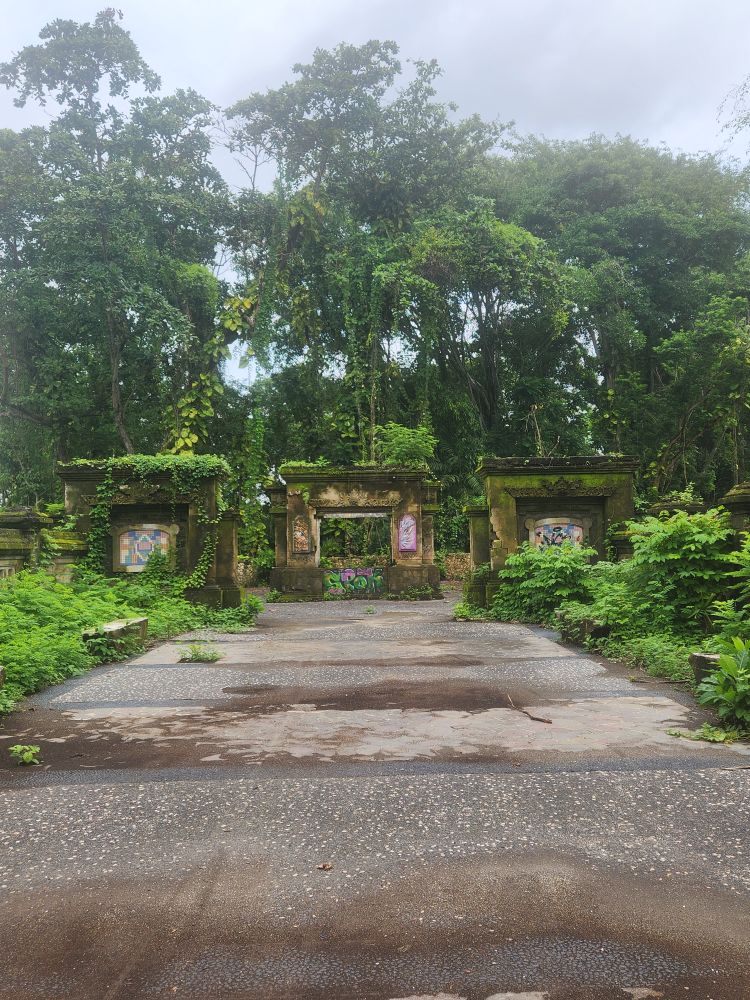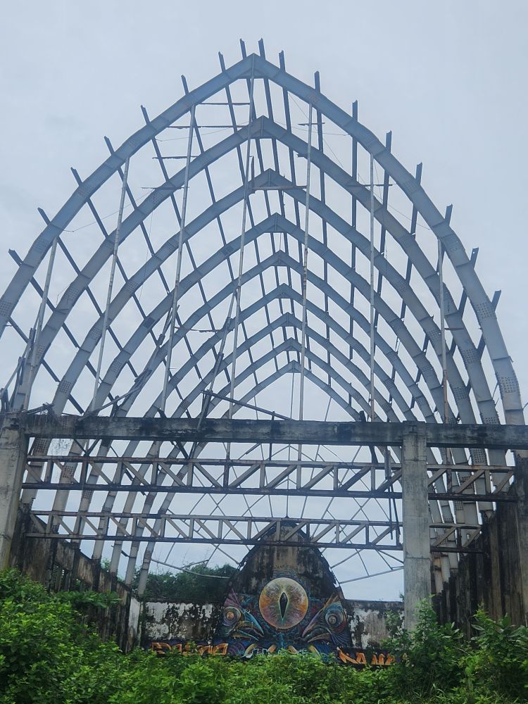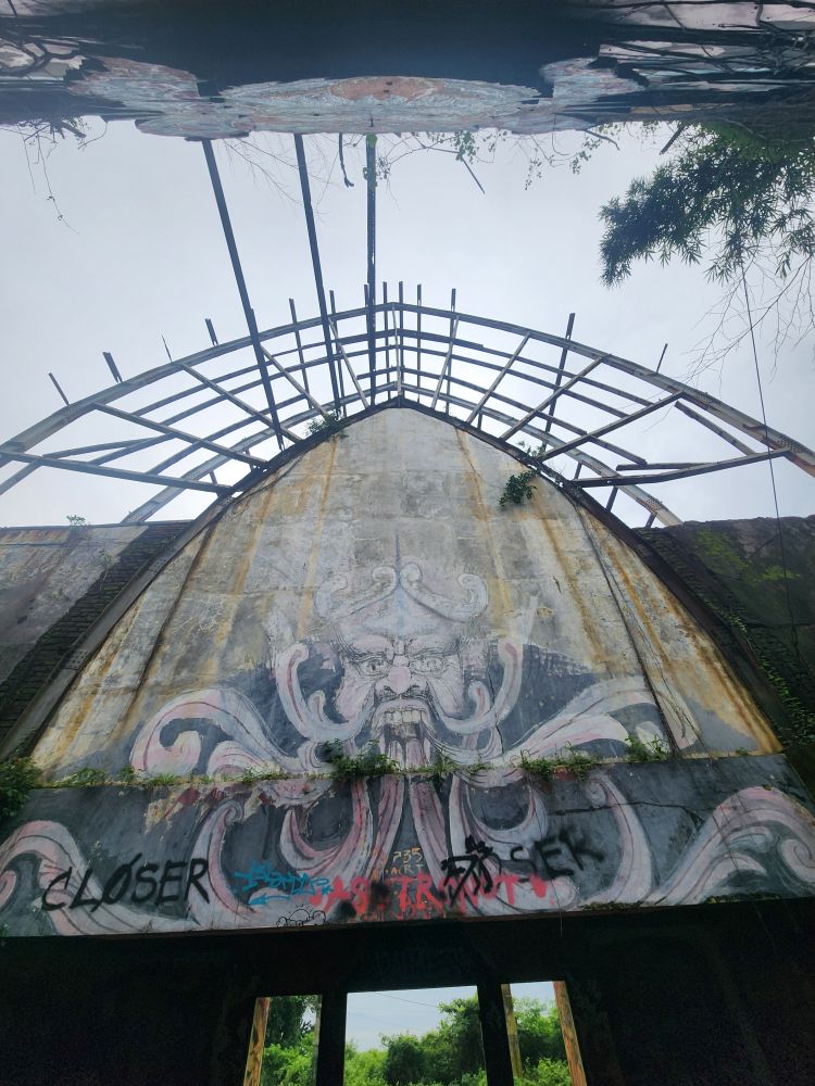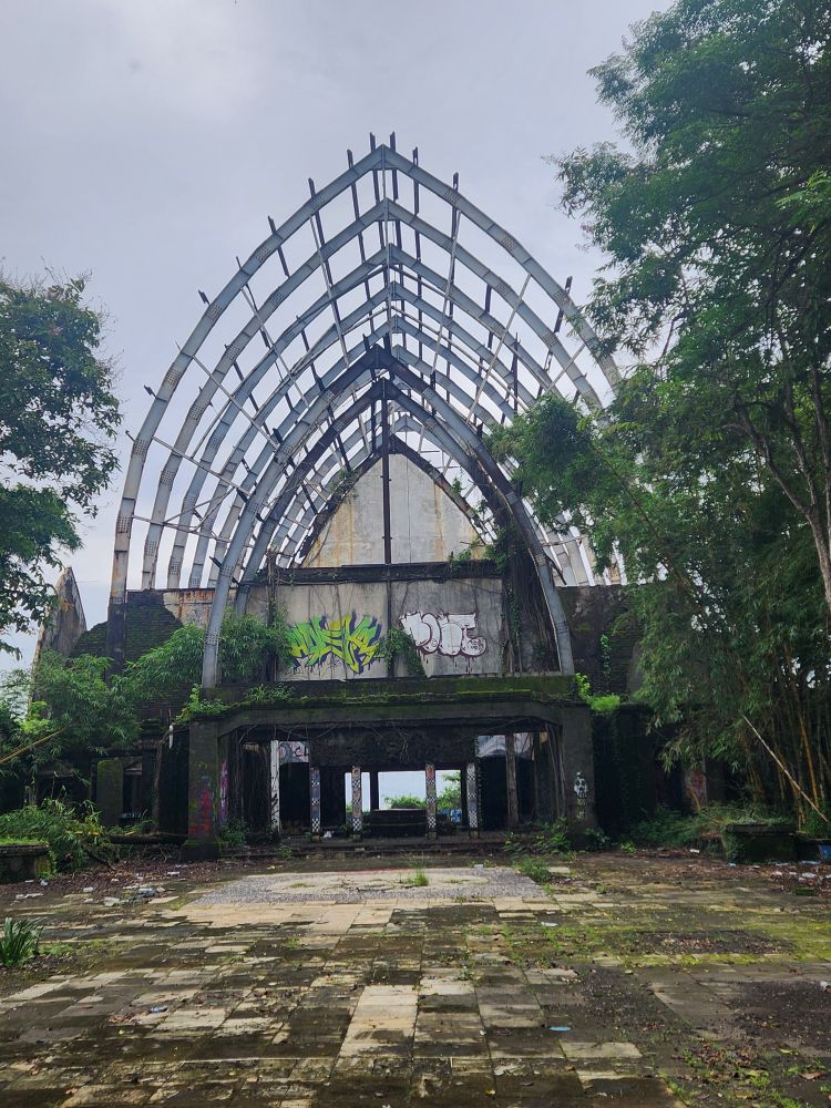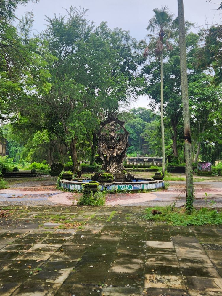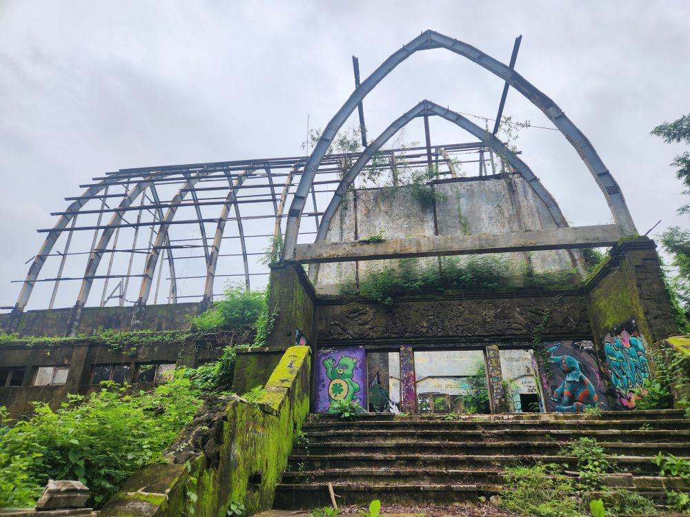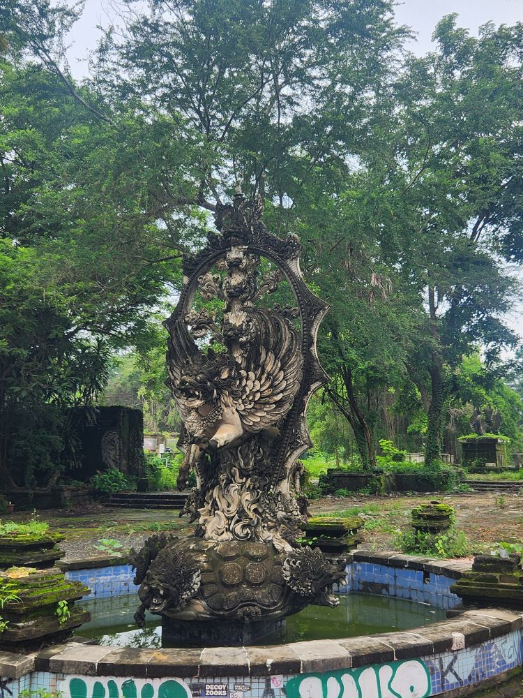 No rain this morning, thankfully, but we take the morning to just sort of loll around a bit, then around 8:30 went out for a Grab to take us to the abandoned Taman Festival Theme Park. You know how we love ghost towns, well this is basically a ghost amusement park! Built in the late 1990’s at an estimated $100 million cost, it was state of the art with the only inverted roller coaster in the world at that time, volcanoes, a live crocodile pit, 3-D theaters, the biggest swimming pool in the world and a $5 million laser show. Opened in 1997, it was never really popular with the locals. The attendance was never very high, and the park never made any money. Then in March 1998, on Friday the 13th of all days, the laser was hit and destroyed by lightening. Insurance wouldn’t pay out, basically dooming the park financially, not to mention that now, in the eyes of the locals, the park was cursed and they really wouldn’t go there. In addition there were some land ownership issues, and then the Asian financial crisis hit. That basically did it for the park, investors left, everyone quit, literally walked off – leaving the crocodiles and everything else! – and the whole thing shut down forever. For the last 25 years the park has remained abandoned and fallen into ruins. The jungle has taken over and so have graffiti artists!!!