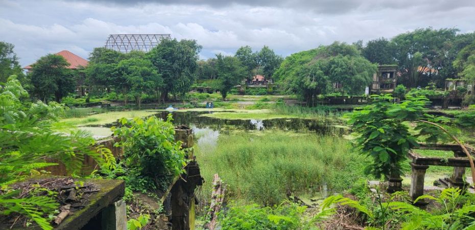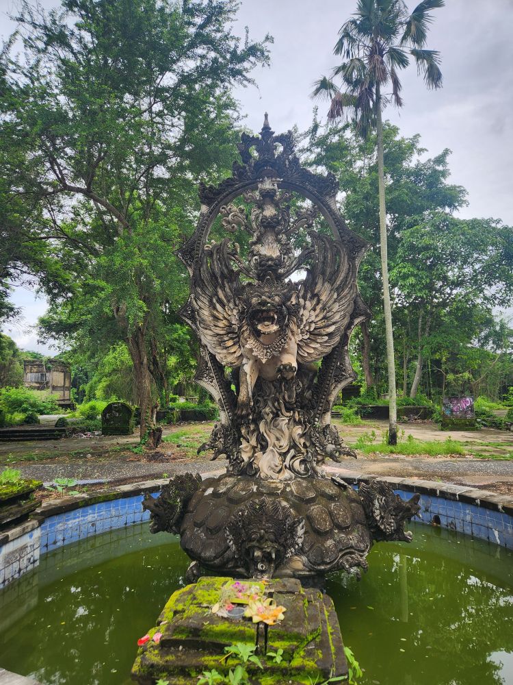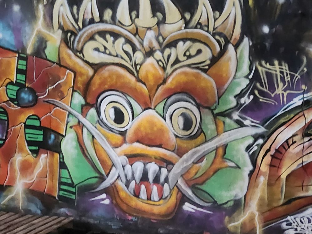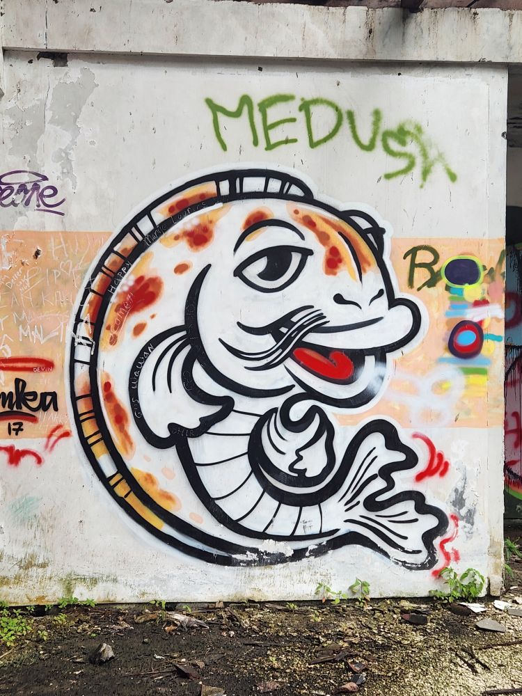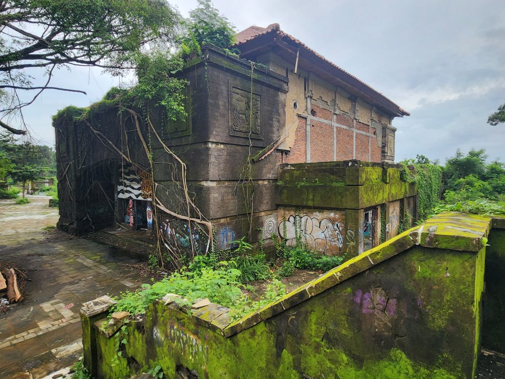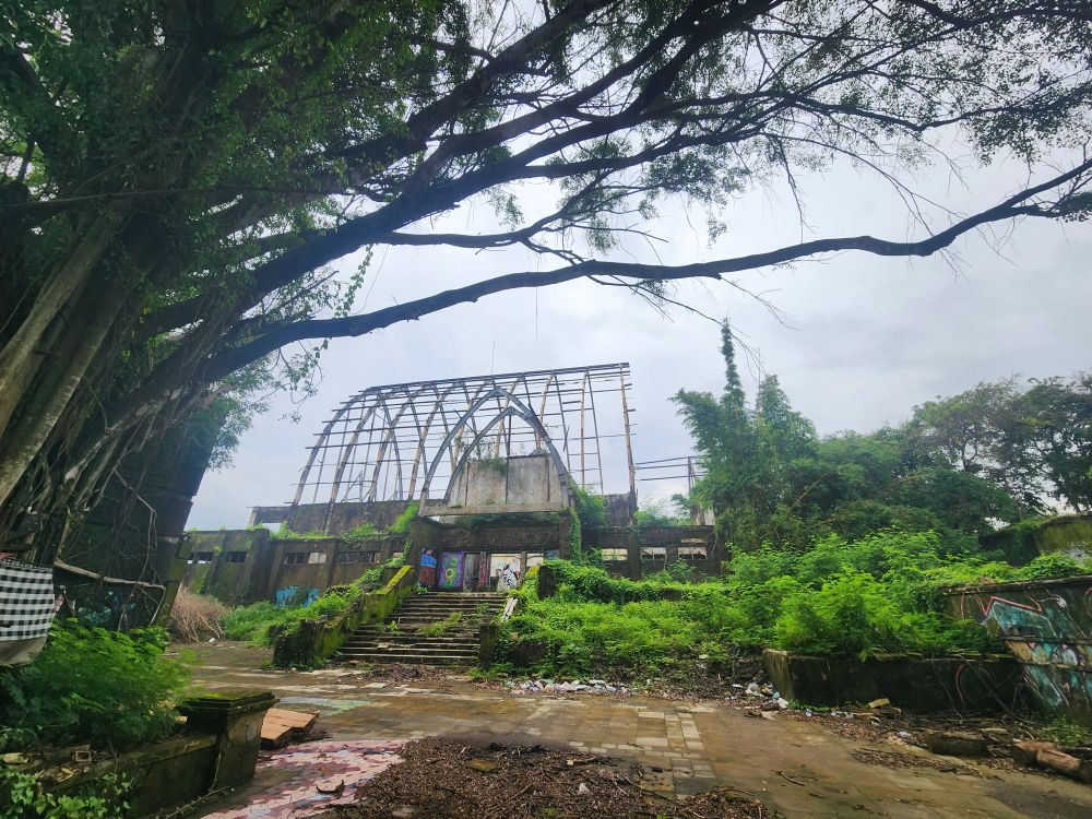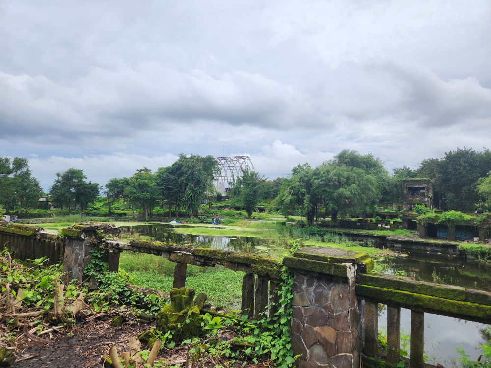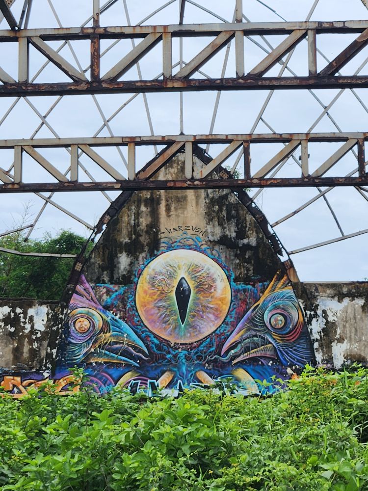 No rain this morning, thankfully, but we take the morning to just sort of loll around a bit, then around 8:30 went out for a Grab to take us to the abandoned Taman Festival Theme Park. You know how we love ghost towns, well this is basically a ghost amusement park! Built in the late 1990’s at an estimated $100 million cost, it was state of the art with the only inverted roller coaster in the world at that time, volcanoes, a live crocodile pit, 3-D theaters, the biggest swimming pool in the world and a $5 million laser show. Opened in 1997, it was never really popular with the locals. The attendance was never very high, and the park never made any money. Then in March 1998, on Friday the 13th of all days, the laser was hit and destroyed by lightening. Insurance wouldn’t pay out, basically dooming the park financially, not to mention that now, in the eyes of the locals, the park was cursed and they really wouldn’t go there. In addition there were some land ownership issues, and then the Asian financial crisis hit. That basically did it for the park, investors left, everyone quit, literally walked off – leaving the crocodiles and everything else! – and the whole thing shut down forever. For the last 25 years the park has remained abandoned and fallen into ruins. The jungle has taken over and so have graffiti artists!!!