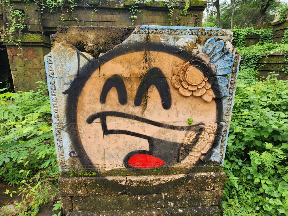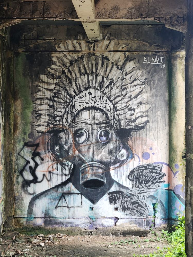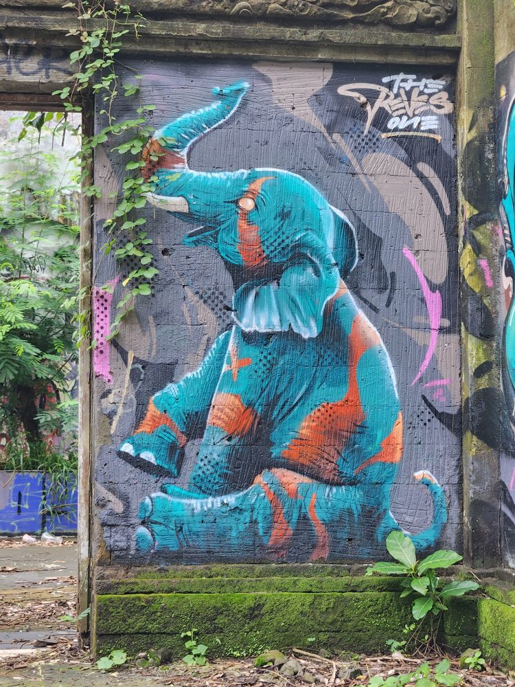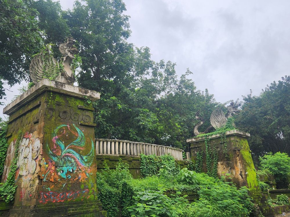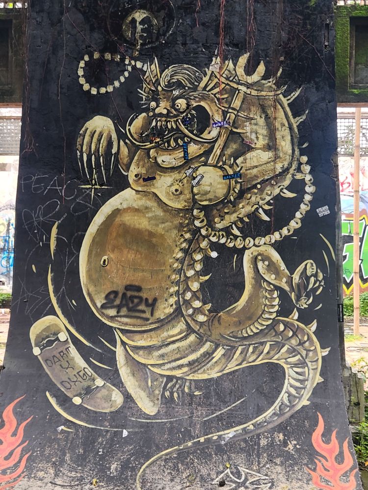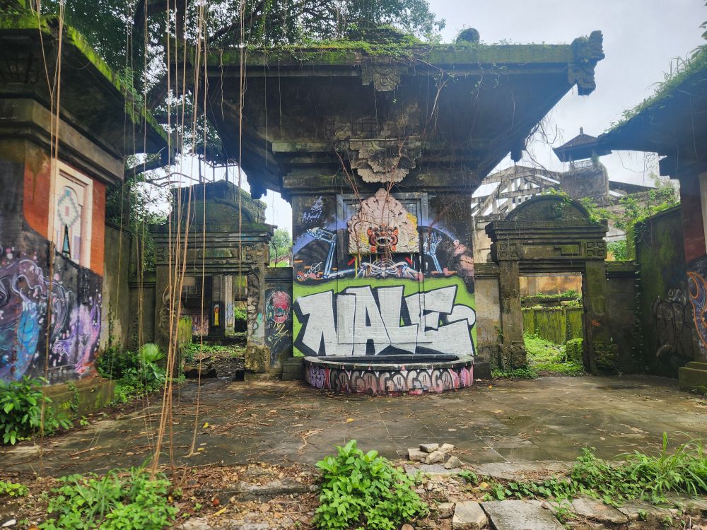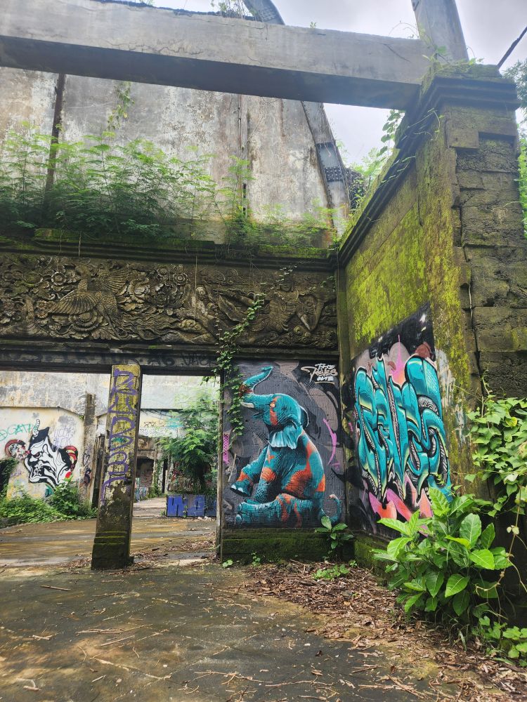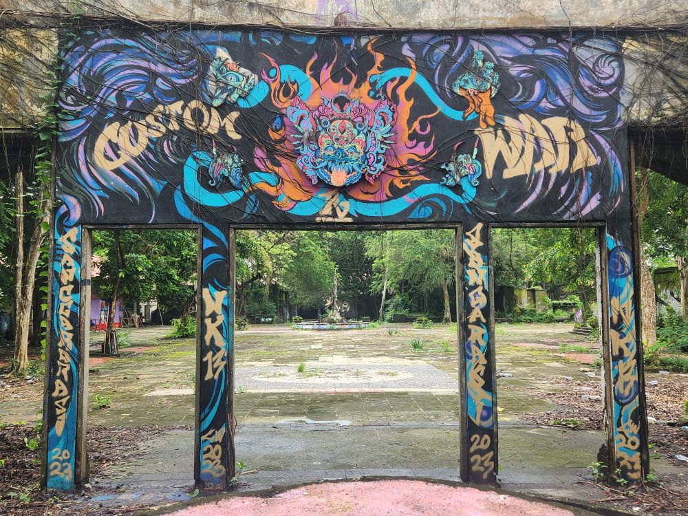 Behind us are a couple of Naga statues up on the upper terrace, by the entrance and defunct fountain, and off to our left is another huge pavilion that just begs to be explored. Heading over, we pass more gas mask graffiti – obviously a thing – painted statues, tiled squares, overgrown banyon trees and more and more graffiti in some building of which we no idea its purpose.
