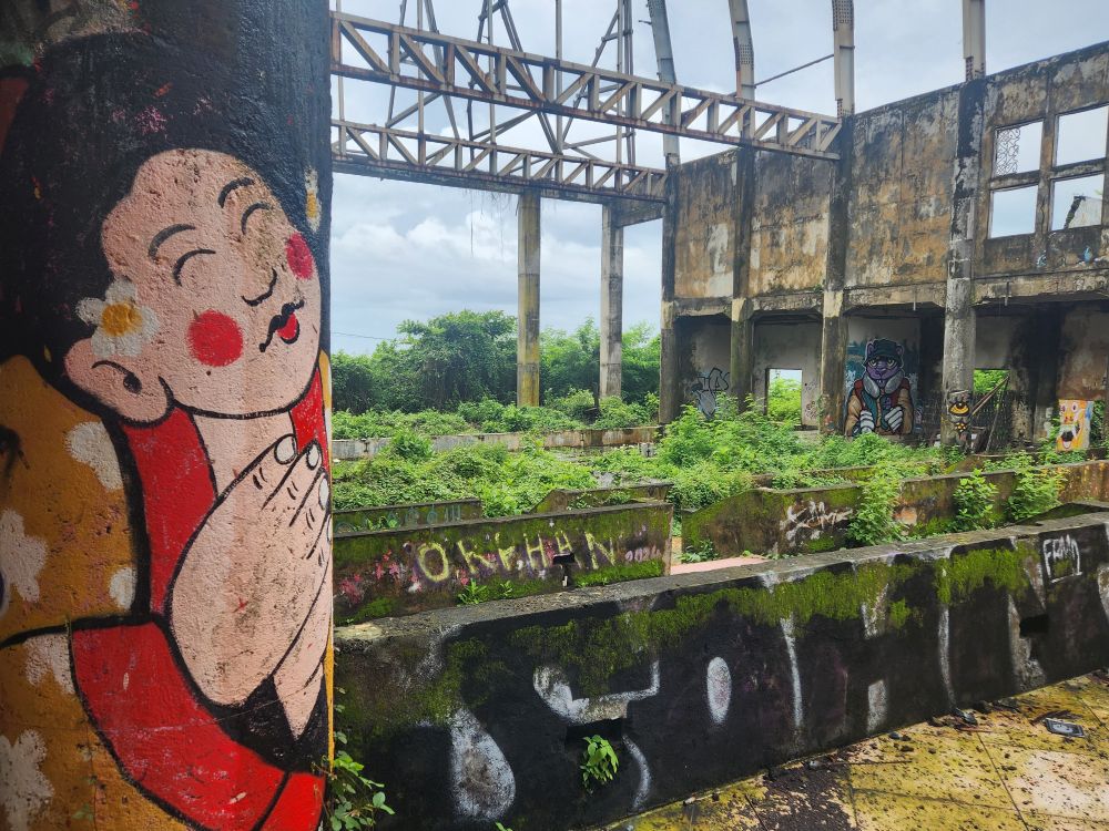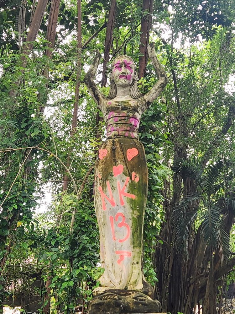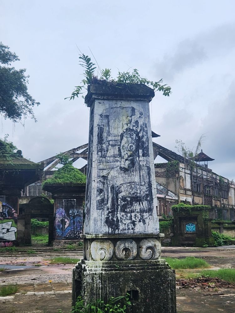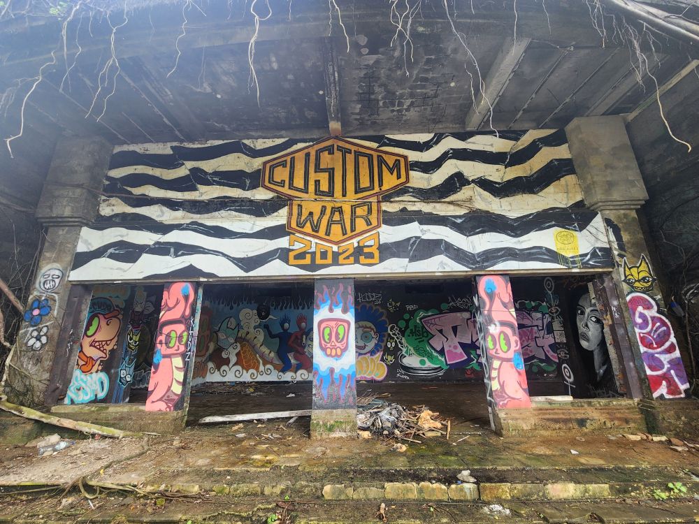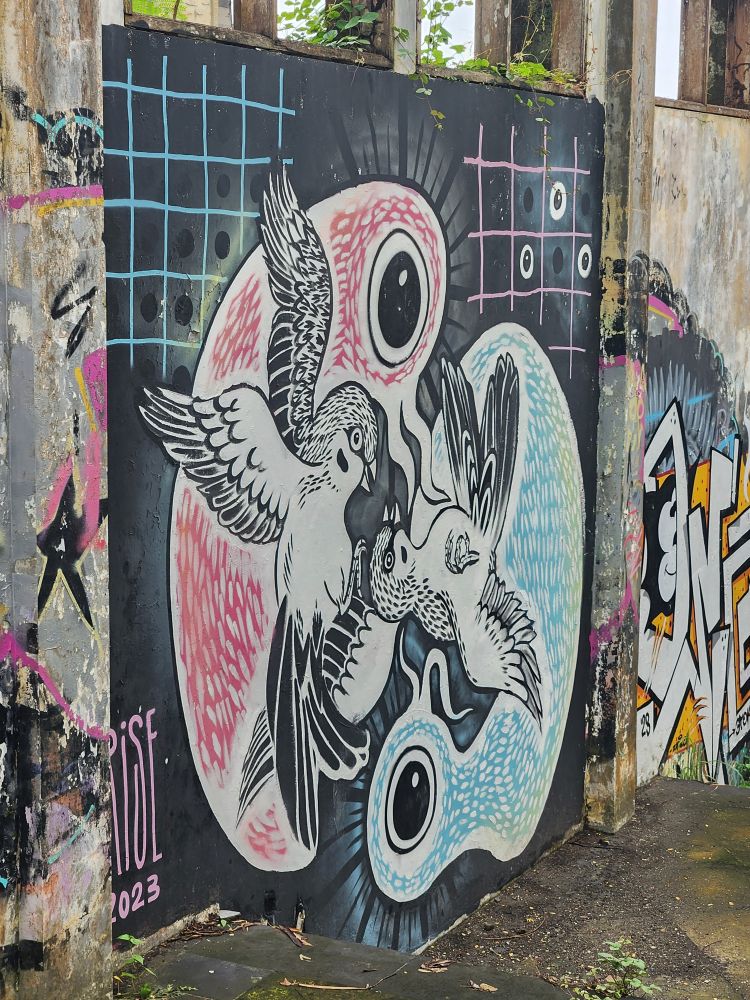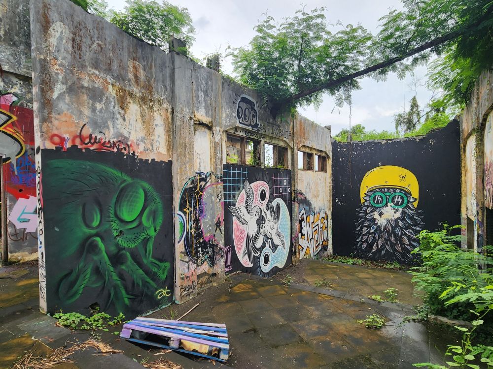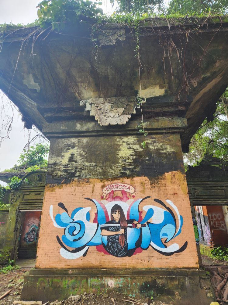 Behind us are a couple of Naga statues up on the upper terrace, by the entrance and defunct fountain, and off to our left is another huge pavilion that just begs to be explored. Heading over, we pass more gas mask graffiti – obviously a thing – painted statues, tiled squares, overgrown banyon trees and more and more graffiti in some building of which we no idea its purpose.