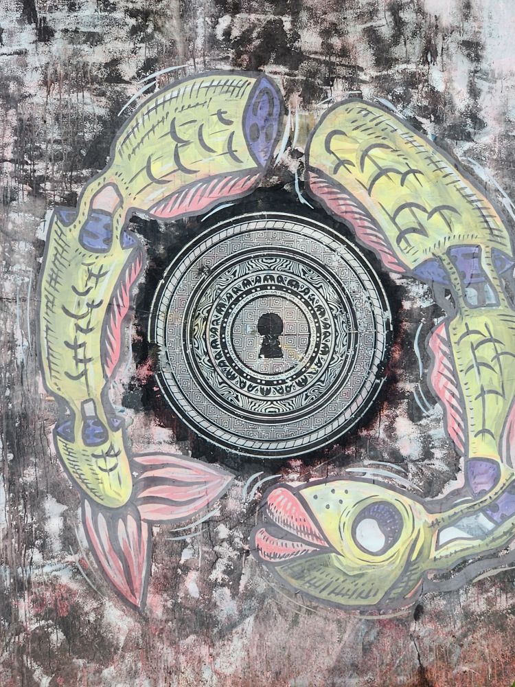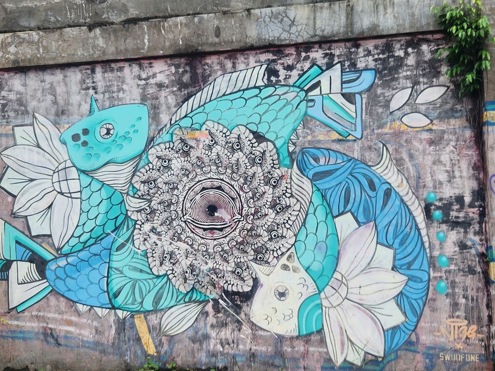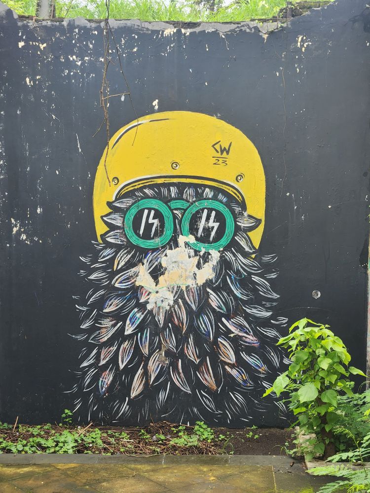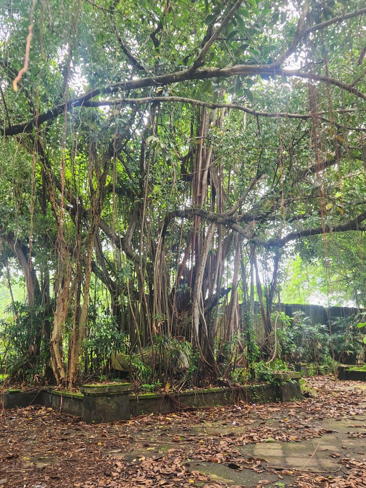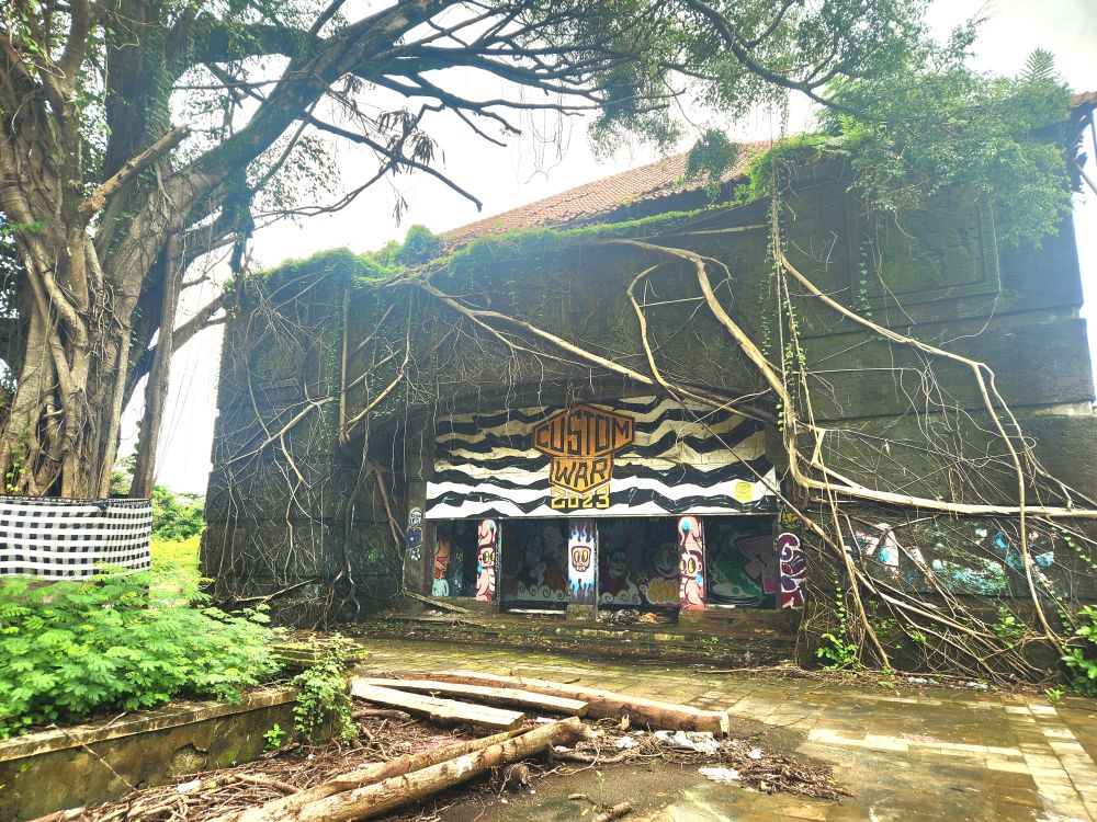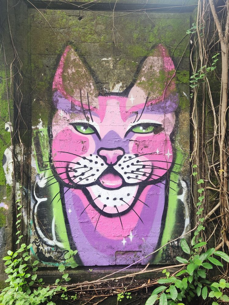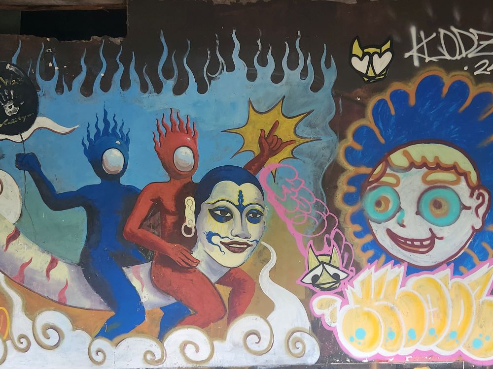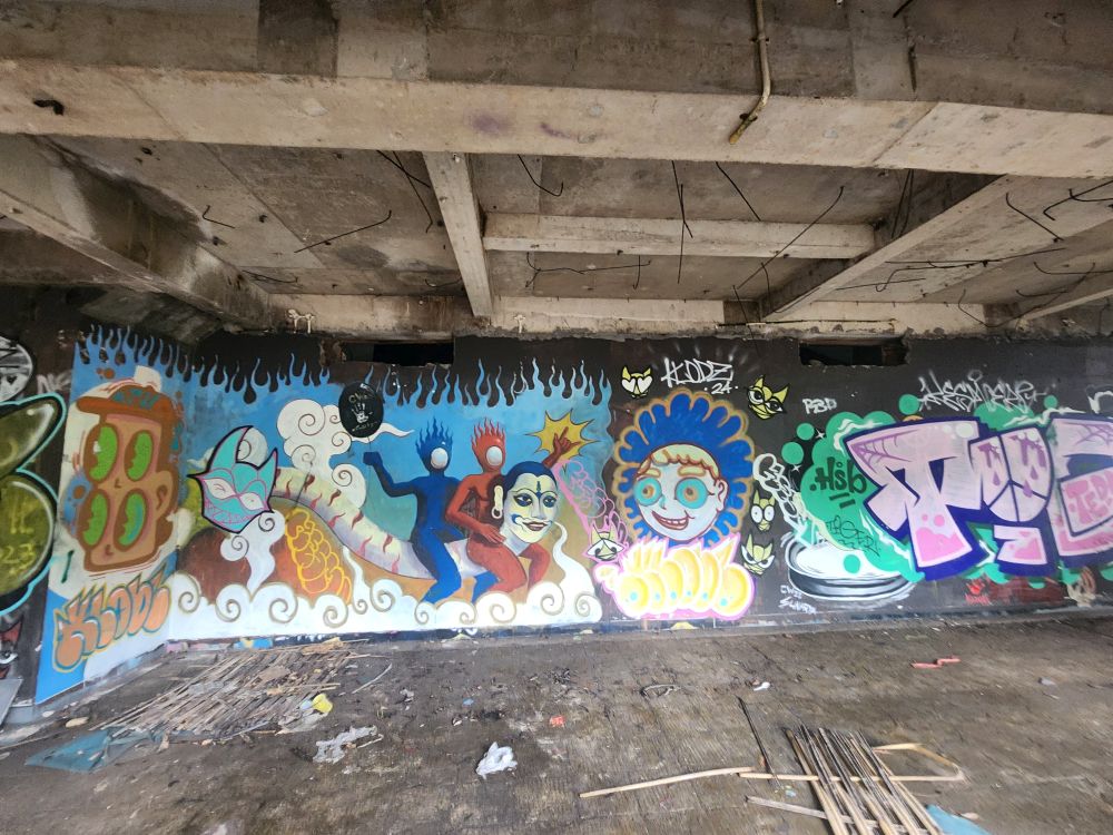 Behind us are a couple of Naga statues up on the upper terrace, by the entrance and defunct fountain, and off to our left is another huge pavilion that just begs to be explored. Heading over, we pass more gas mask graffiti – obviously a thing – painted statues, tiled squares, overgrown banyon trees and more and more graffiti in some building of which we no idea its purpose.