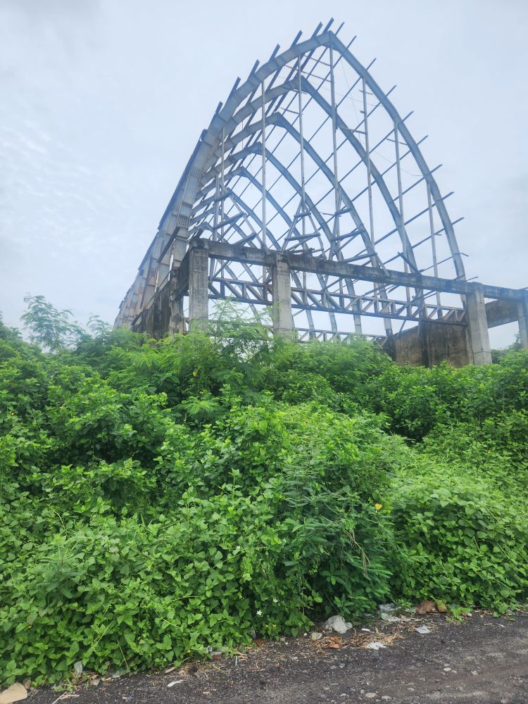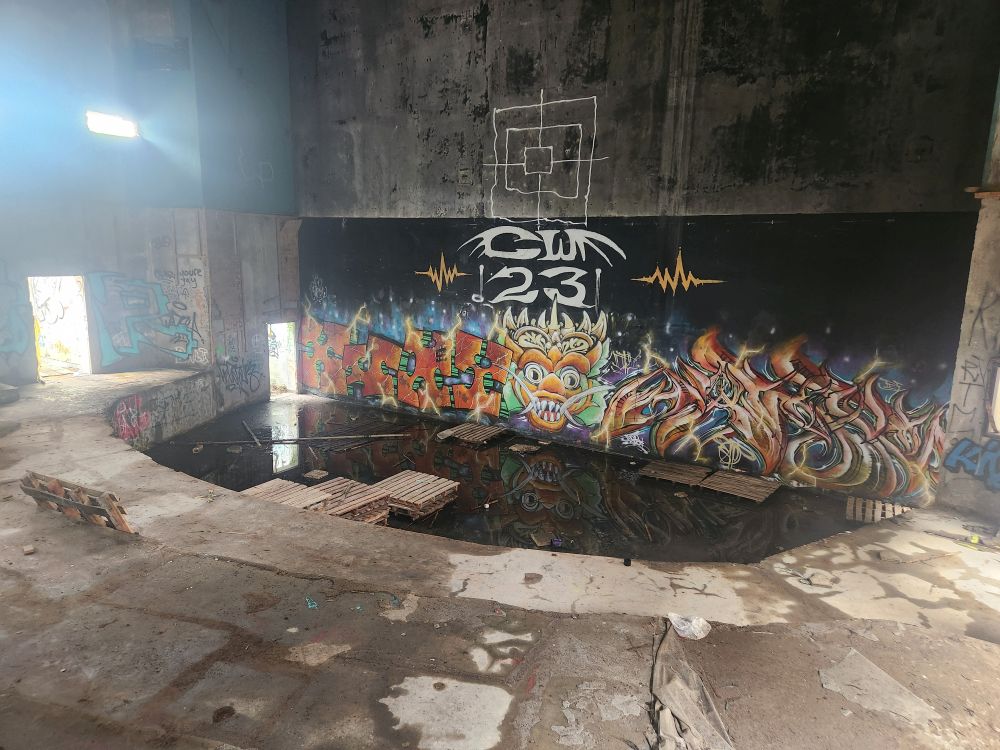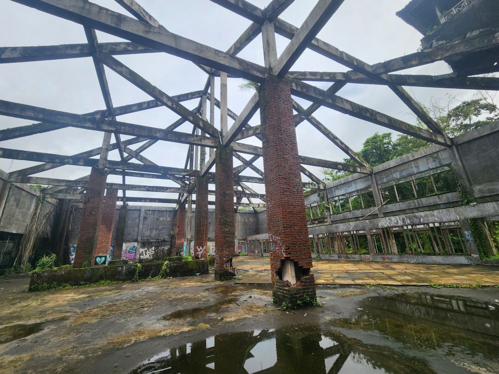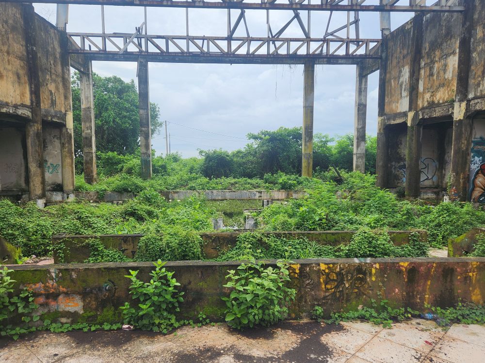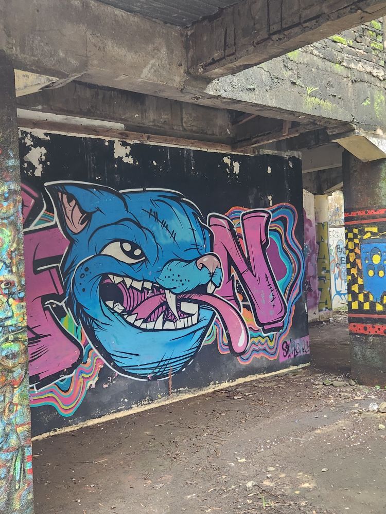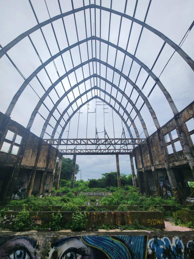 Another massive pavilion – again who knows its use??? – more graffiti, more roots and overgrown foliage, plus a falling down roof structure.
