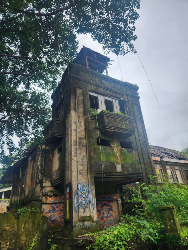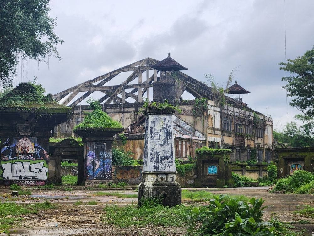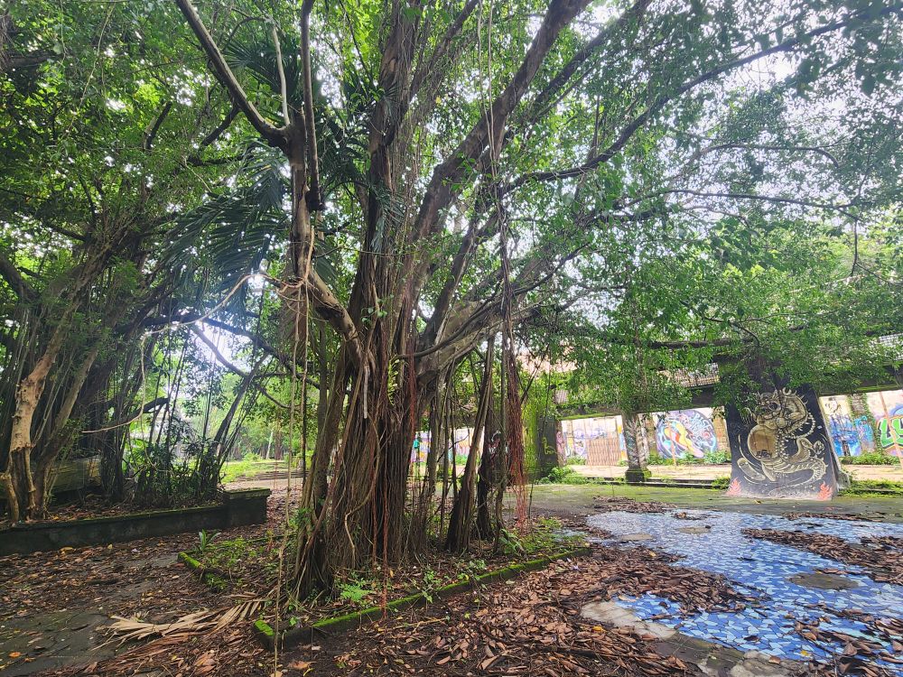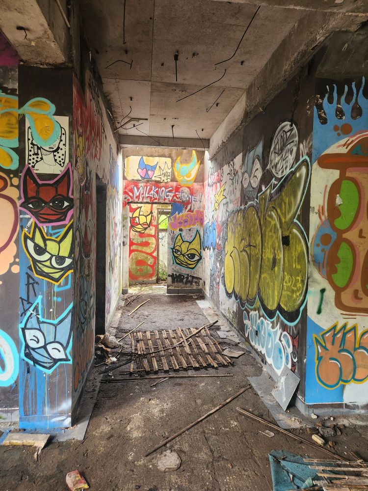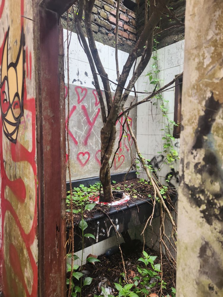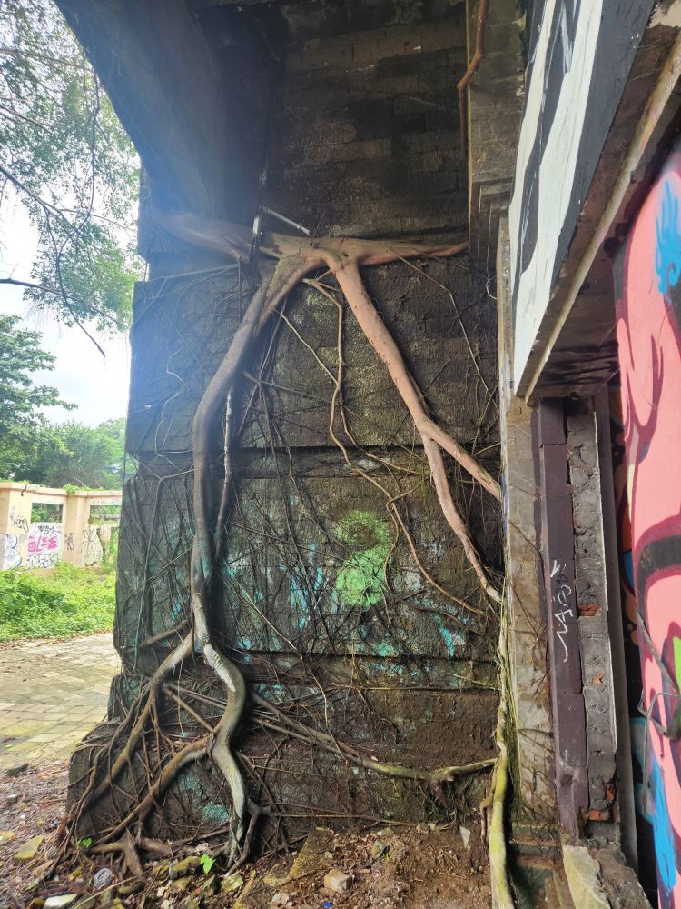 Wandering out of the atrium building, we pass by the theater building, overgrown with huge roots running down the walls, and again graffiti, graffiti everywhere.