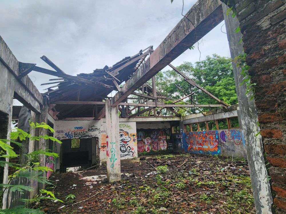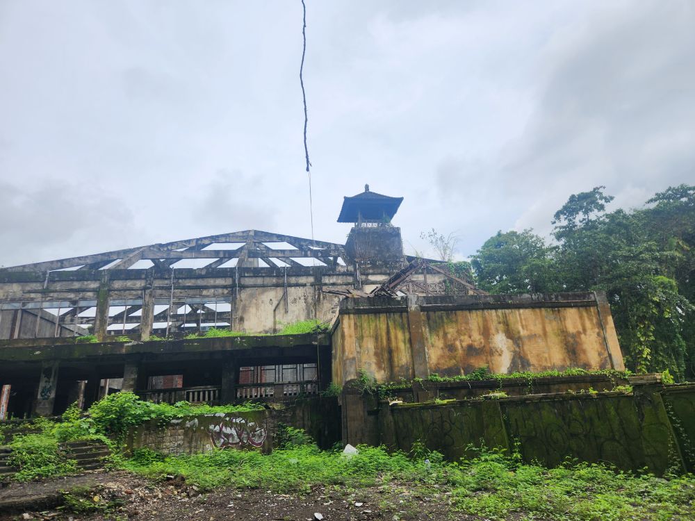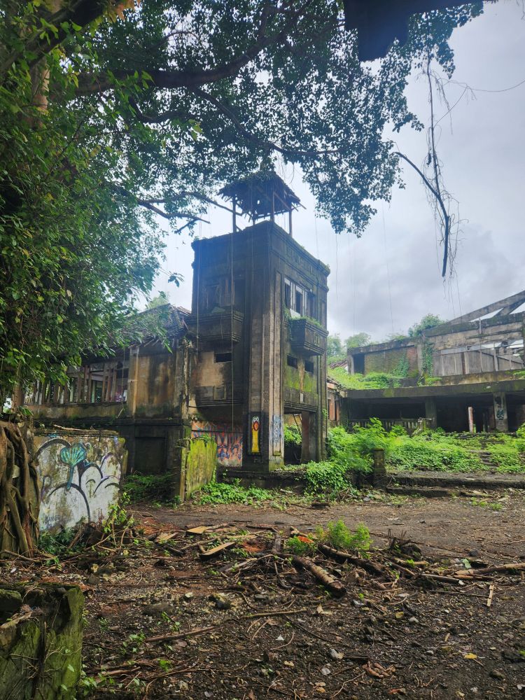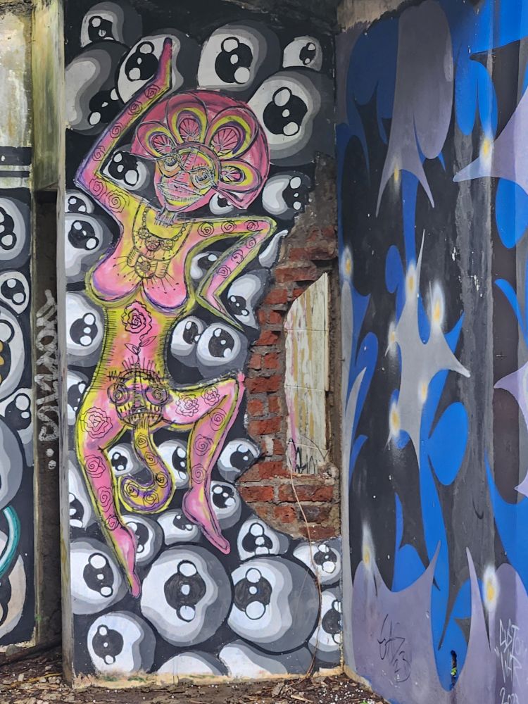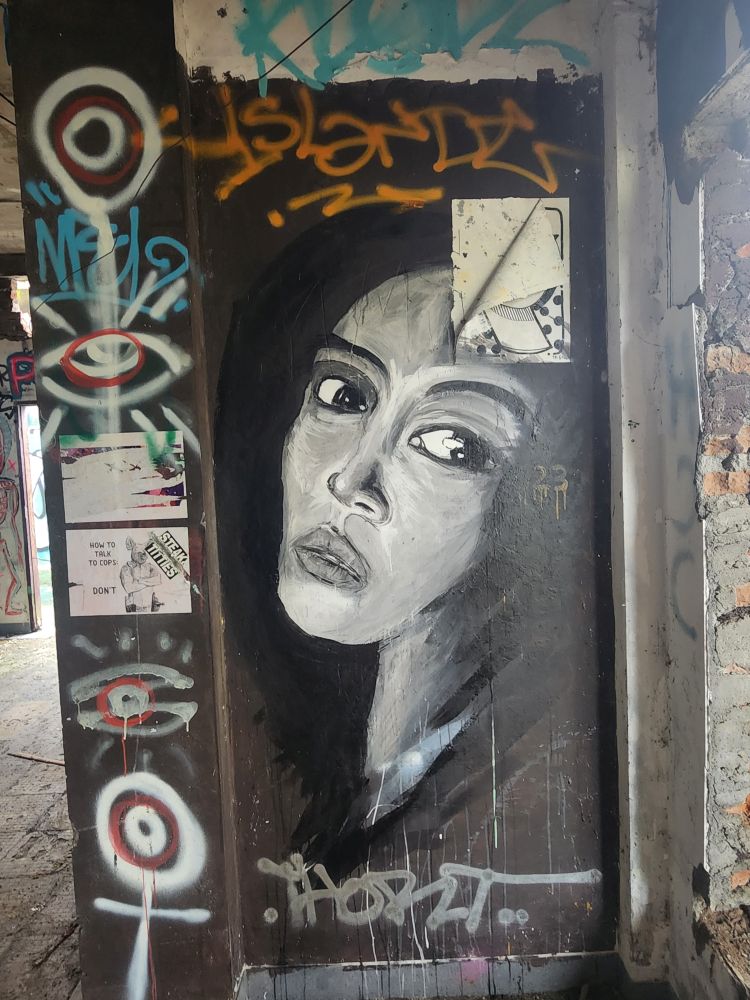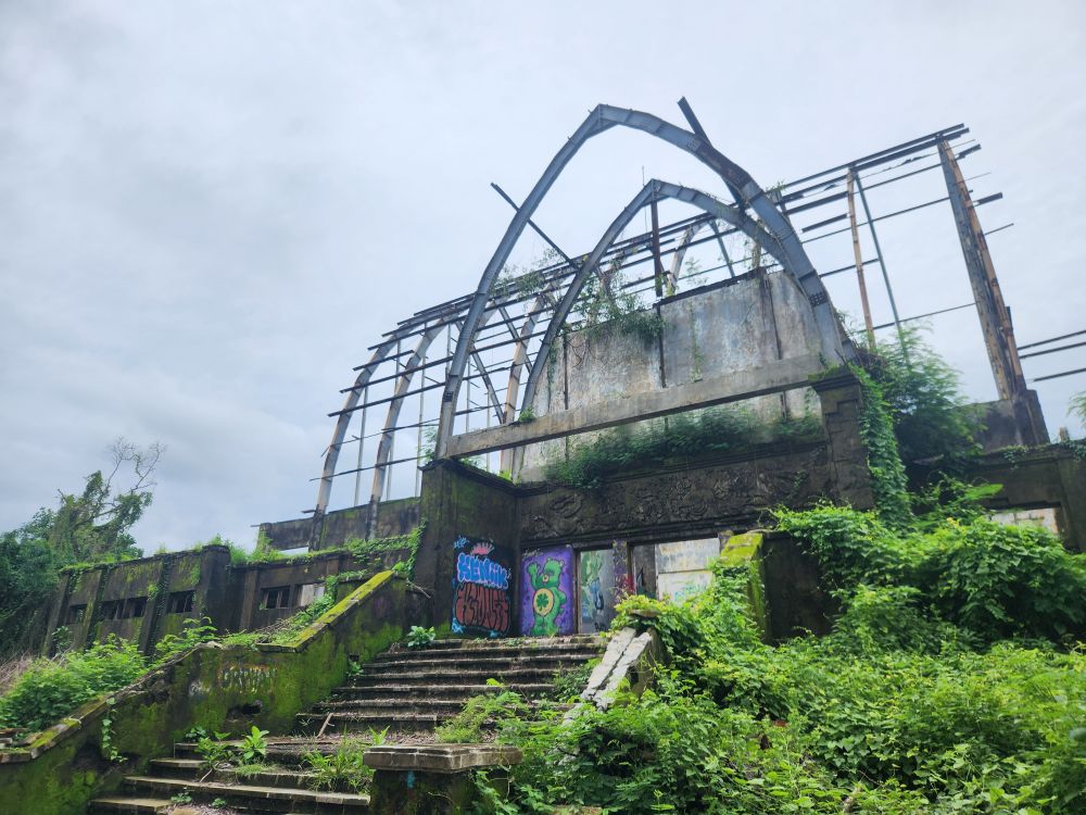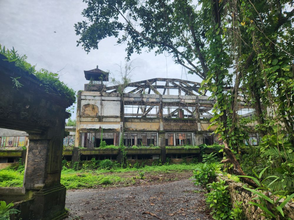 Wandering out of the atrium building, we pass by the theater building, overgrown with huge roots running down the walls, and again graffiti, graffiti everywhere.