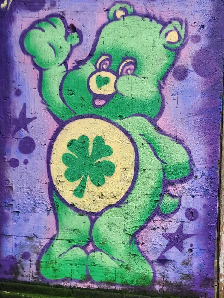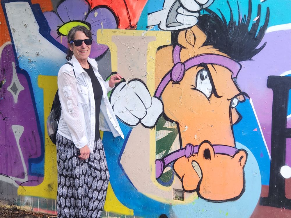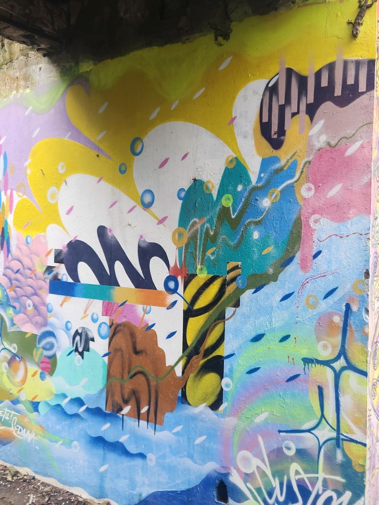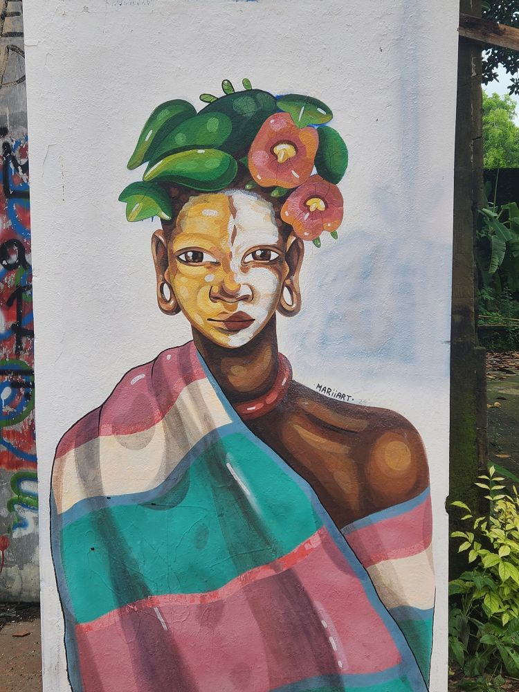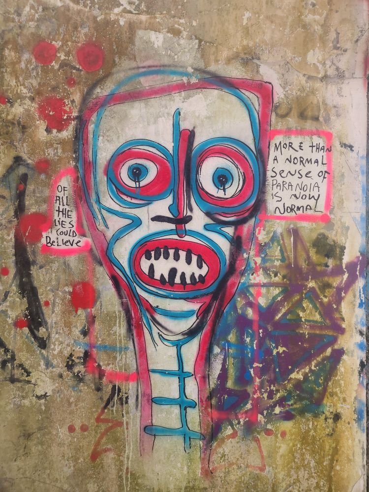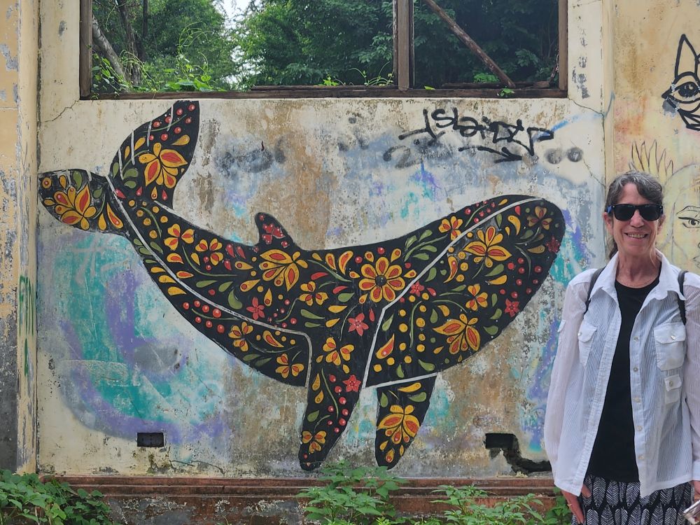 Wandering out of the atrium building, we pass by the theater building, overgrown with huge roots running down the walls, and again graffiti, graffiti everywhere.