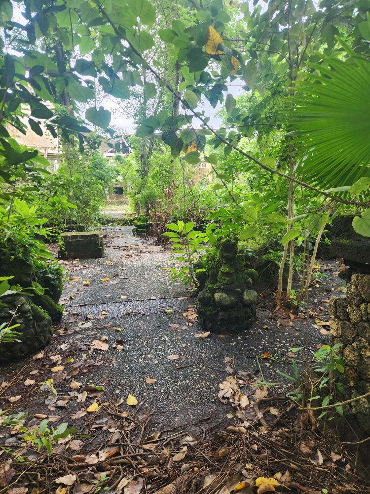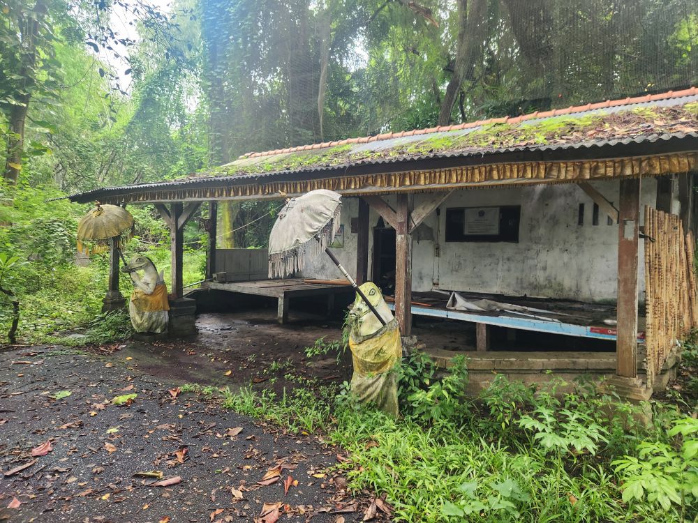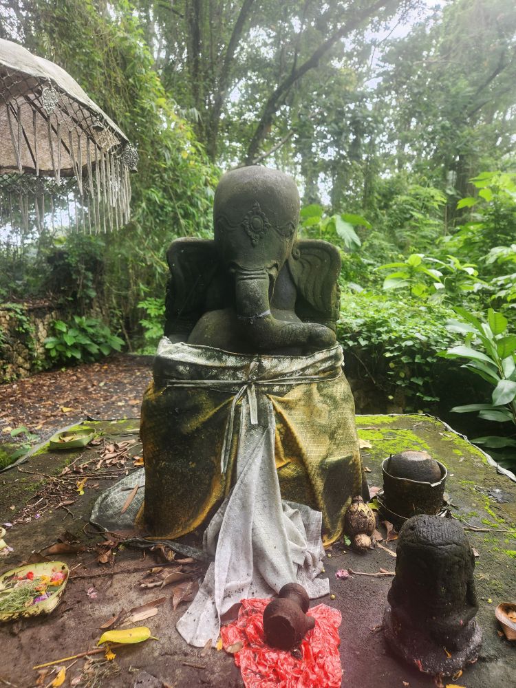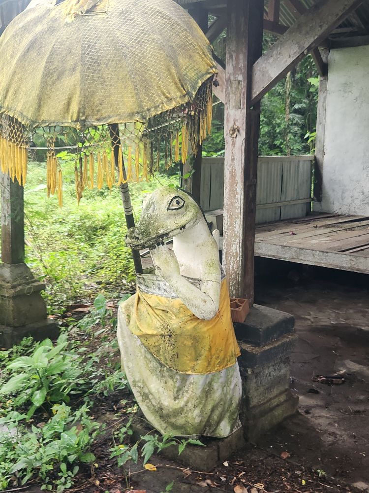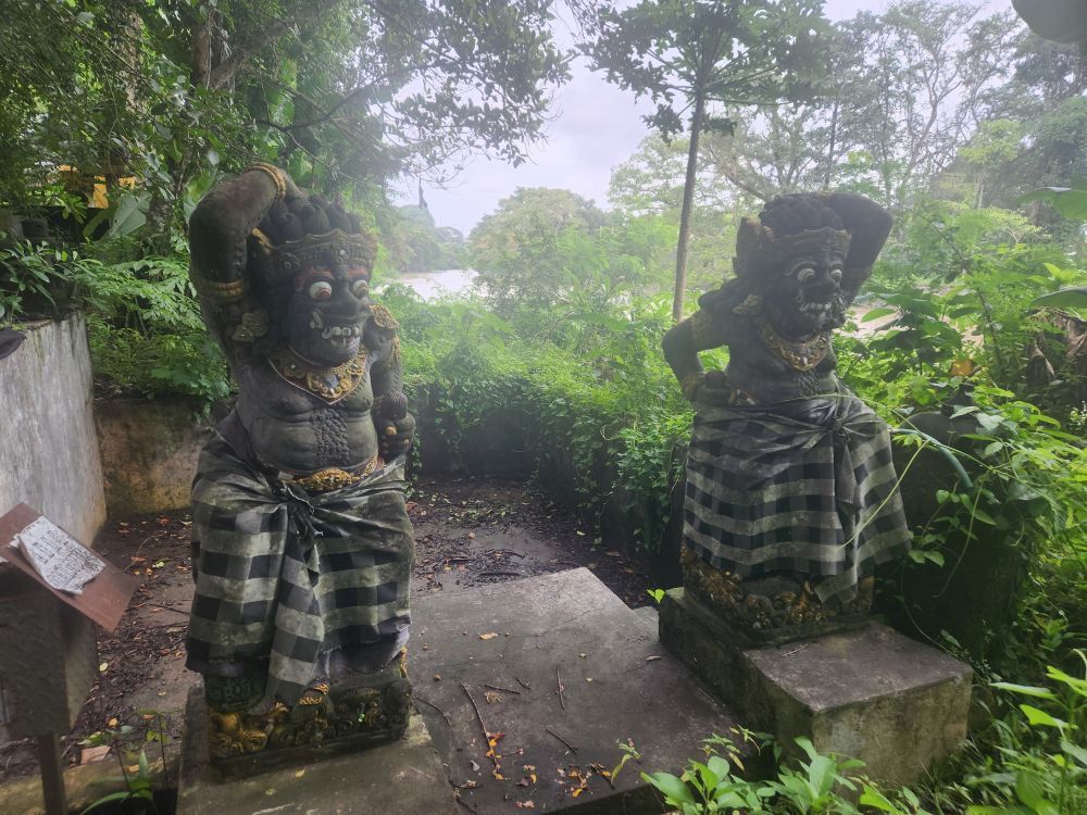 The winding path leads to the river as well as an active temple, the Parahyangan or Twin Pole Temple, where we have read some locals still hold ceremonies. The icons are all dressed in the traditional sarongs, and the lanterns and other tall penjors – those umbrella looking structures on top of tall bamboo poles used in Bali celebrations are strewn around as well.