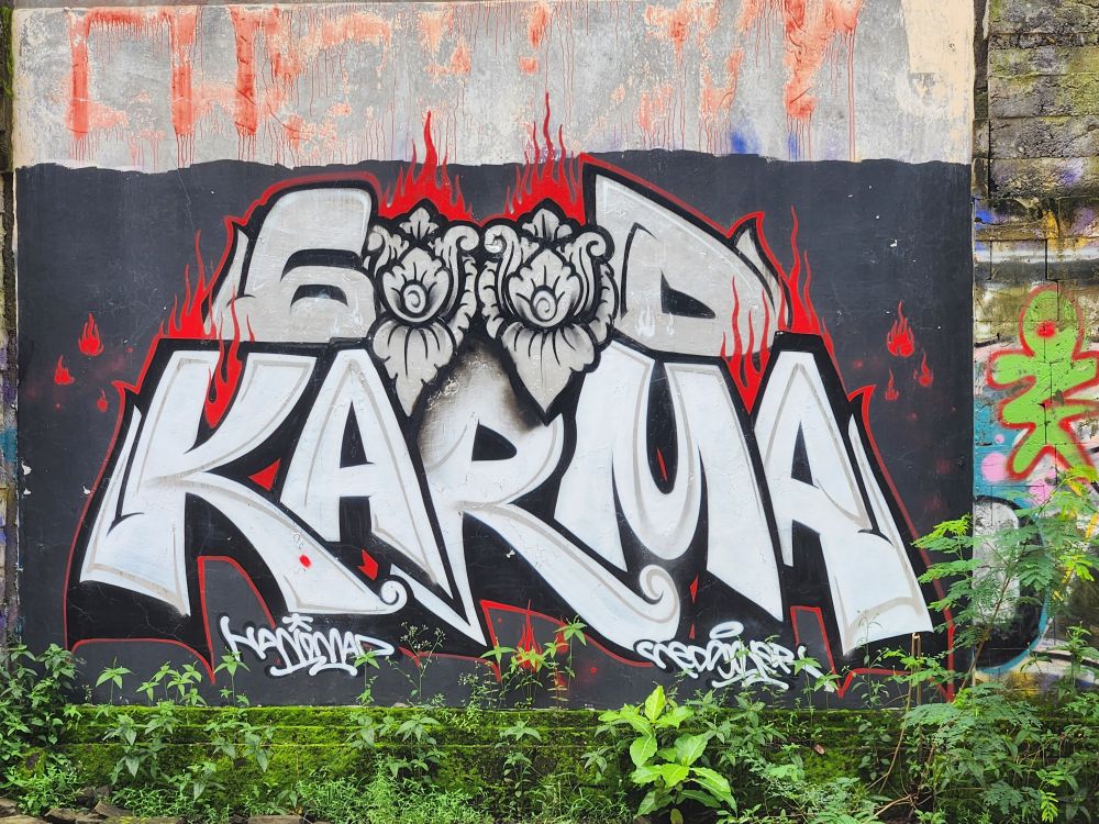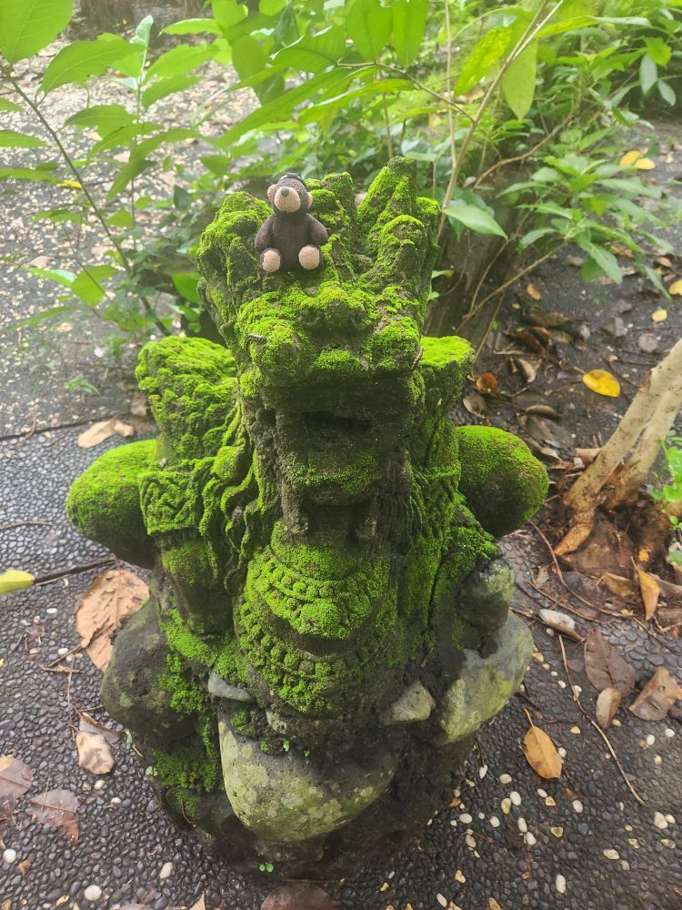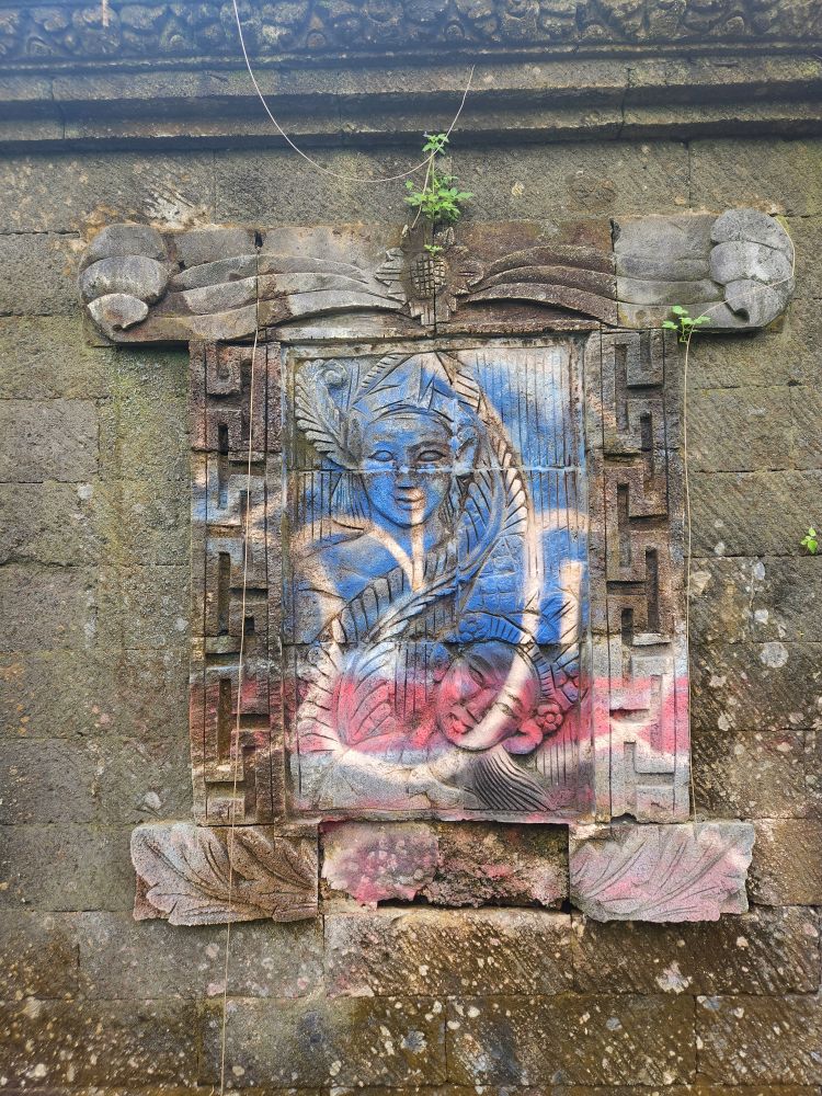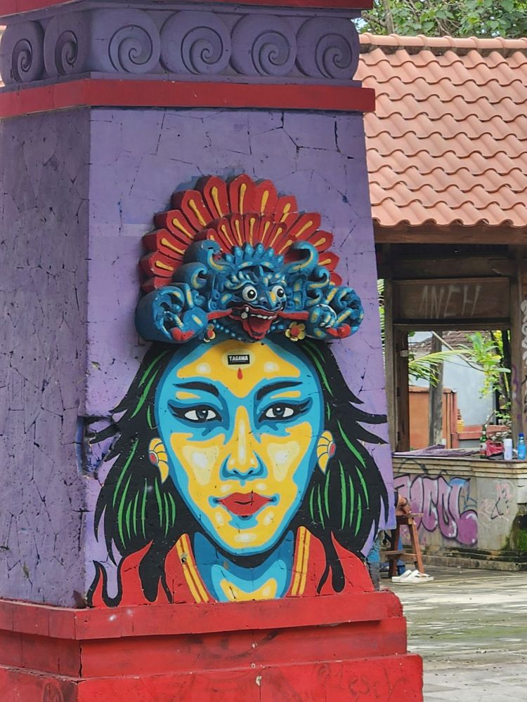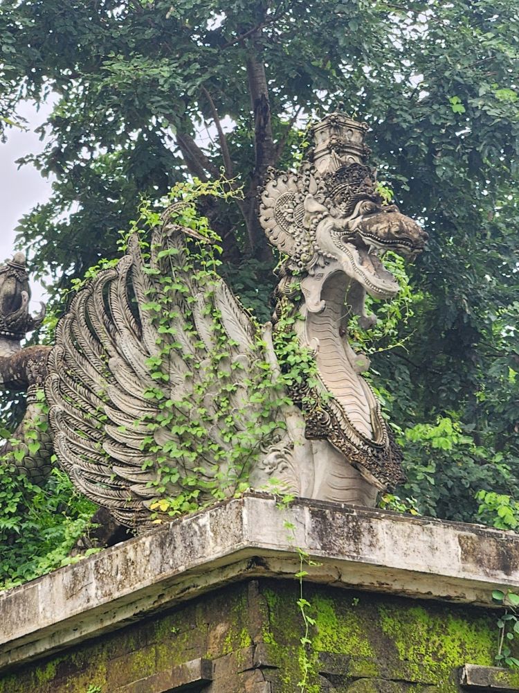 The winding path leads to the river as well as an active temple, the Parahyangan or Twin Pole Temple, where we have read some locals still hold ceremonies. The icons are all dressed in the traditional sarongs, and the lanterns and other tall penjors – those umbrella looking structures on top of tall bamboo poles used in Bali celebrations are strewn around as well.