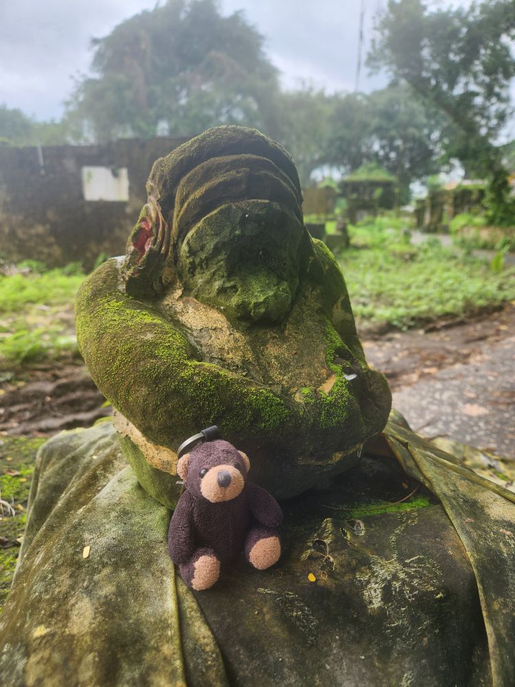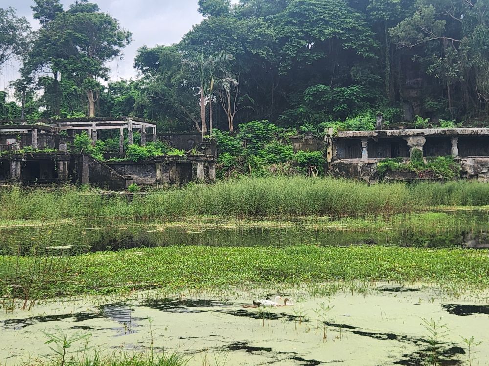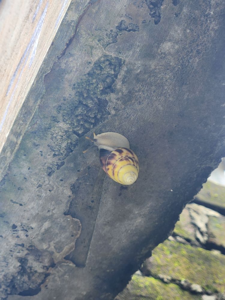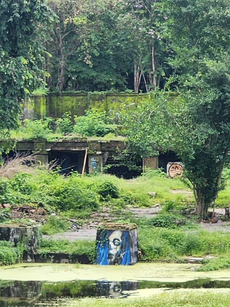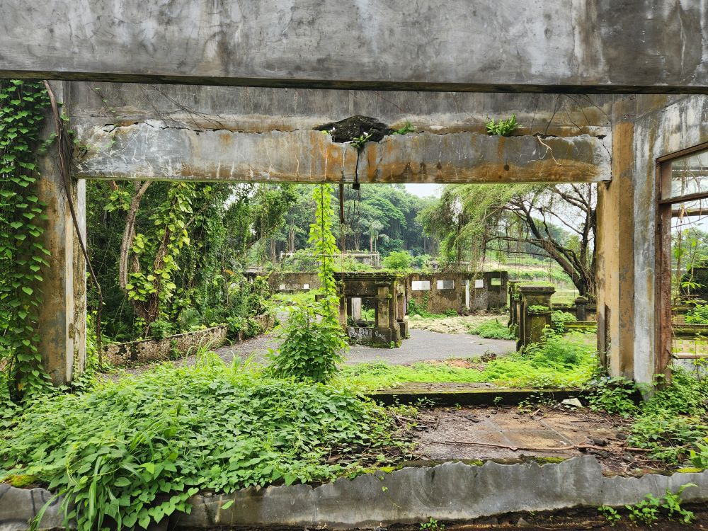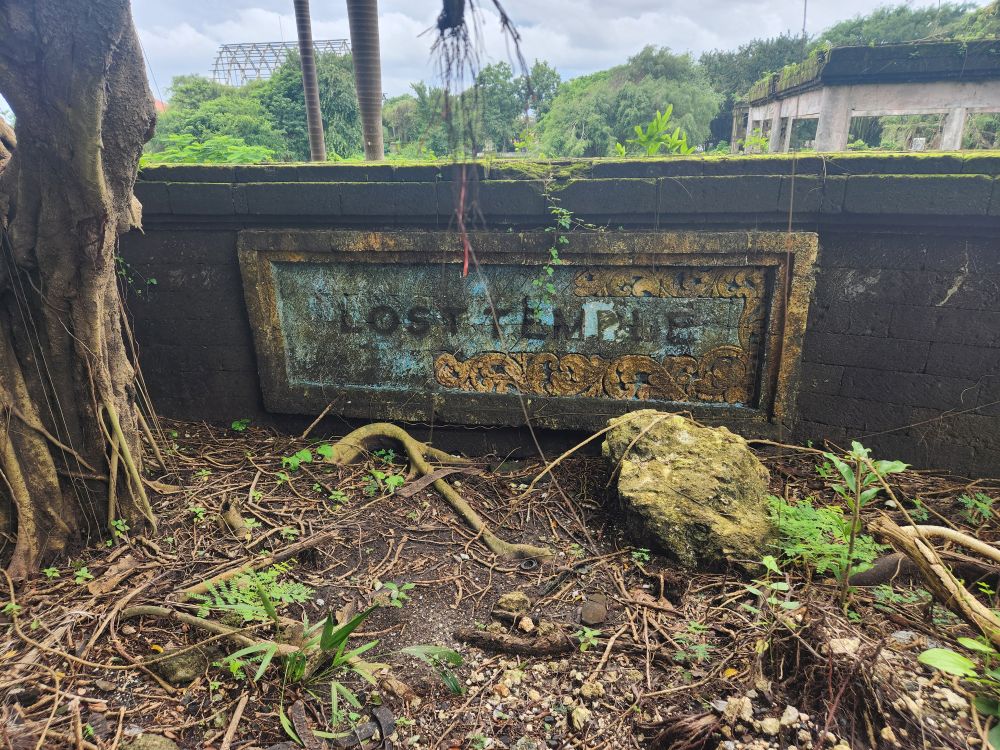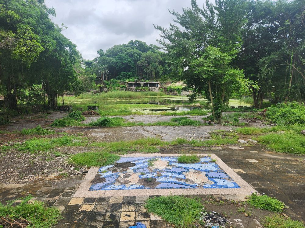 Circling back to the mountain, we circumnavigate it from the other side, where there is actually a sign for the Lost Temple! See, it is the Raiders of the Lost Ark!!! As well as some great long views across the lagoon to the falling down atrium building. Inside the shell of some pavilion on the edge of the lagoon, we find more park inhabitants – snails! And fortunately, besides the mosquitoes (why we are covered from head to toe), nothing more exciting from an insect/animal perspective.