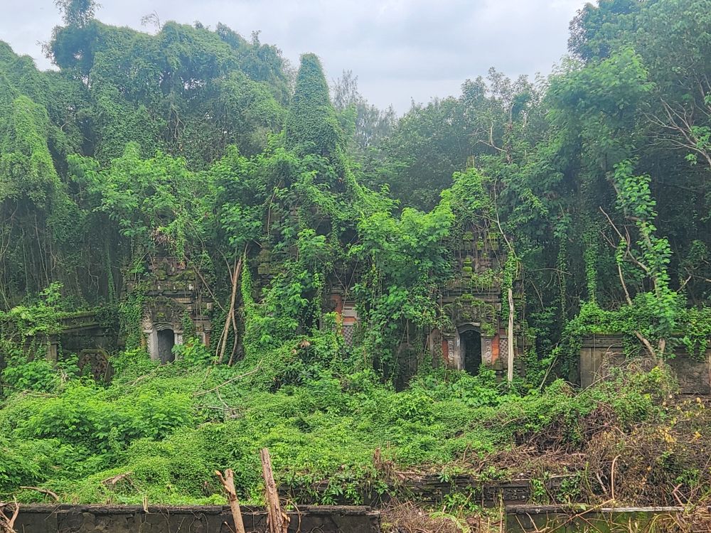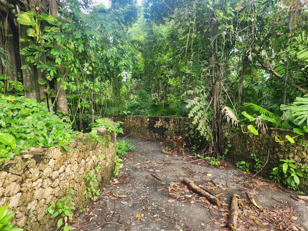 Back on the “main” path, we start uphill toward the artificial mountain, looking awfully real these days with all the overgrown trees and shrub. Around the back of the mountain is a totally overgrown temple – looking like the Lost Ark of Raiders fame – With a viewing area and signs all over telling you not to go down there. Yeah, we’re not even thinking about it. There is way too much jungle out there – and we’ve successfully avoided anything that resembles a snake so far – we want to keep that record going!