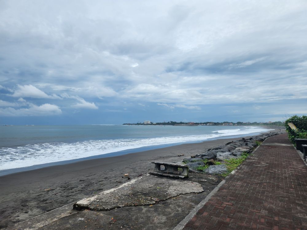 Finally out of the festival grounds, we can now take off our overshirts and jackets. Phew. That was a relief! Then decide to walk down the beach promenade walk for a bit, which gives us a great perspective on the festival grounds from the ocean side. When we were inside the grounds, you could hear the waves crashing against the shoreline, but you couldn’t see how close you were to the beach because of the overgrown jungle. Now you can see just how close the festival grounds come – they’re right there by the beach lane. Close enough to see the graffiti at the apex of the atrium – something we didn’t clearly see when we were inside. Fun.