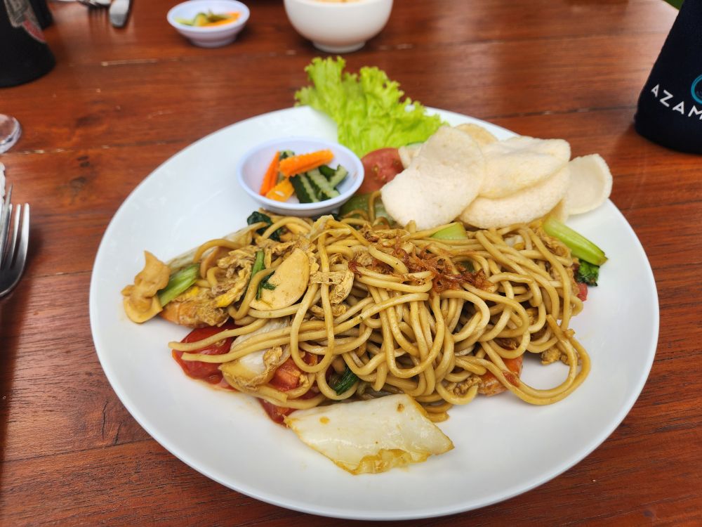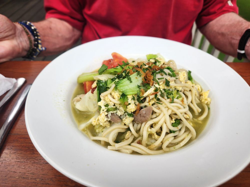 For our “main” meal, I ordered the Mie Goreng Seafood – excellent! Little fish balls, which were actually sliced thin like little compressed fish baloney slivers or something, a couple of really nice shrimp, some squid and tons of excellent noodles as well as sauce. Ed ordered the Mie Godog Jawa, thick egg noodles in a broth with meatballs. Both so great – and so filling! Dinner will be hard to come by tonight!