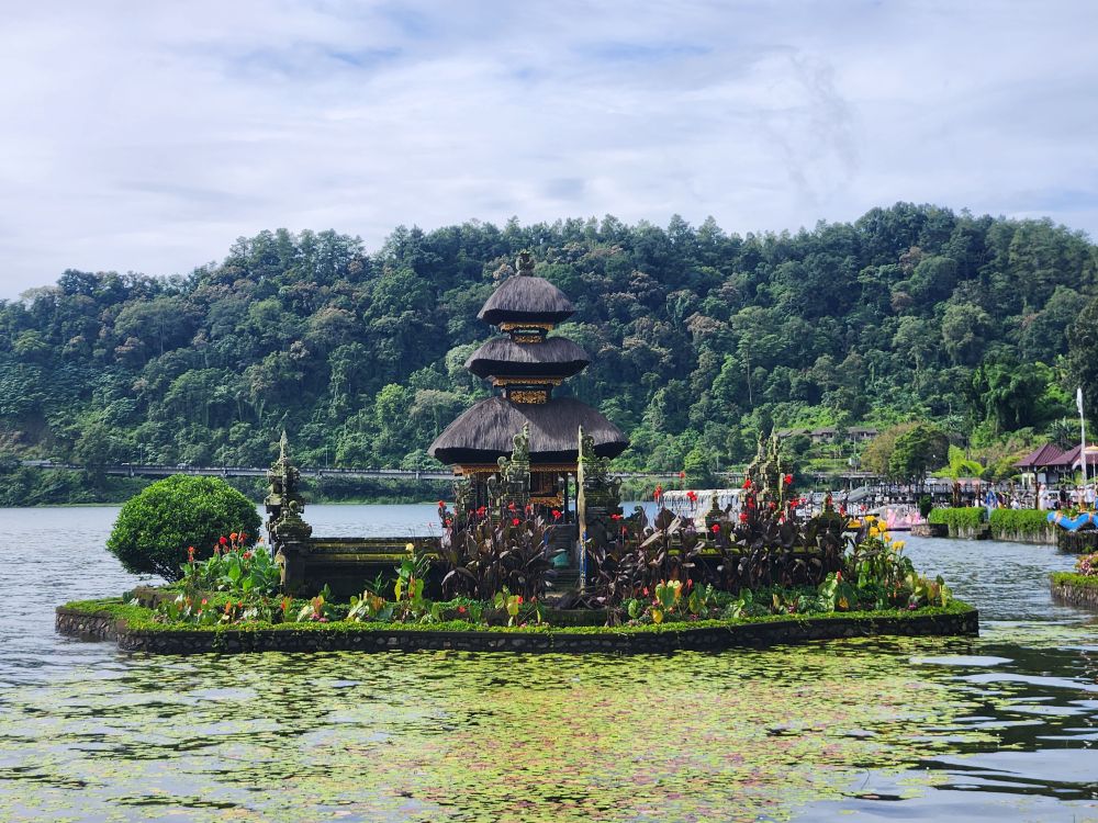 Once we are through the mountains, Lake Beratan appears in front of us. The second largest lake in Bali, it is the source of irrigation across the entire Bedugal Village here in the mountain valley. The lake was at one time the largest lake in Bali until a huge earthquake occurred, splitting the lake into 3 sections: Beratan, Buyan and Tamblingan.