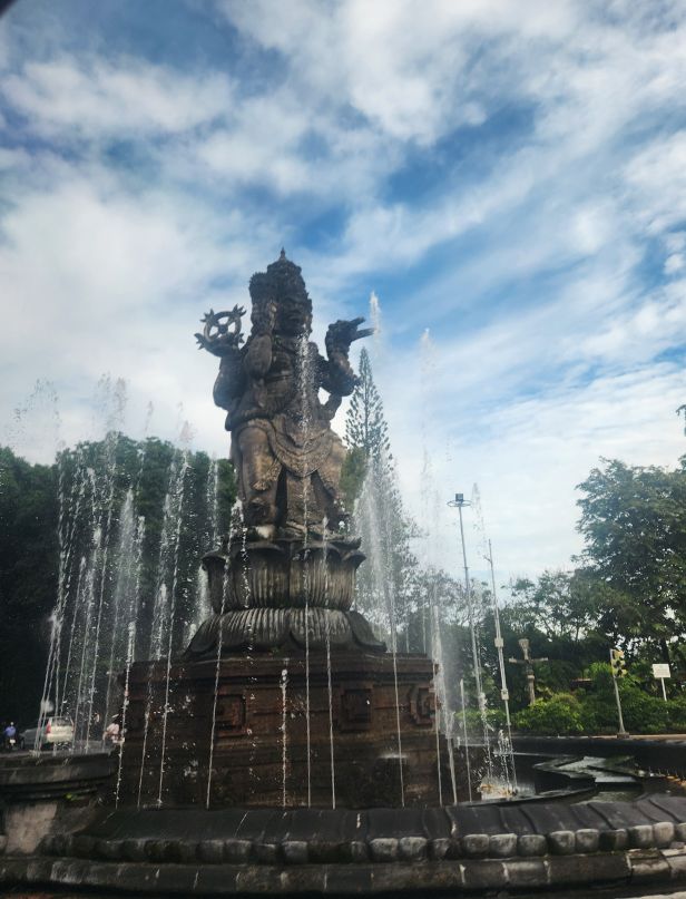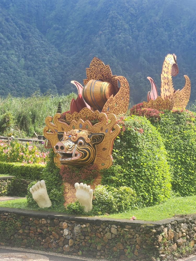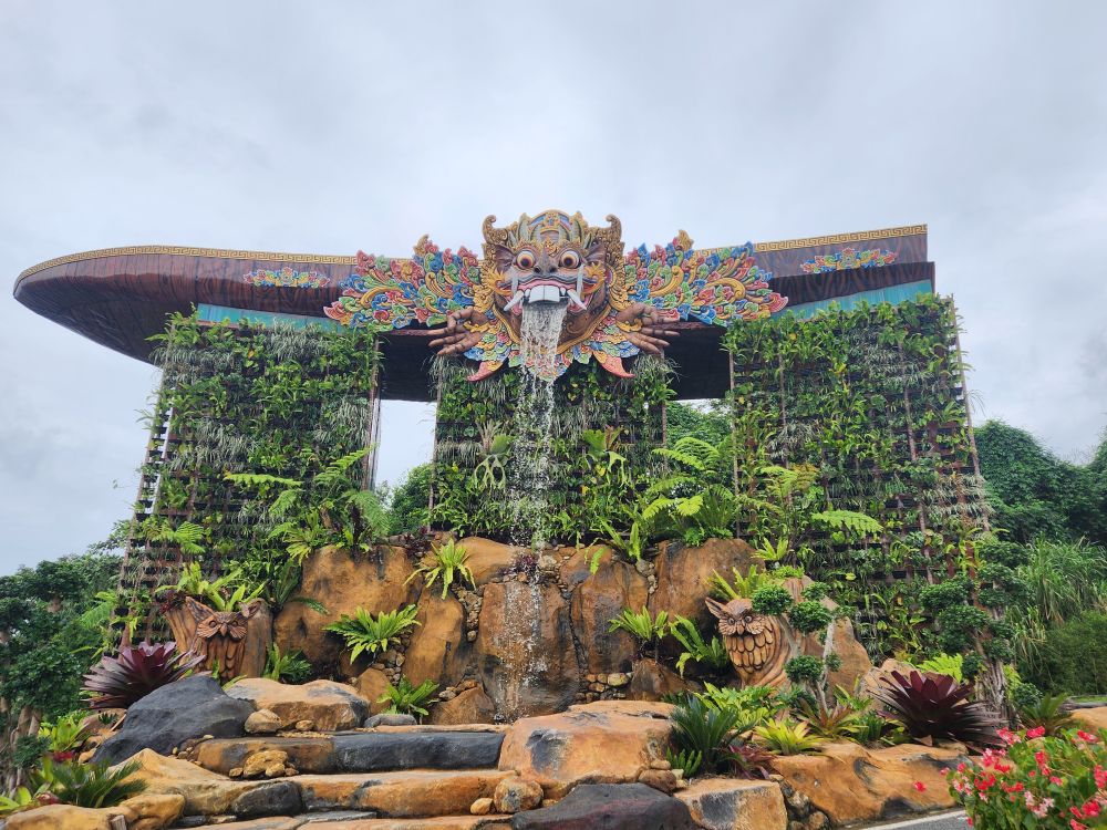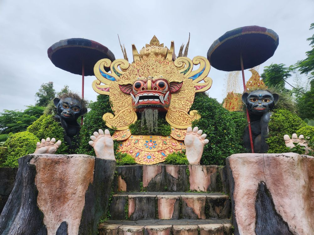 At the top of the hill there is an amazing waterfall that resembles the Marina Bay Sands hotel in Singapore – at least the superstructure does. The Barong whose mouth makes the waterfall is a bit of an exaggeration of the Singaporean lion though. But still, pretty fun and a great representation.