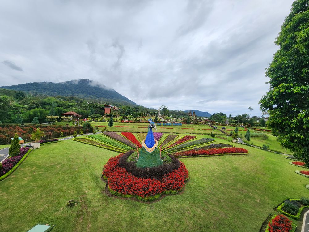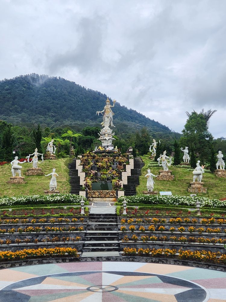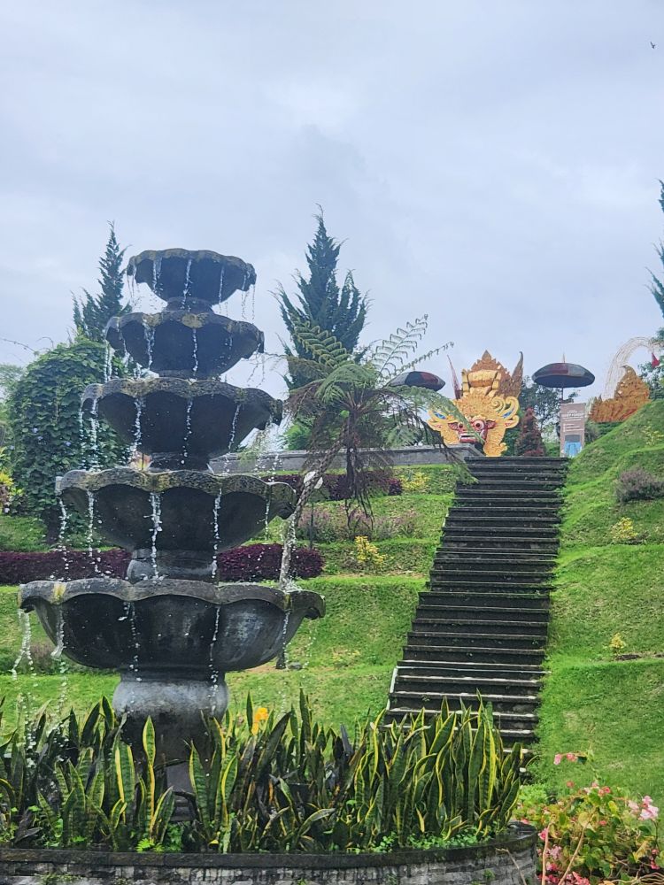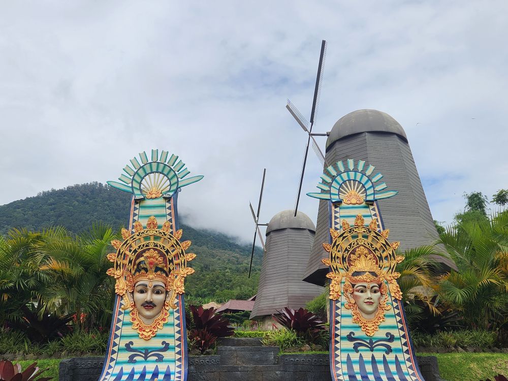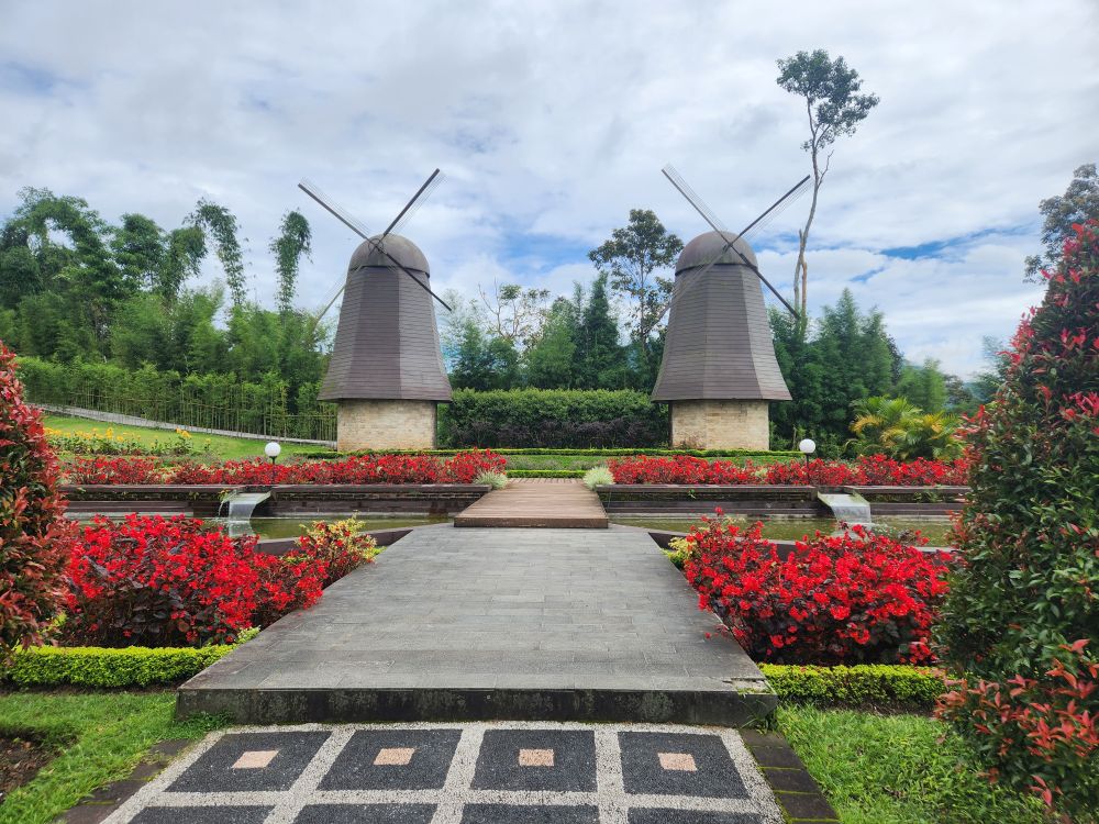 Our next stop are the Bloom Gardens – a combination ticket with the Ulun Danu temple. Divided into 7 different areas, the gardens are the largest flower recreational garden in Bali with over 11 acres of flowers and statuary. We start our explorations in the Welcoming Garden, following the stone pathway up into the hillside past the Dutch Garden with the requisite Windmills.