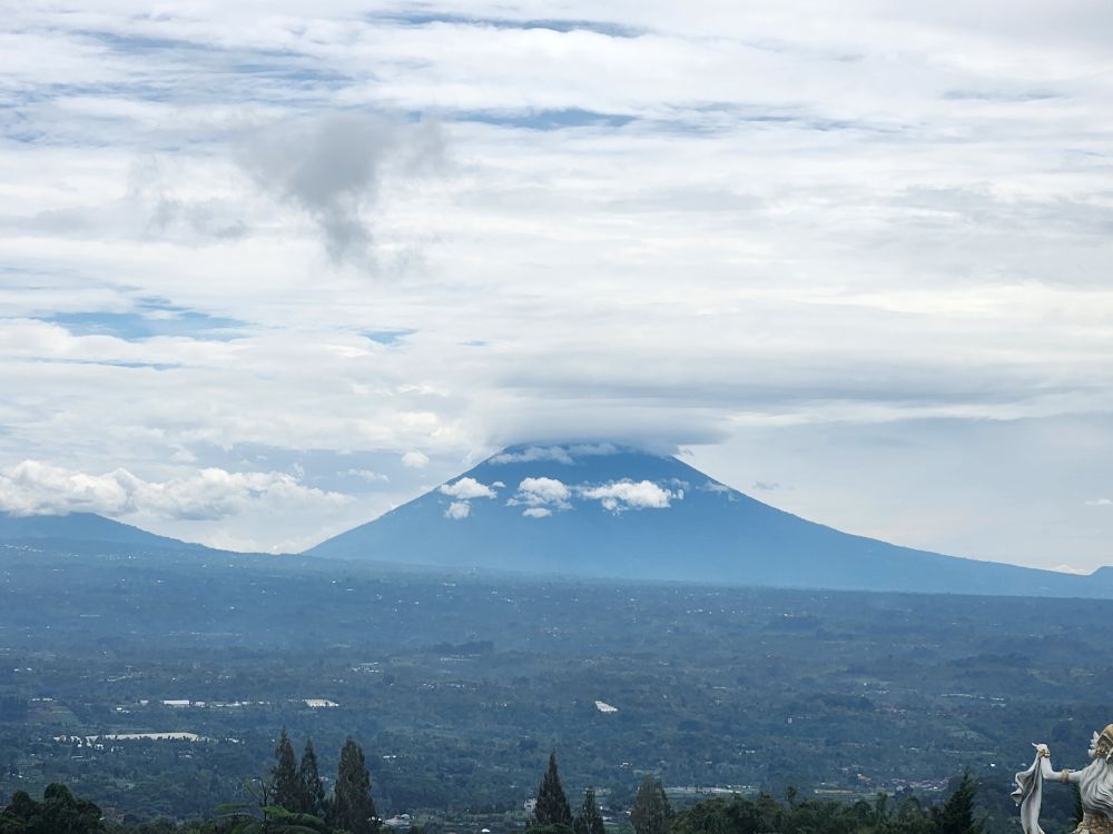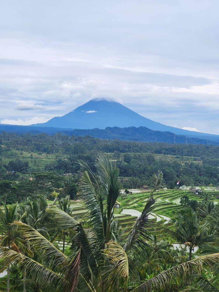 As we climb up to the Topiary Barong, we have incredible views of Mt. Agung covered in wispy clouds in the distance.