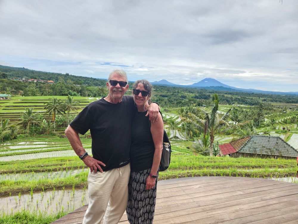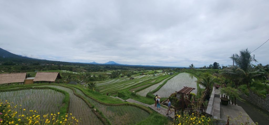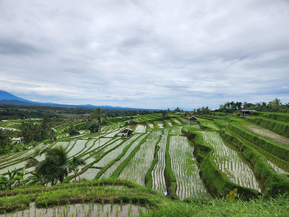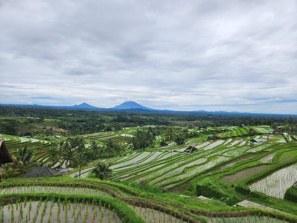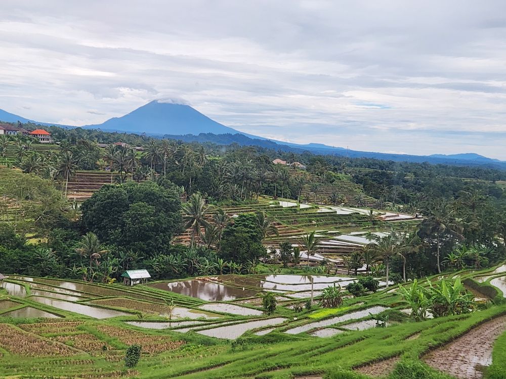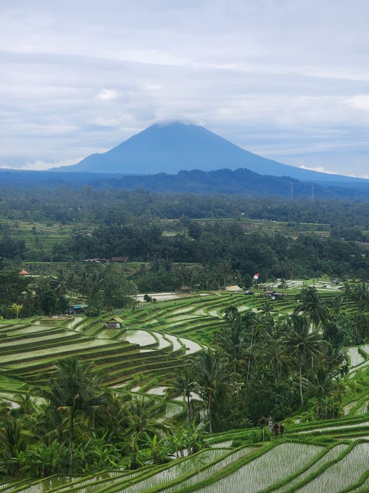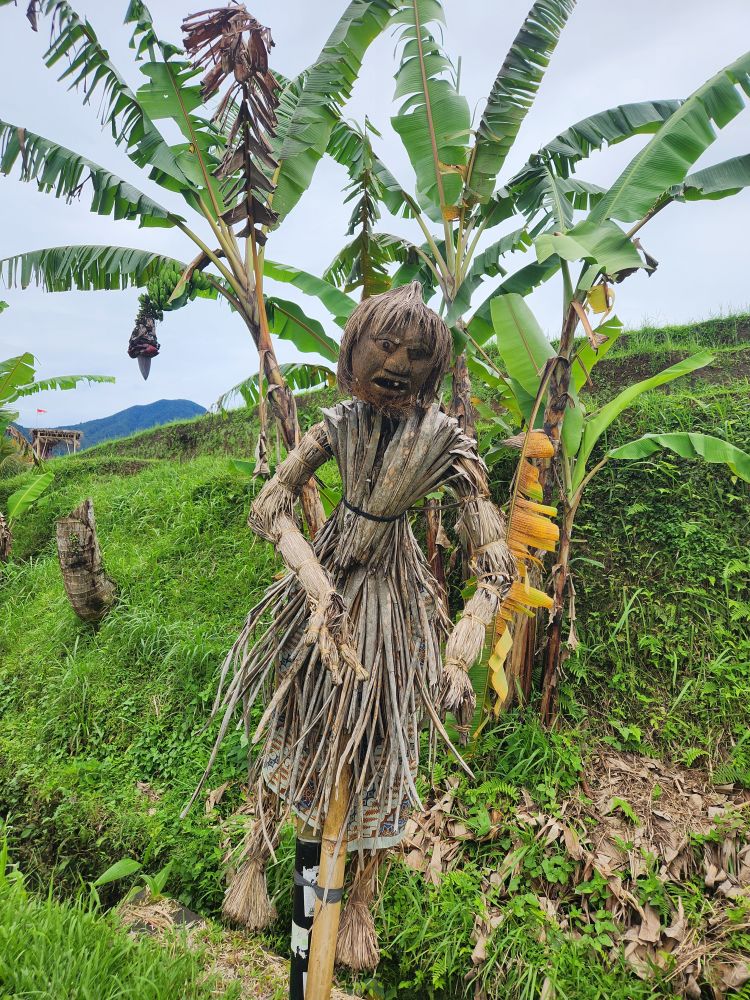 There are great scarecrows along the way, carved from coconut shells, and just more and more incredible views across the fields and out to Mt. Agung.