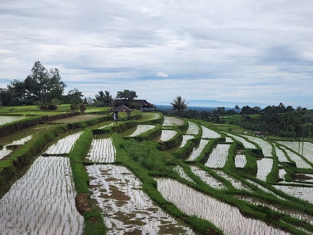 We can see paths all through the fields, and at the top, a viewing platform where Dadek drops us off in the “no parking/no drop off” area. Oops. Then he just drives off. Um….is he coming back? Will he drive back down the hill to pick us up? Well, guess we’ll see! In the meantime we take the few minutes we have to snap photos – the rice has just been planted, maybe a week or two ago, so the gorgeous green plants contrast against the mirror-like surface of the water in which they are planted. Beautiful.