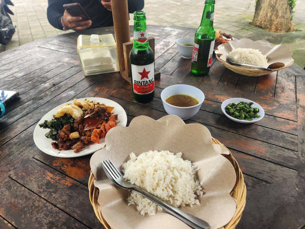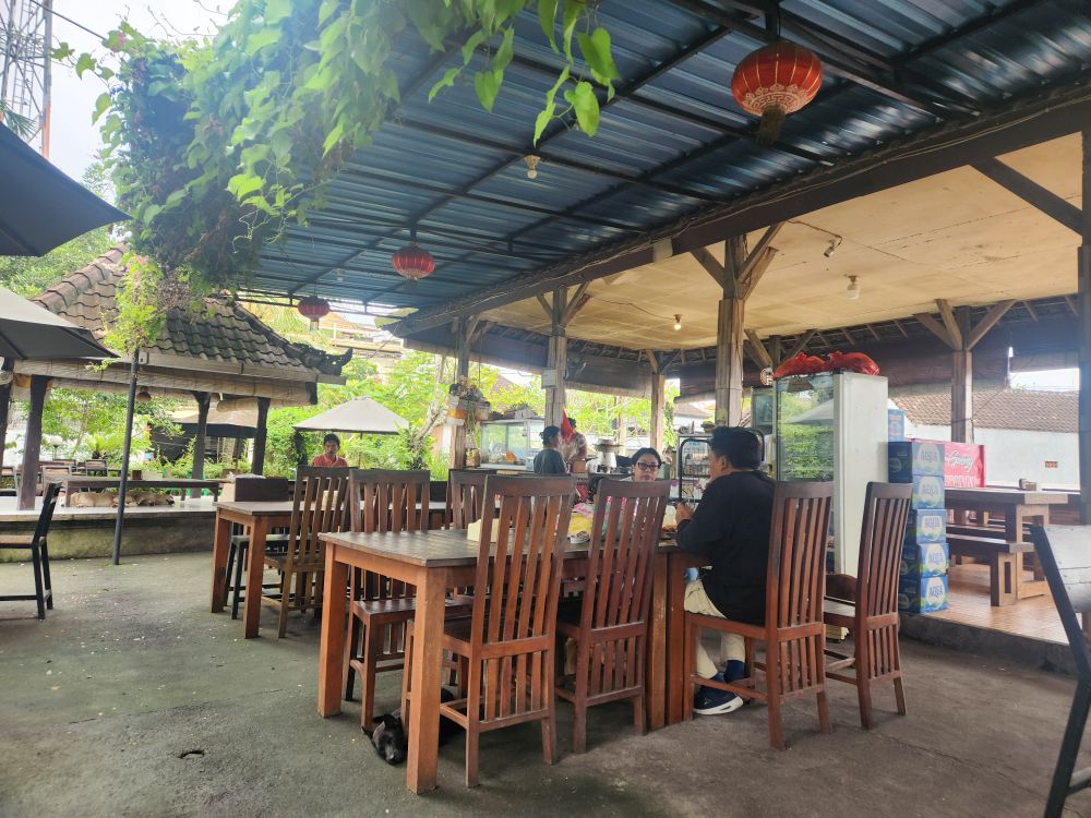 But first, lunch! We’ve been talking to Dadek about Babi Guling – and Pande Egi, which everyone knows about! So he says he’ll take us to a great place for lunch – turns out it is Babi Guling Jero Kawan, a fabulous suckling pig place in the back of some alleyway. It’s great! There are only 2 meals – either the big plate combo or a smaller plate. Well, you know we’re going for the big one – what the heck! And it was fabulous – almost as good as Pande Egi! Dadek ate with us and it was an enjoyable 30 minutes or so just hanging out, and playing with the dogs that surrounded us begging for food.
