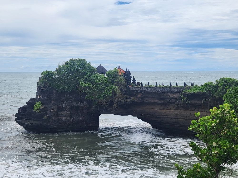 As you approach the walk to Tanah Lot, you first see Batu Bolong temple, perched on a cliff with a natural rock archway.