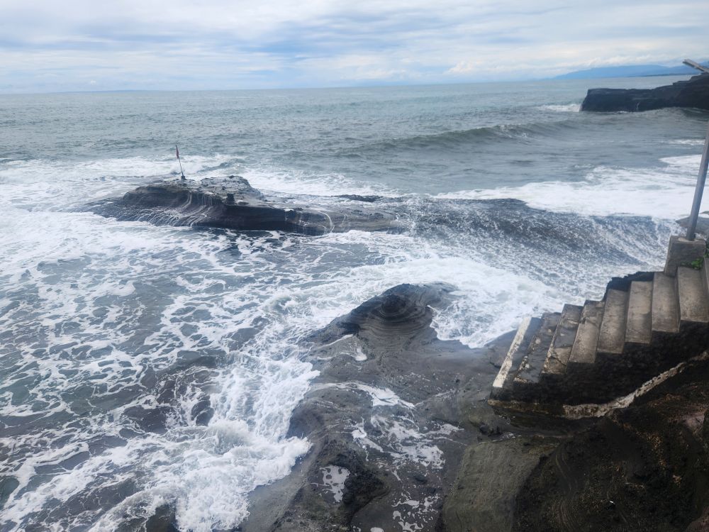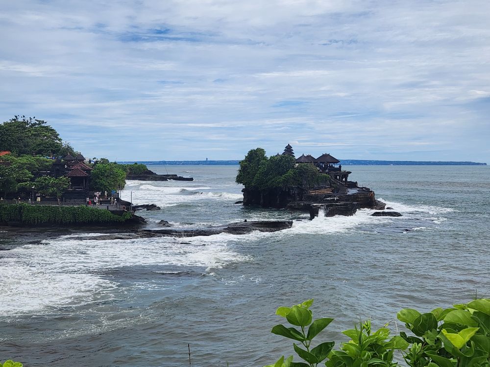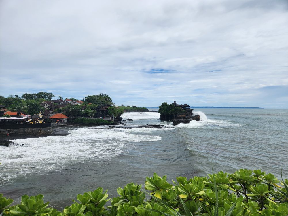 Unfortunately, it is high tide now, so we can’t walk out there. During low tide there is a walkway that appears out of the water providing a bridge to the temple. But for now, we simply watch the temple from afar – that’s actually probably better than actually going out there, to be honest.