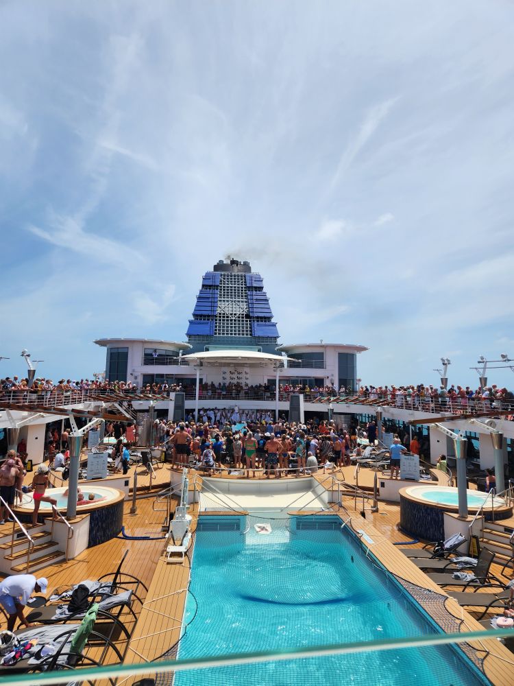 Then it is down time until lunch (because we sure as hell aren’t wasting our time going to Tara’s talk on Phuket – yeah – not spending that time in the theater where we have noticed more people coughing and sniffling away) and then the 1pm equator crossing ceremony which is, well, lame. The traditional parade of Neptune and his court (all the dancers and singers dressed in toga-type attire), 2 dancers in mermaid costumes literally picked up and placed in the pool and the only saving grace being that Johnny Balance does the emceeing. He’s funny – even reading a script – but otherwise? No Kiss the fish. No explanation of Pollywogs and Shellbacks, no ceremony converting Pollywogs to Shellbacks – just a whole lotta nothing for 15 minutes. Oh well – did give us something to do for a little while at least.