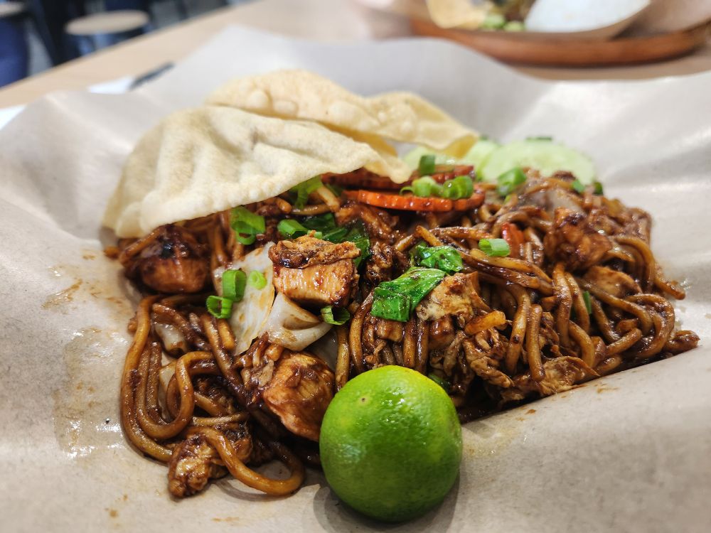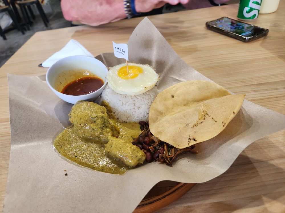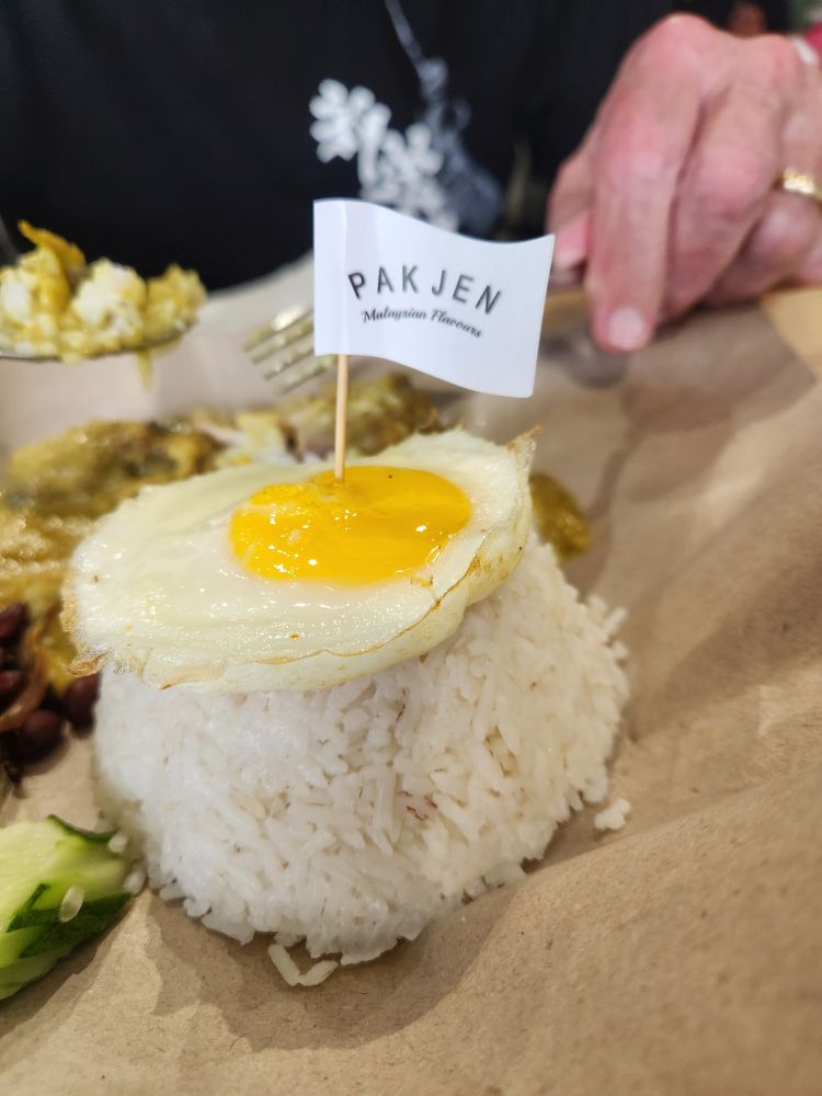 On our way to the market we had spied a little restaurant with lots of inside seating and a big sign advertising Nasi Lemak (curry and rice) which looked promising. After nosing around the market food court – and the New Year festival food stalls outside on the walk along the river, we head back to Pak Jen for an excellent meal of Nasi Lemak for Ed (curried chicken and coconut rice) along with Mee Goreng Ayam (notice the different spelling) for me along with some excellent roti for both of us. Very satisfying and very filling! Now we are ready to explore.