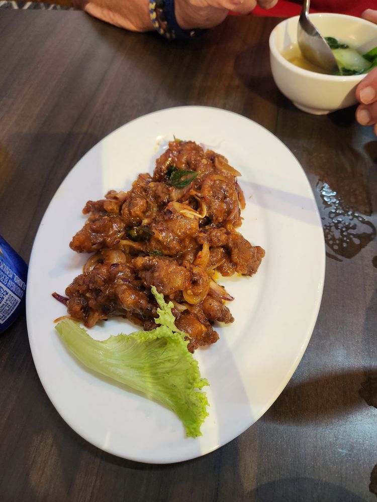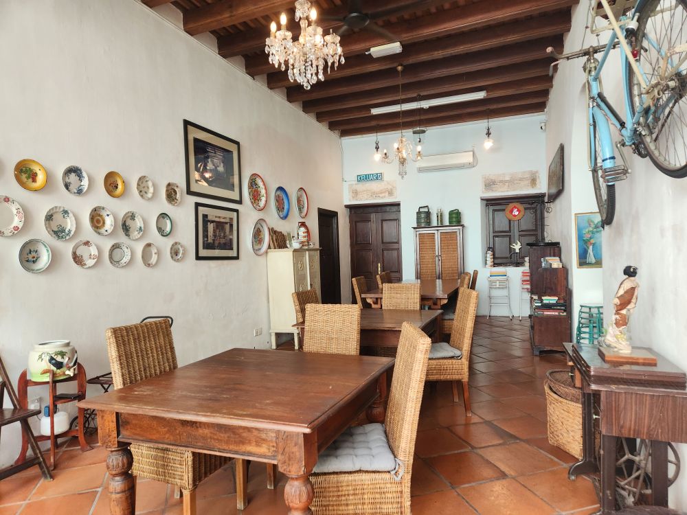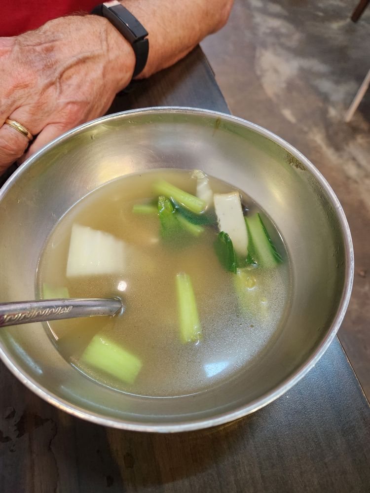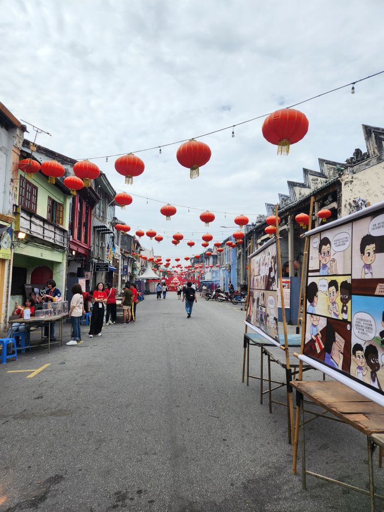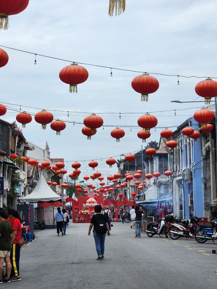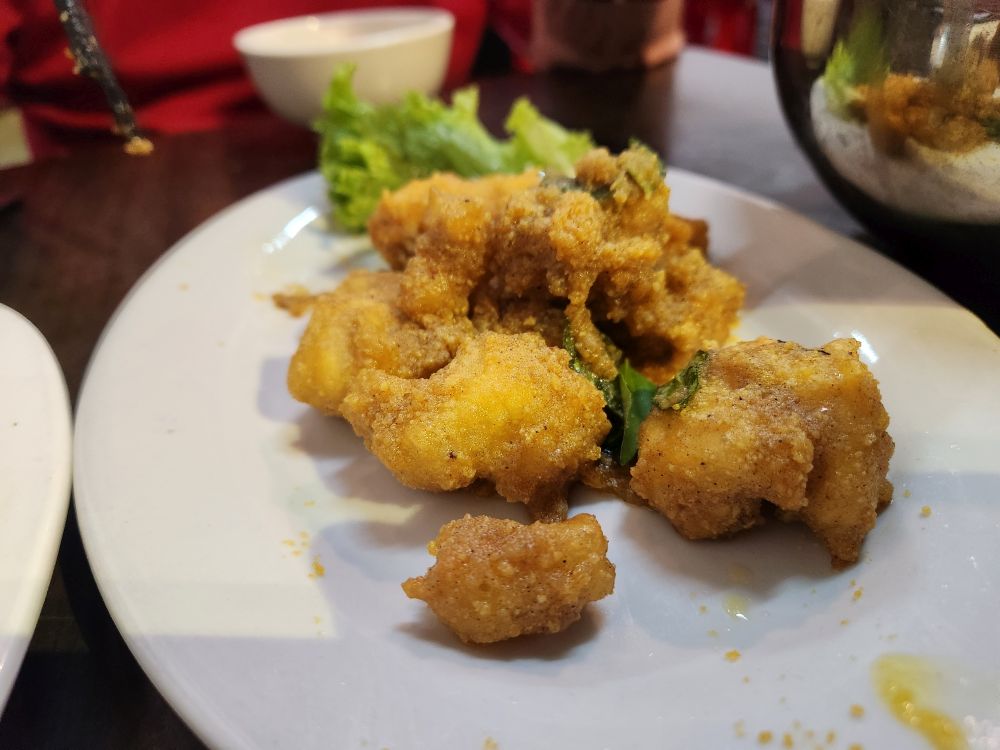 A nice way to spend an hour or so out of the heat with interesting things to look at. Back out on the streets, we wind our way through more decorations to our pre-selected lunch spot: Chu Char 1st. In Penang, Chu Char are Chinese restaurants that are more family style, serving a variety of dishes along with steamed white rice. Chu Char 1st have some really good reviews for their seafood, which is why we chose it for our lunch. And they didn’t disappoint. The menu is huge, tons of variety, and of course, super cheap. Ed ordered mixed vegetable soup and we shared two generous plates of Mantis Prawn in Kam Heong sauce and Fried squid with Salted Egg batter. So good and yummy!