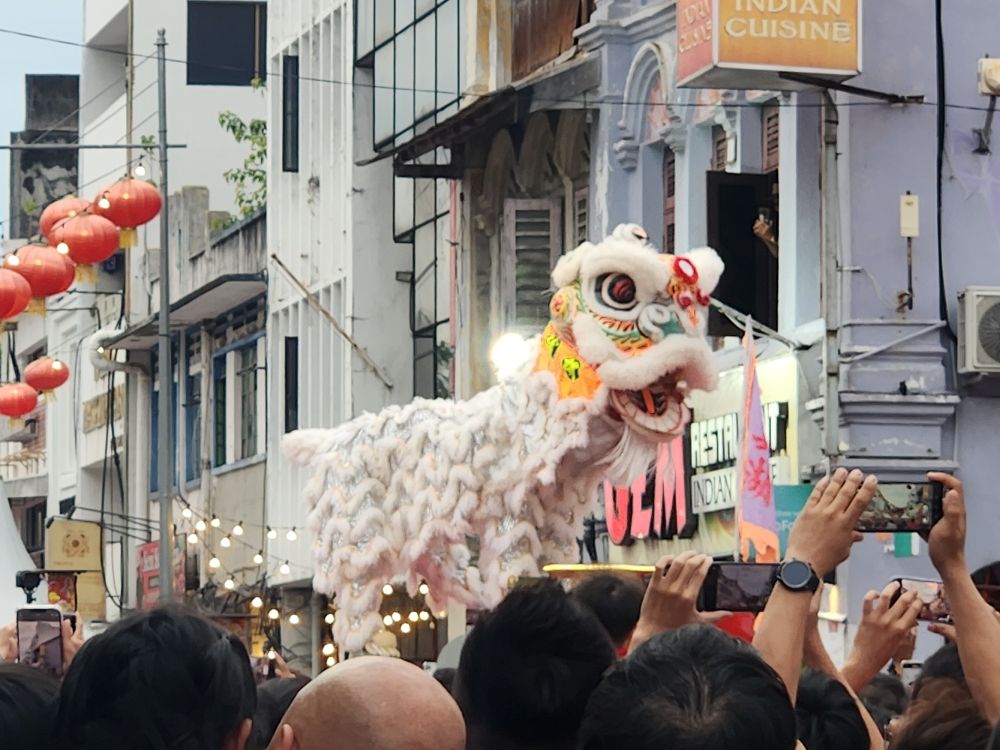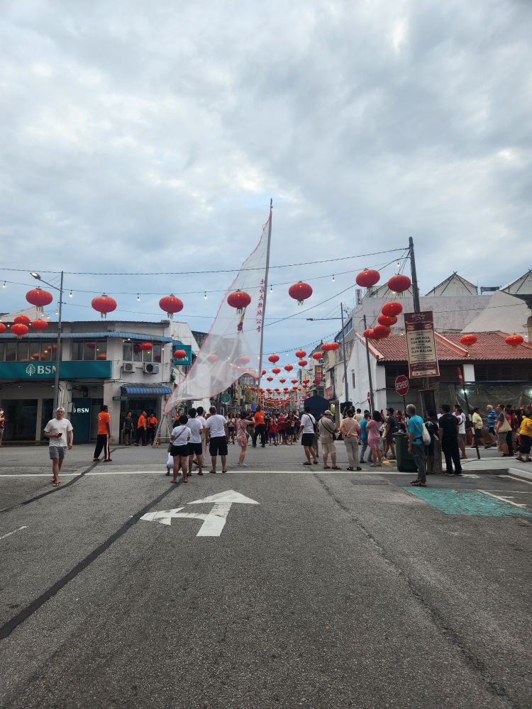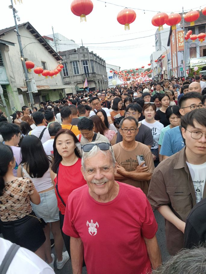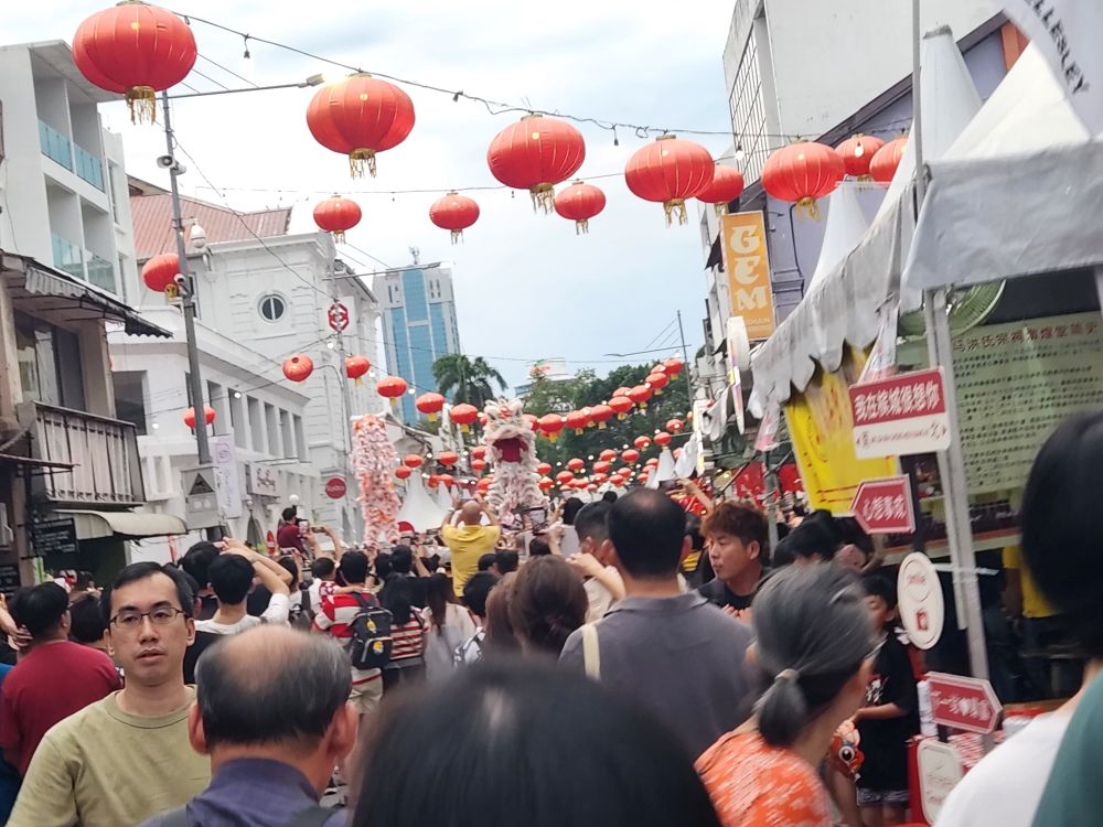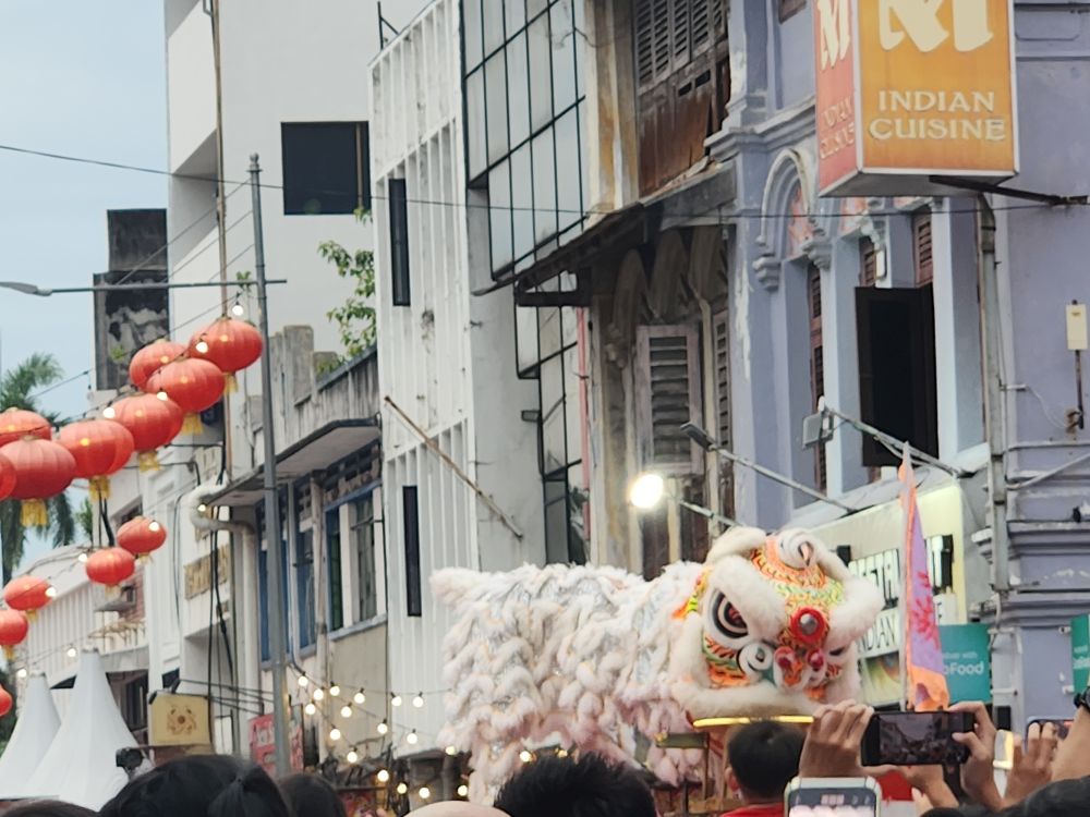 Delving further into the crowds, we actually lucked into seeing the tiger parade and dance. Fantastic! The traditional Chinese tiger outfits with 2 people in them – up on those little platforms doing dances and messing around. We could sort of see – we were way back in the masses of people – but what we could see was great.