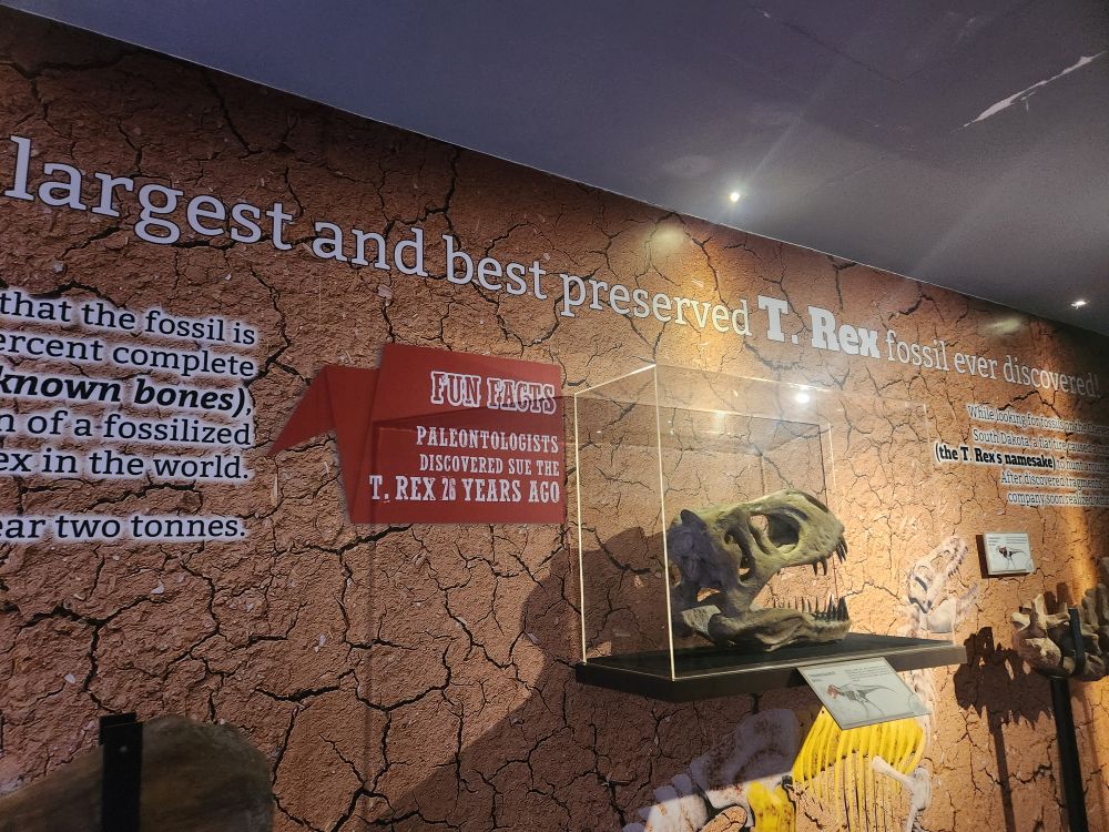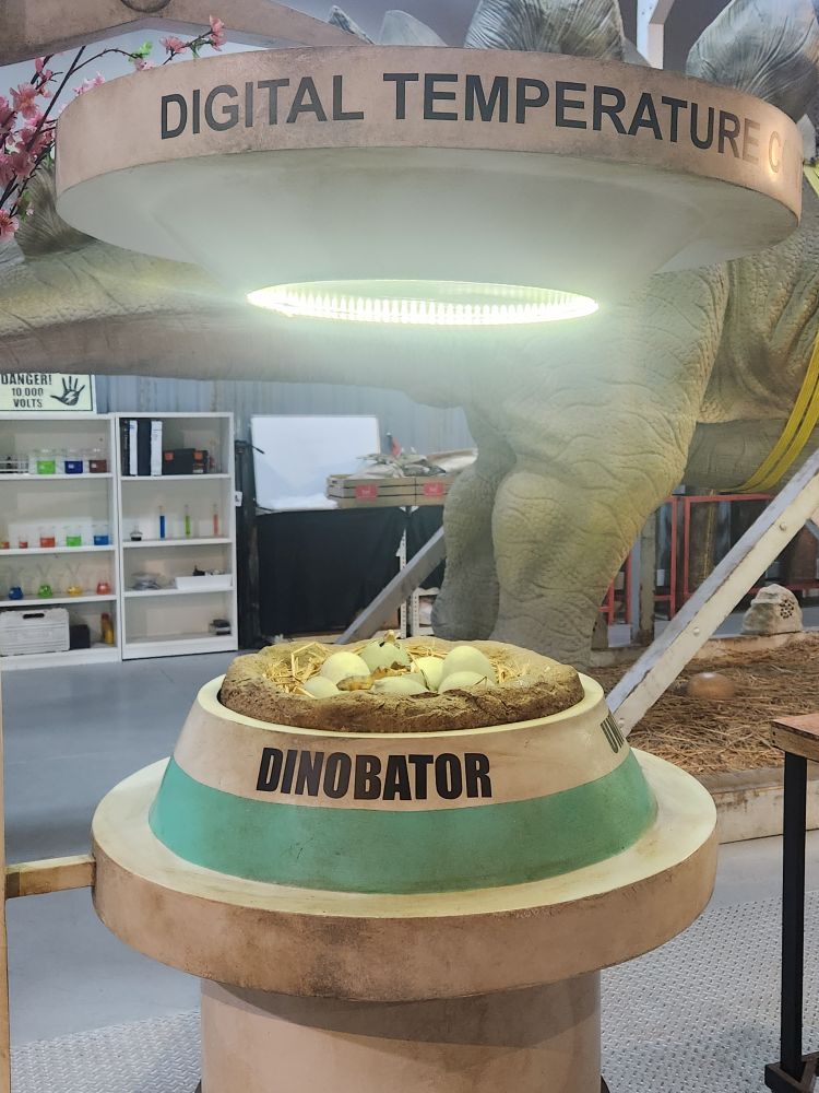 Now onto the Jurassic Research Center. Down the elevator we go, through the Kiddie Las Vegas arcade and out into the foyer area where characters were interacting (sort of) with screaming kids. Queuing up to get into the Research Center – we were the only adults without children – and once the doors opened (it is capacity controlled), we wandered through displays about dinosaurs and Sue, the famous T. Rex fossil. Then had a little presentation from one of the “scientists” who talked about the hatching process and let us hold an egg. Again – sweet and cute. Ed and I paid more attention to all this stuff than the kids, I think!