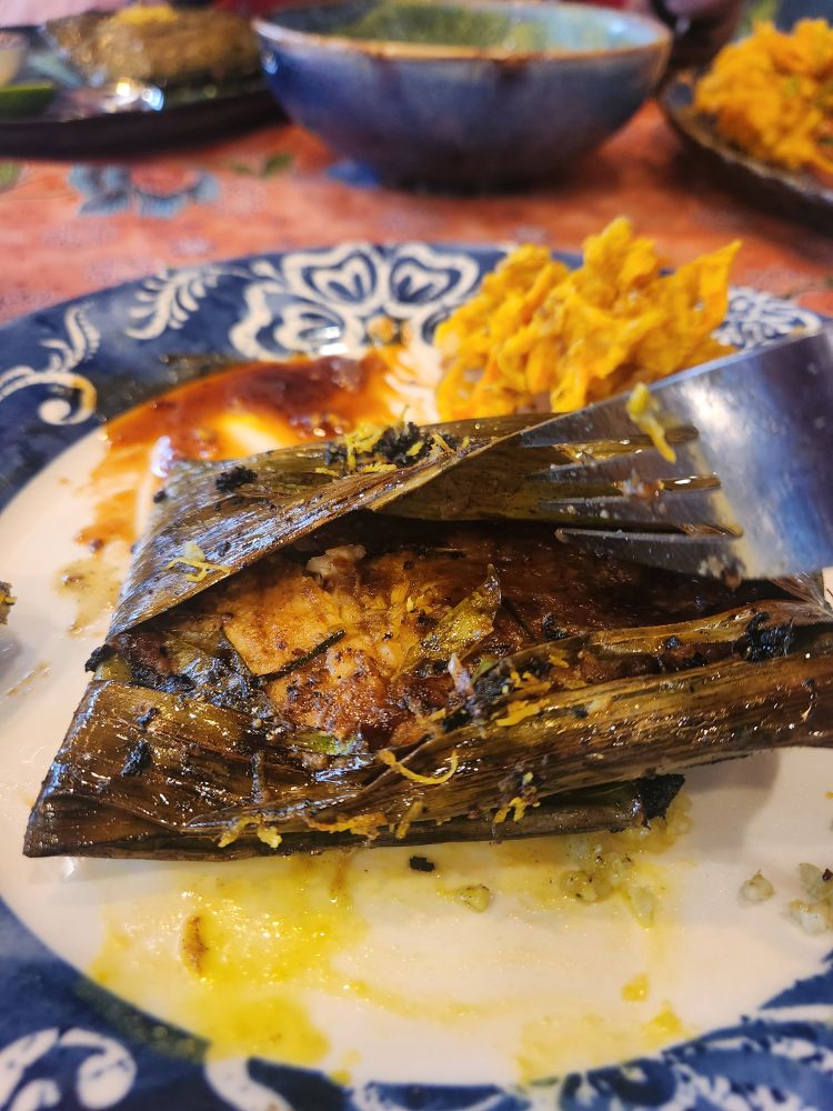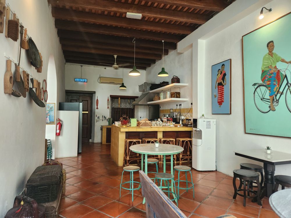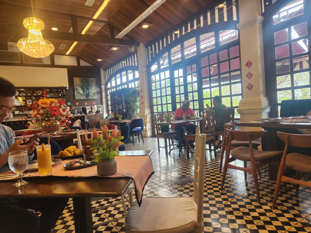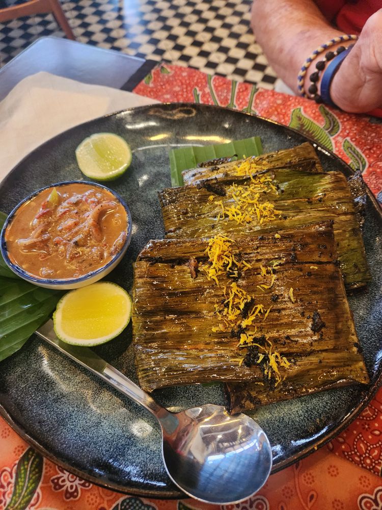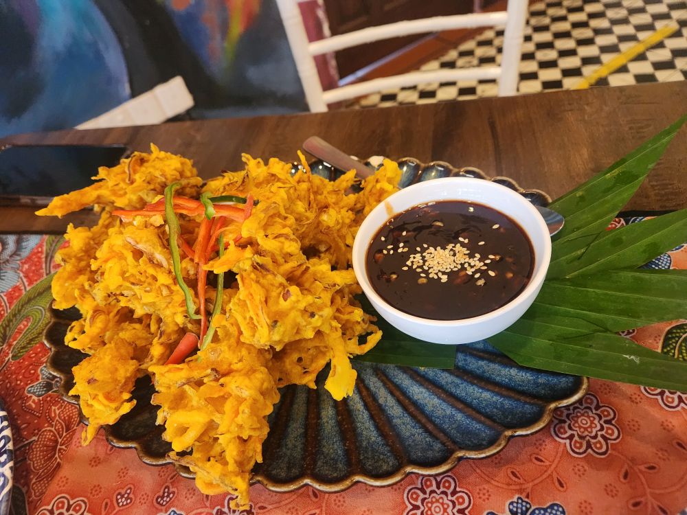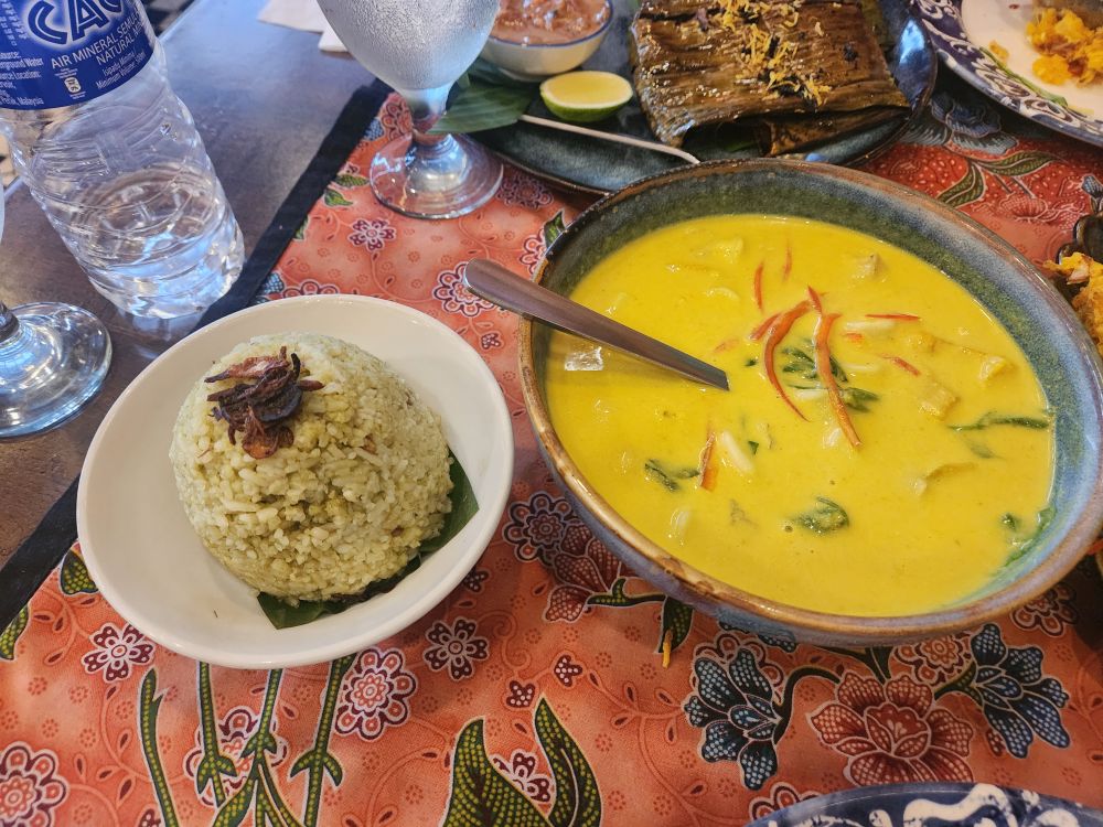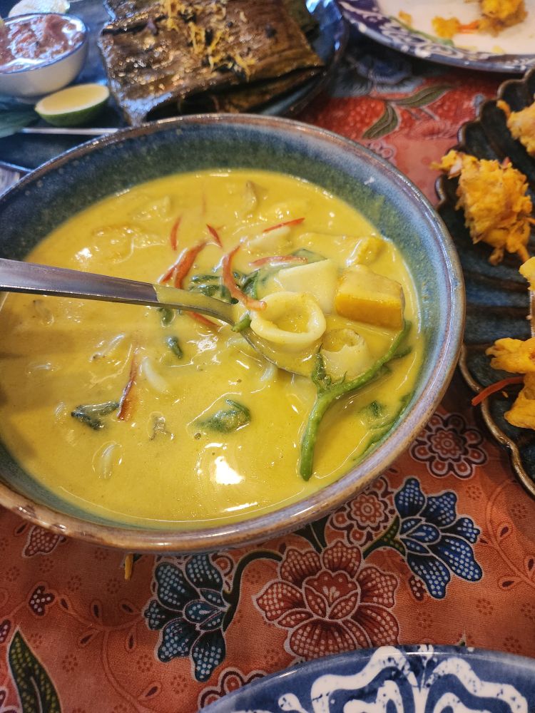 With time to kill, we hung out at the hotel for a bit before heading out for an early dinner to a restaurant outside the general mass hysteria of the festival. Irama was in a gorgeous old building, upstairs – and we were so lucky we went early because we got a table – every other table was pretty much reservation only. The food was amazing – and HUGE! Beginning with what was called a Starter, we ordered Cucur Jagung, a fried shrimp/bean sprout/corn concoction that reminded us a little of those Trader Joe’s veggie nests – only much more massive! We were thinking maybe they gave us 2 servings, but nope, only one! Yikes! For the main meal, we shared (sort of) Barramundi grilled in banana leaves and a squid curry made with Durian paste – both were excellent – and who would have expected the Durian dish to be that good, the way that fruit smells!