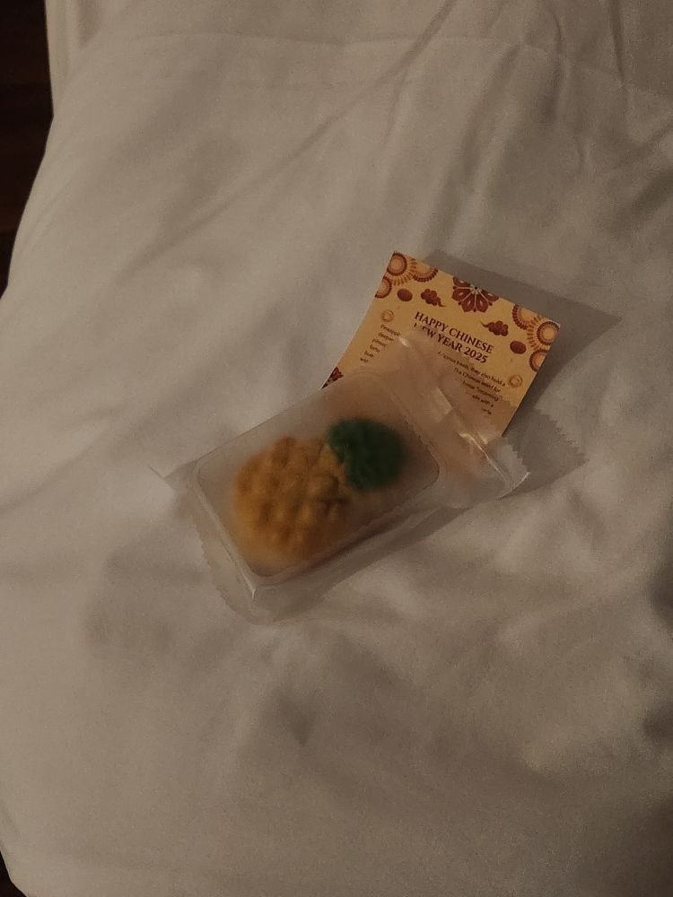 Breaking free, we went looking for the ‘local bar’ the guy at the bottle shop told us about. Turns out it is another bottle shop where people just put plastic chairs out in the street around the shop and hang out. Priceless. And our guy was there! He got us chairs and sat us down and we chatted with a guy from the Netherlands and tried to chat with an expat who has lived here for 25 years, but he basically smiled and ignored us. 2 beers later we were back at the hotel, hanging out in our awesome room relaxing with our Happy Chinese New Year Pineapple tart treats – for “incoming fortune” in Hokkien dialect!