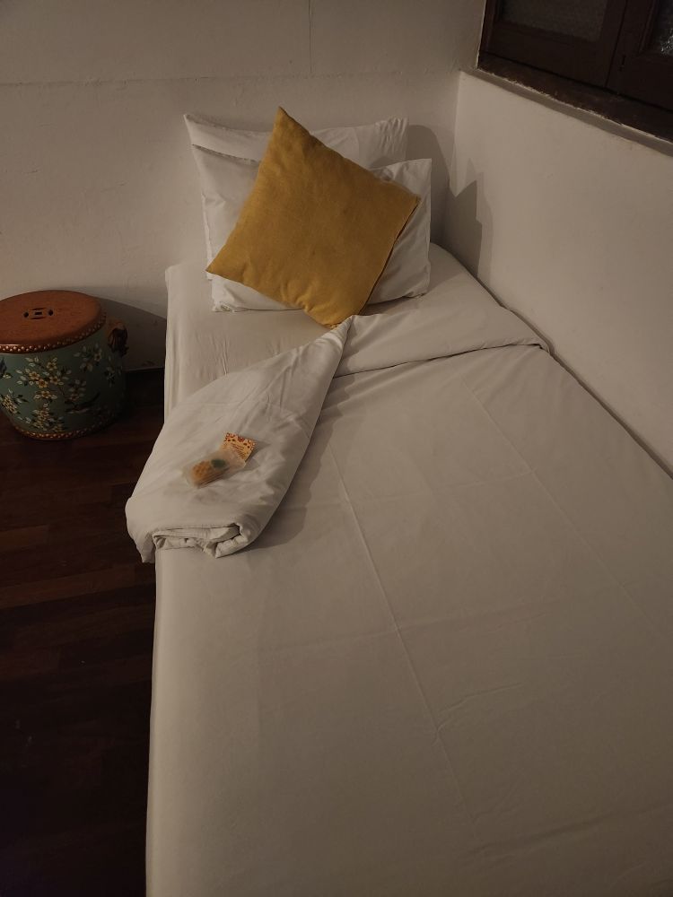 Back at the hotel, we checked in with our sweet clerk/manager who takes us to our 2nd floor room. All we have to say is amazing! The hotel started life all those years ago as a traditional Chinese home with courtyards and open rooms which have been beautifully converted. The room was huge with the 30 foot ceilings, gorgeous wood fixtures and beams and super comfortable. The entrance to the room was an open balcony overlooking the courtyard below, and equipped with a sofa and chair, plus snacks and coffee and tea we could take and eat/drink all night. No min-fridge, but a full kitchen downstairs for their breakfast service with a full-size refrigerator we could use for our beer and wine – when we got it. Perfect.