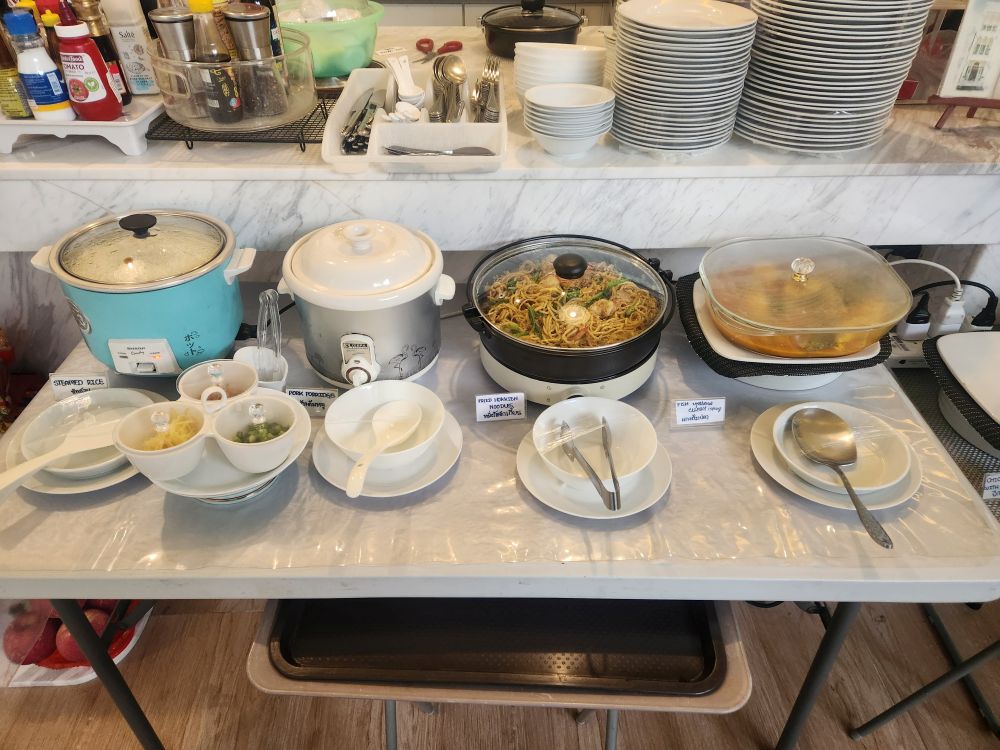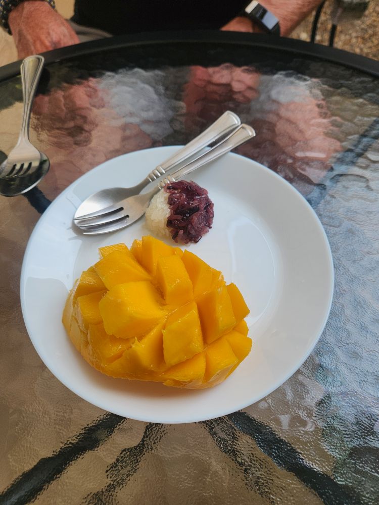 We woke up at our normal early time, after crazy dreams! Must be the Thai bed – or maybe the air-conditioning? Crazy. Went down to a wonderful breakfast of fried noodles, fish curry and mango with sticky rice in the beautiful little breakfast area. Yum!