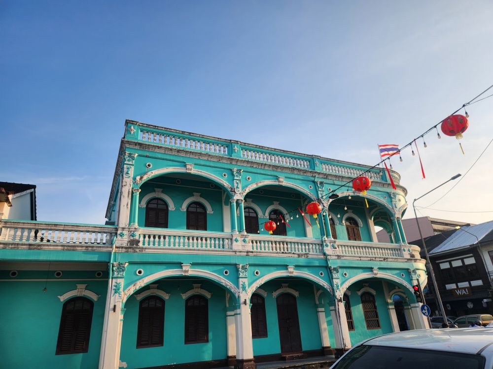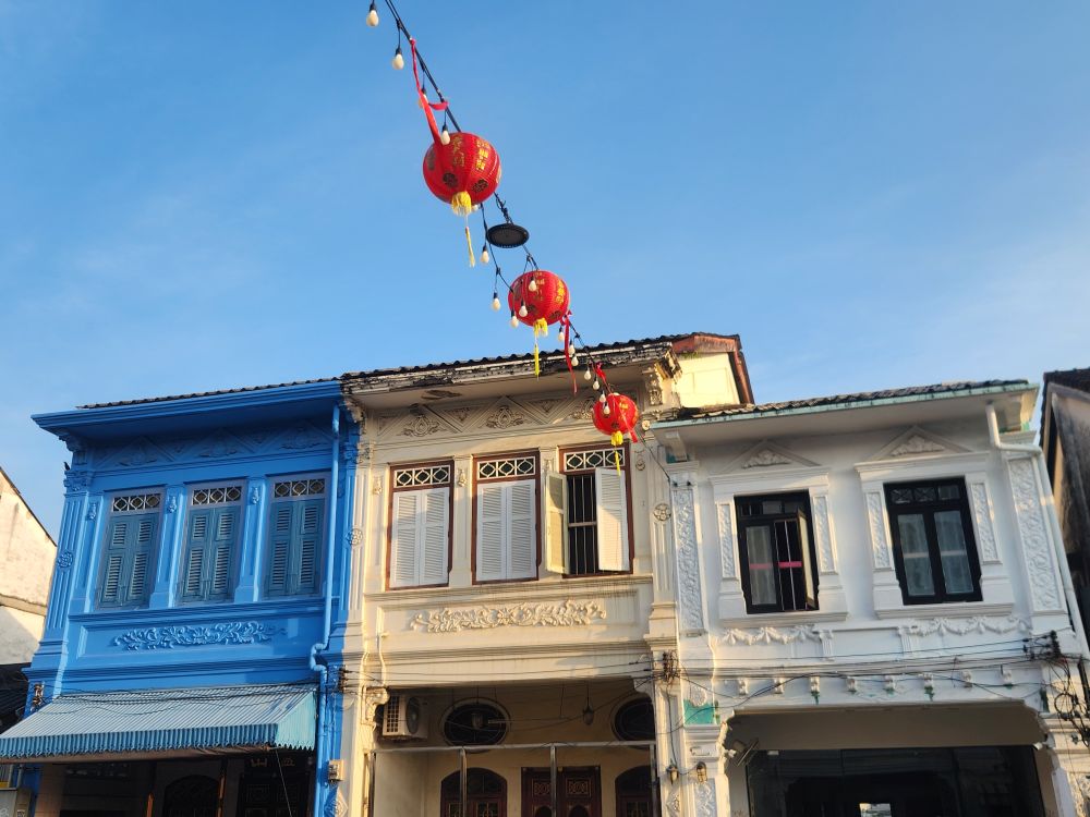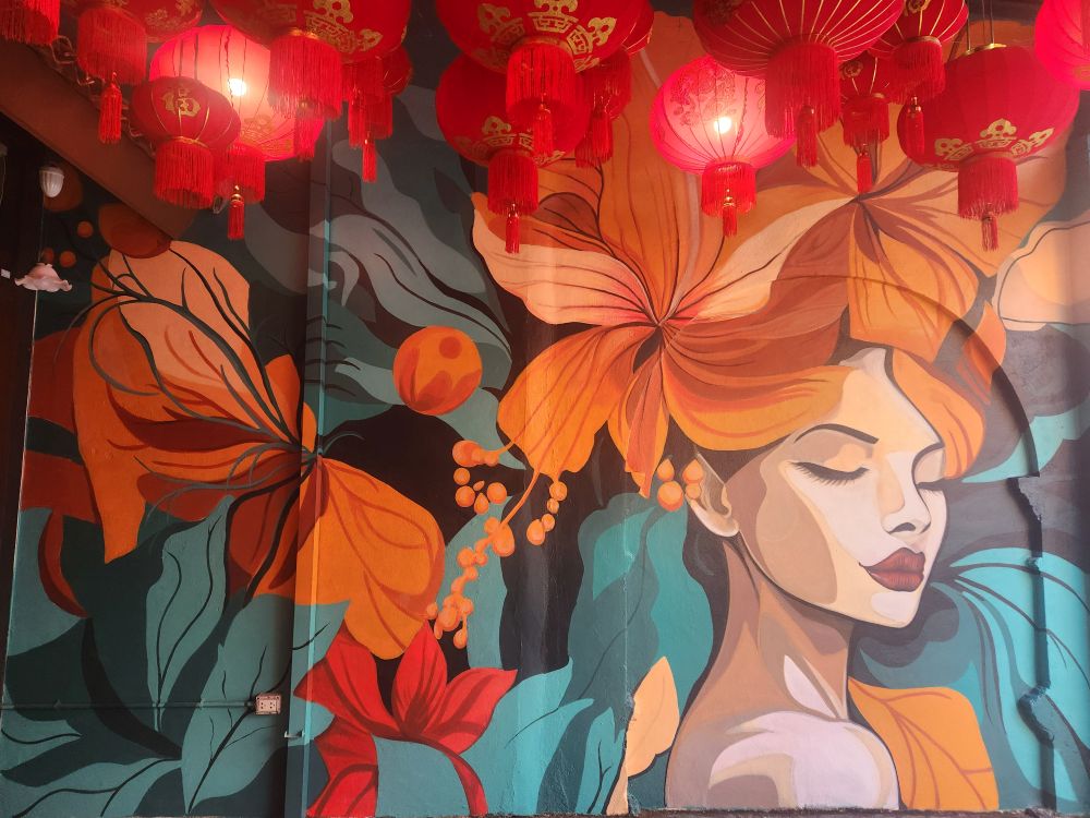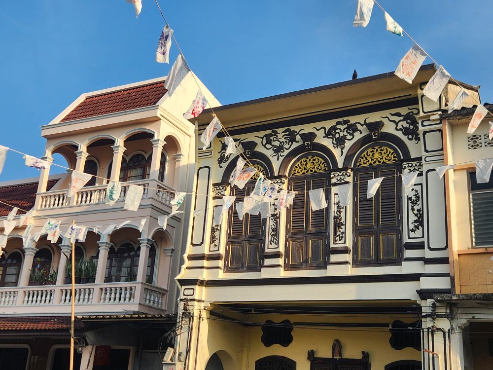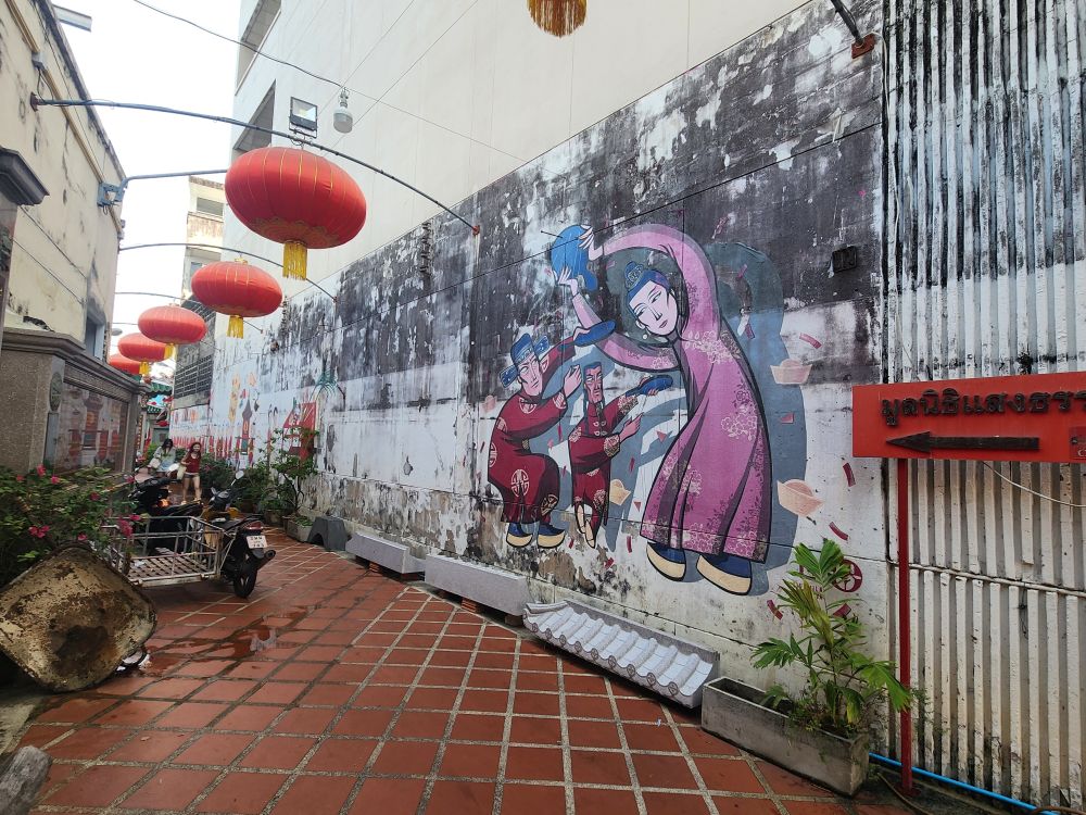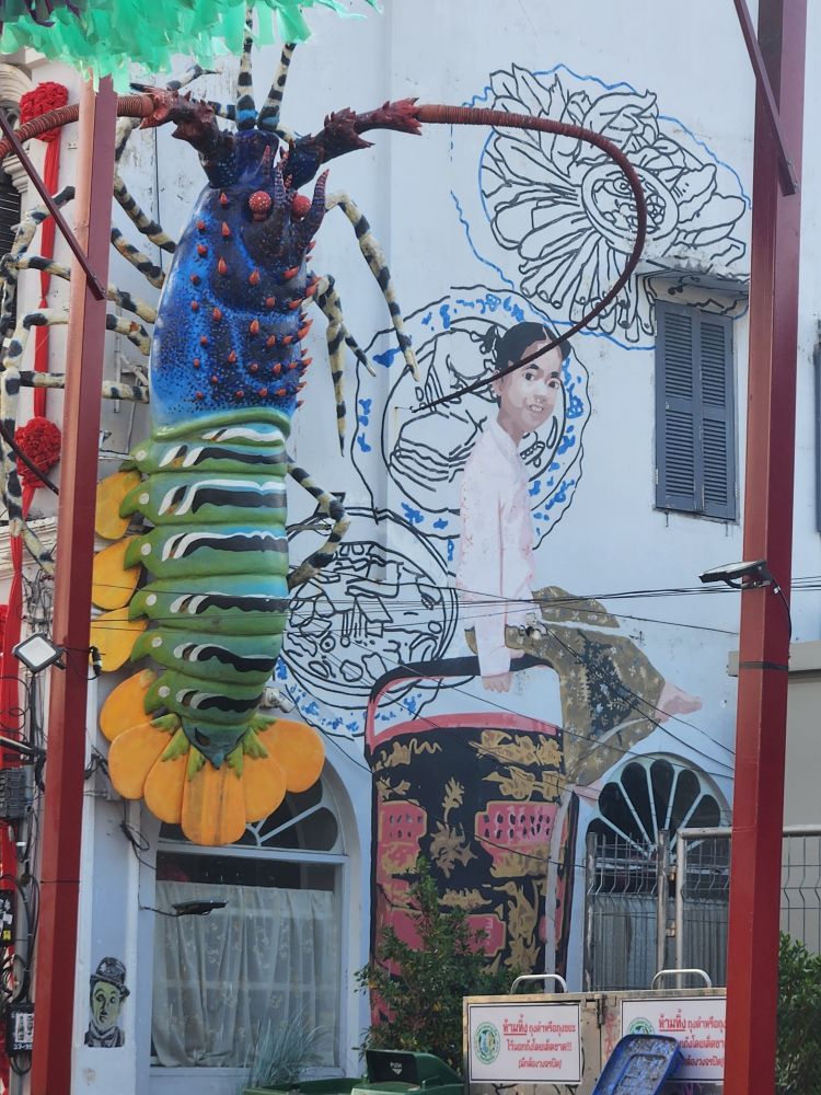 More architecture, the Uncle and Auntie mural I couldn’t find the other day – right next to Tu Kab Khao, the restaurant where we had lunch! It is sort of in disrepair and hard to see – with all the crowds yesterday it is no wonder we missed it! Also found another mural of a little girl sitting atop what looks like a dim sum steamer – this one on the side wall of Tu Kab Khao. What a difference walking around in the morning makes. More photos of the Saeng Tham Shrine entrance and murals, then to the hotel after our nice morning stroll.