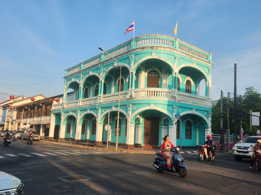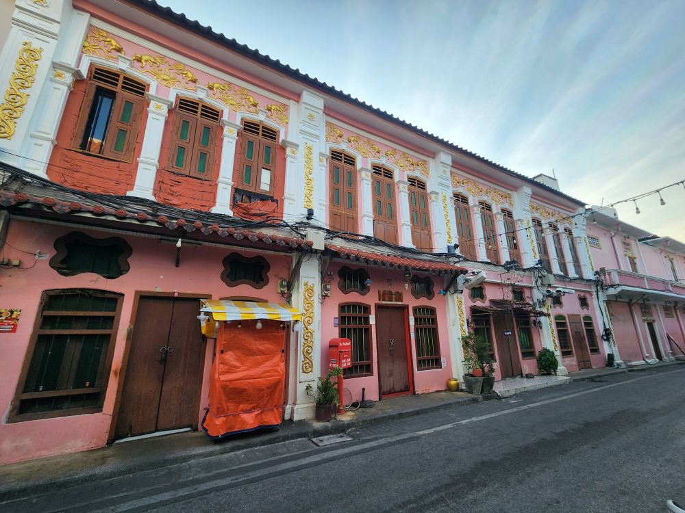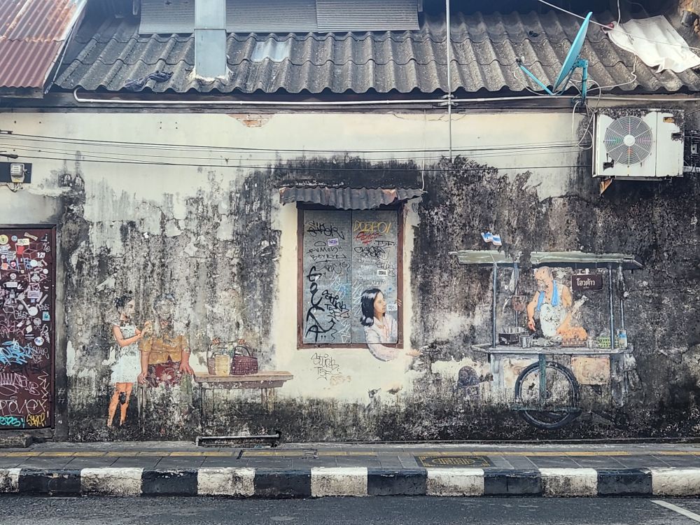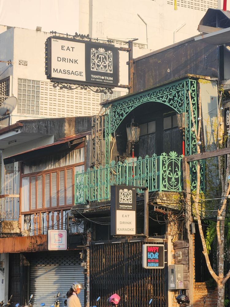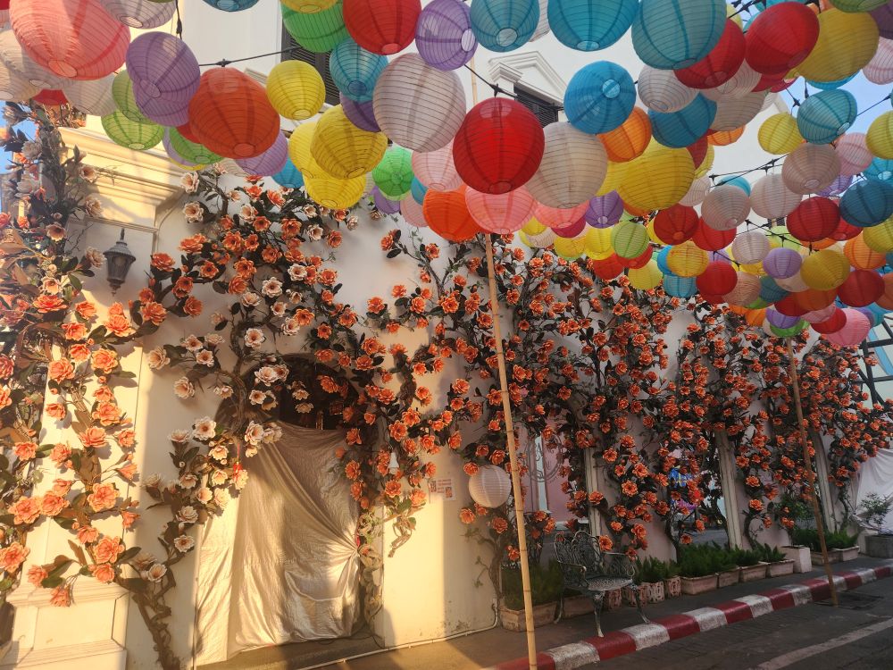 Then headed out into the cool, blissfully quiet and uncrowded morning streets. Just wandering this morning, looking for murals and other colonial architecture. Wandered down Soi Rommani – the first street to have electricity and the old red-light district!) then over to Wat Mongkol Nimit, where just took pictures of the exterior as neither of us are dressed to go inside there.