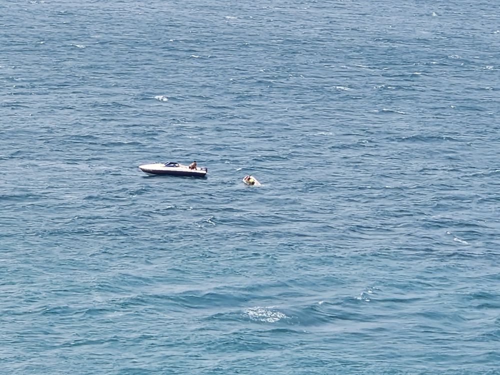 At the tender dock, we are literally the only ones going back to the ship – private tender! A huge boat, just for us! Of course – it is barely 9:30am, everyone else is coming off starting their day in the sun! Ugh – we’re happy to go back to the ship, hit the gym, have some more coffee, then hang out the rest of the day. The balcony isn’t all that unbearable, so after a quick salad lunch that is where we head, reading and watching a couple of guys try to tow a swamped jet ski. Entertaining to say the least until the sun gets us and we retire inside.