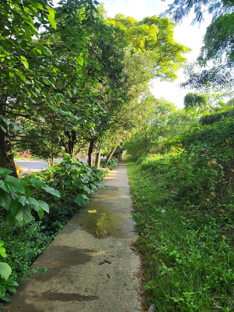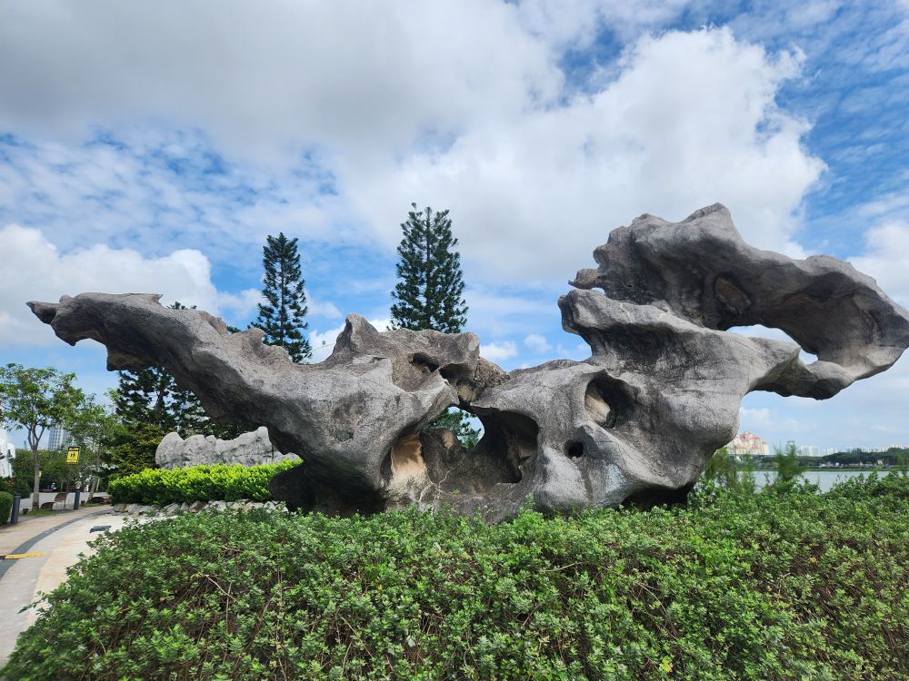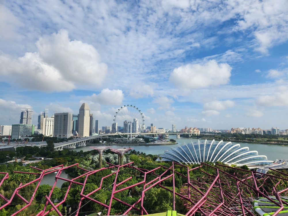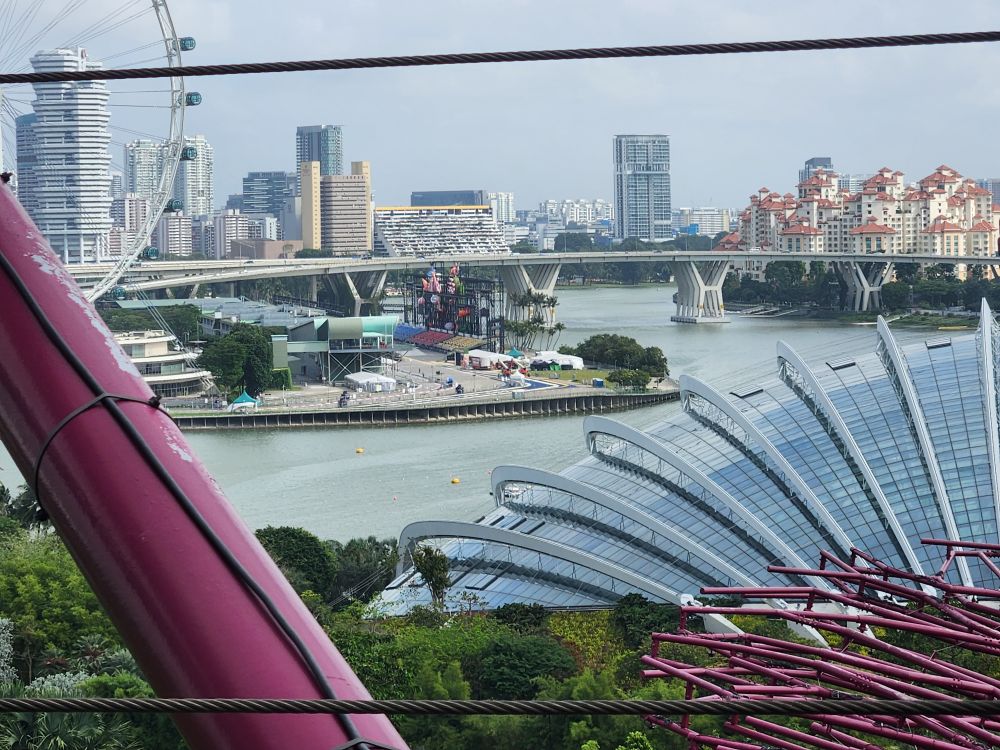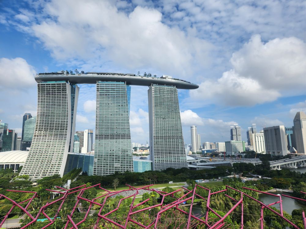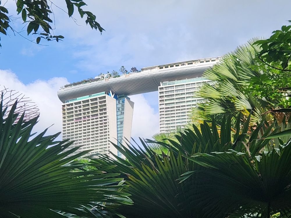 The Gardens open at 9 – but instead of waiting until 8:30 to leave, we head off around 8, which was a good decision for the clog in the security line. We both got through immigration fine – and fast, but the security line to check the baggage was at least 10 minutes or more. Finally outside, we follow the trellis, that we remember from another visit, out to the train station and then hit the path that follows the shoreline down Marine drive. It is a nice walk, and thankfully shaded, with that great breeze still blowing in from the water, but it isn’t any 30 minutes, thank you Google. More like 45 minutes as we wind our way past a huge new condo construction project and down Marine Gardens drive to the park. Thank God for the clouds and the breeze! And at least we get some great views out to Marina Bay Sands hotel – that iconic place that looks like it has a ship on the top.