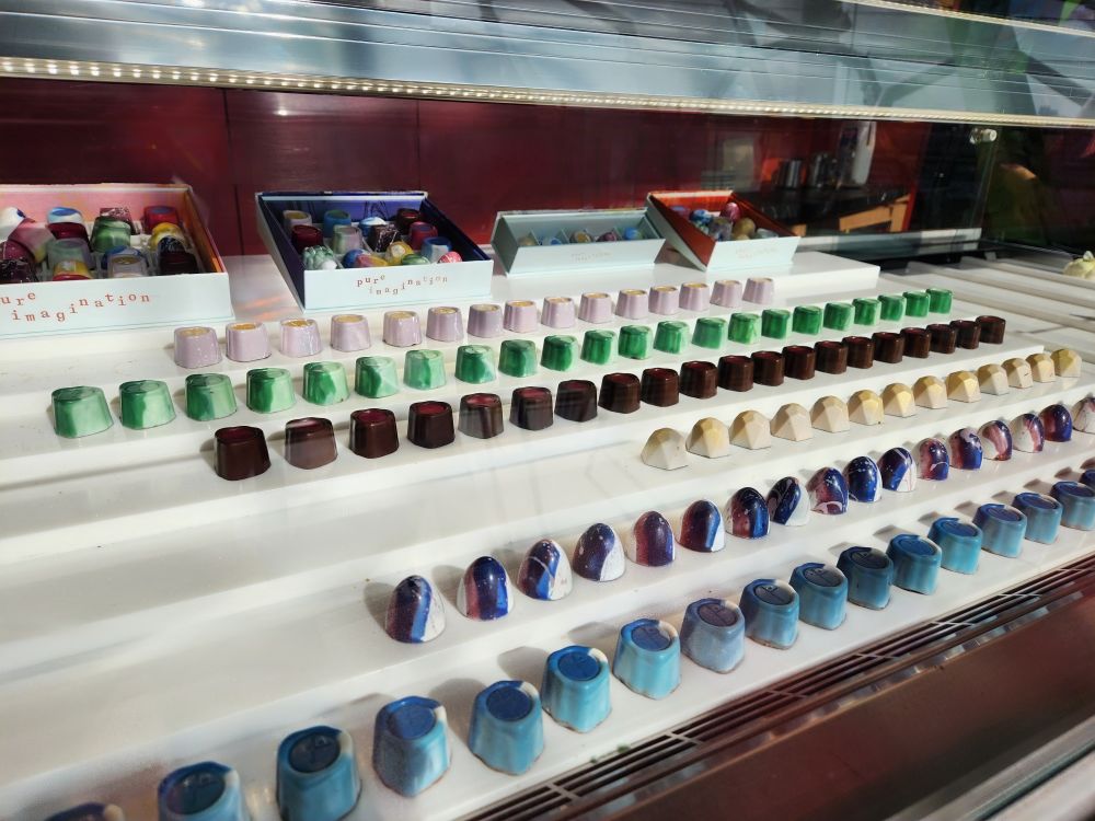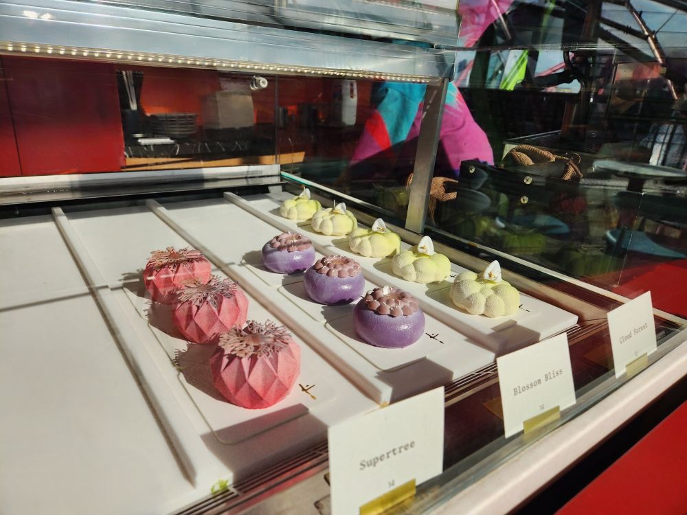Taking our leave when more, much more noisy visitors arrive, we head back down to the cafe, ordering a couple of excellent (if not expensive) iced mochas – and marvel at the gorgeous multi-colored chocolates available for purchase (if you are into $4 USD per piece chocolates that is – we know Janice Wong is a celebrity chef and all, but still – man, Singapore is pricey!).