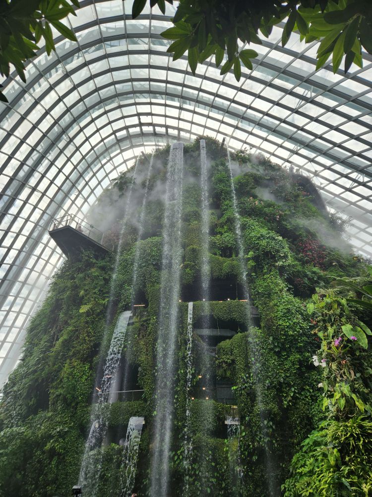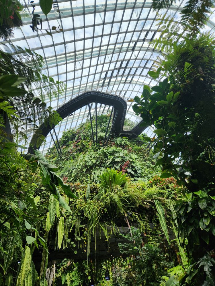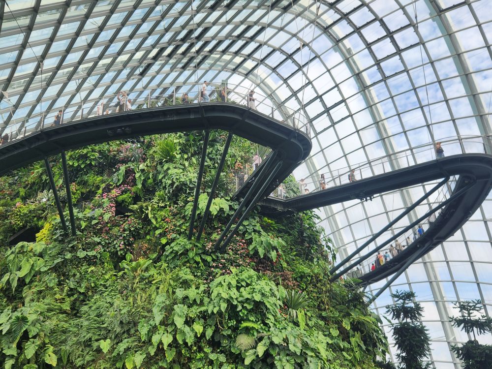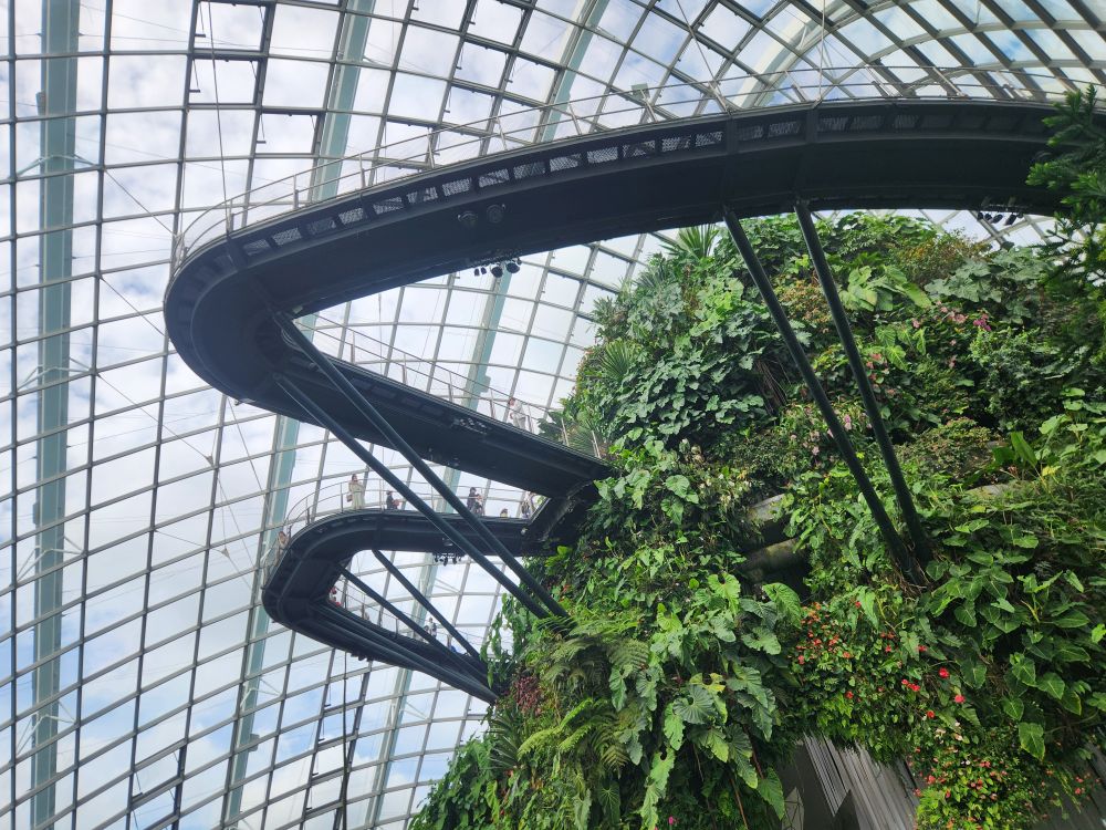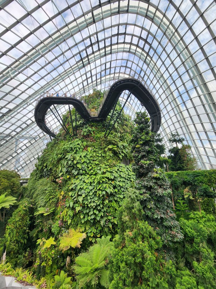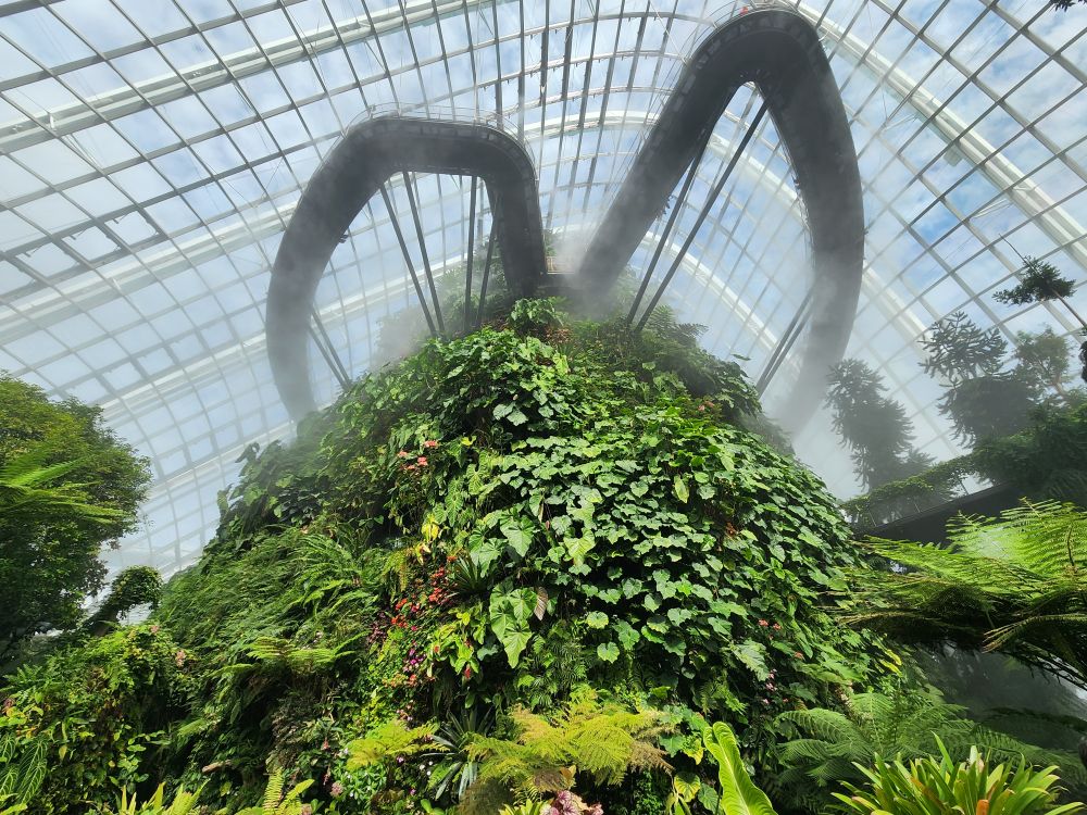 Even with the longer walk, we still get to the gardens right after opening. Being early has its advantages, there isn’t even a line at the ticket booth! Eschewing the Flower Dome, which has a Monet exhibit which makes the tickets much more expensive, we go for the budget option of the Cloud Forest and the Skytree Observatory (or the Skytree overhead walk). A nice little walk through the park finds us in the middle of the Skytree garden with the huge superstructures soaring above us. Its totally cool how they have live plants embedded almost all the way to the top of the trees structures. And how they have to have huge bucket trucks to work on the plants – fertilizing, trimming, replanting.