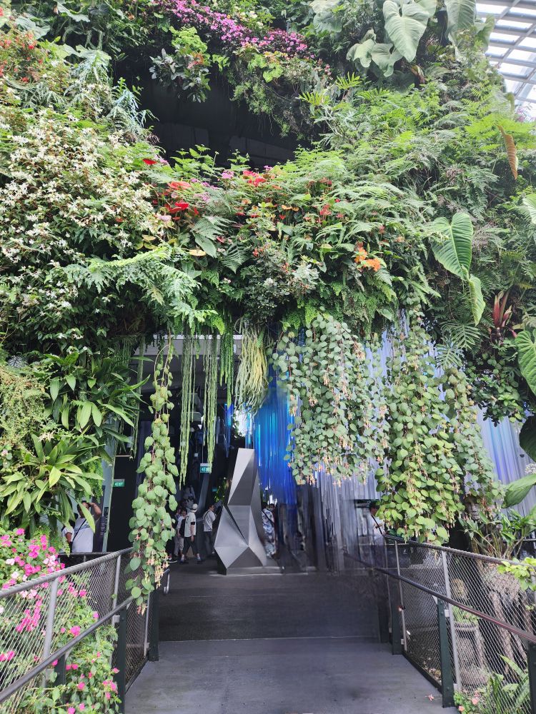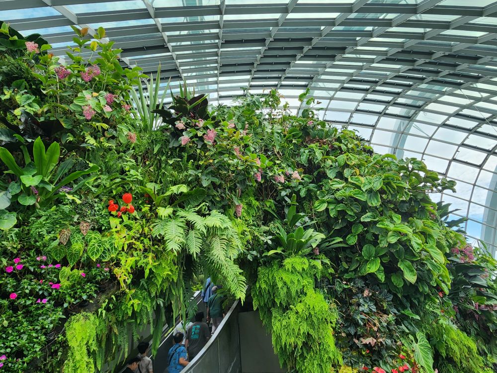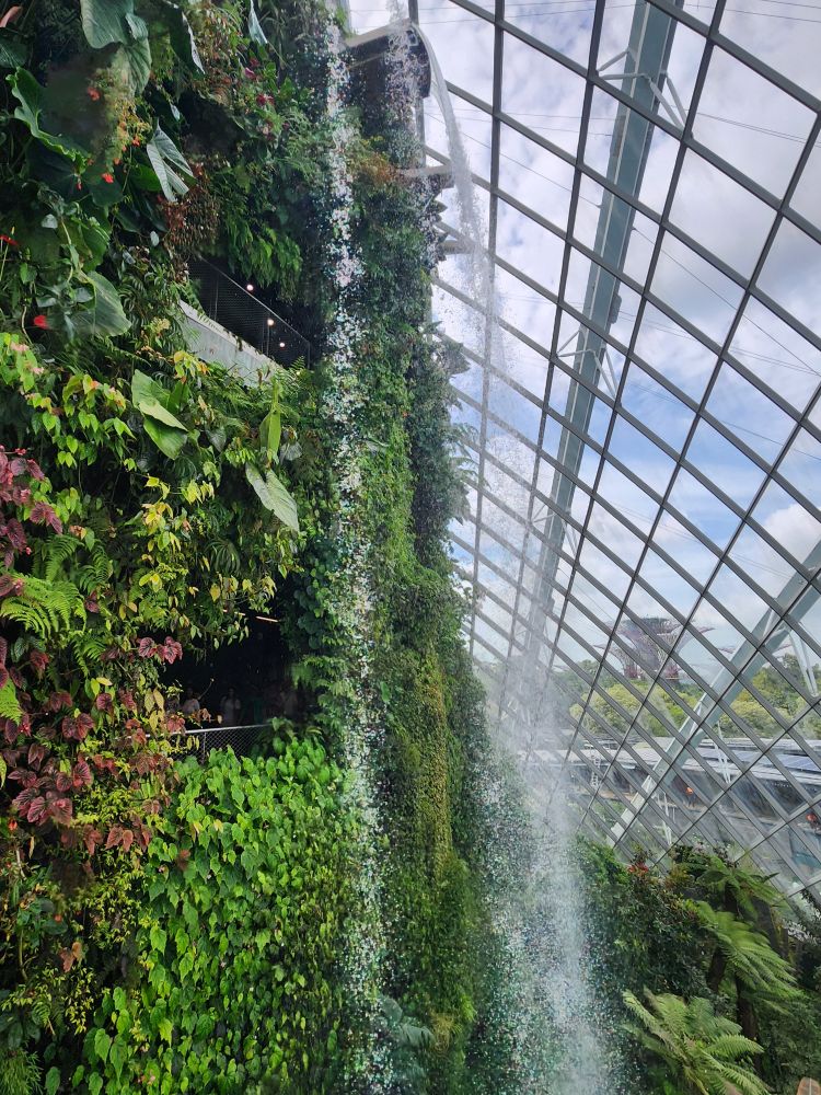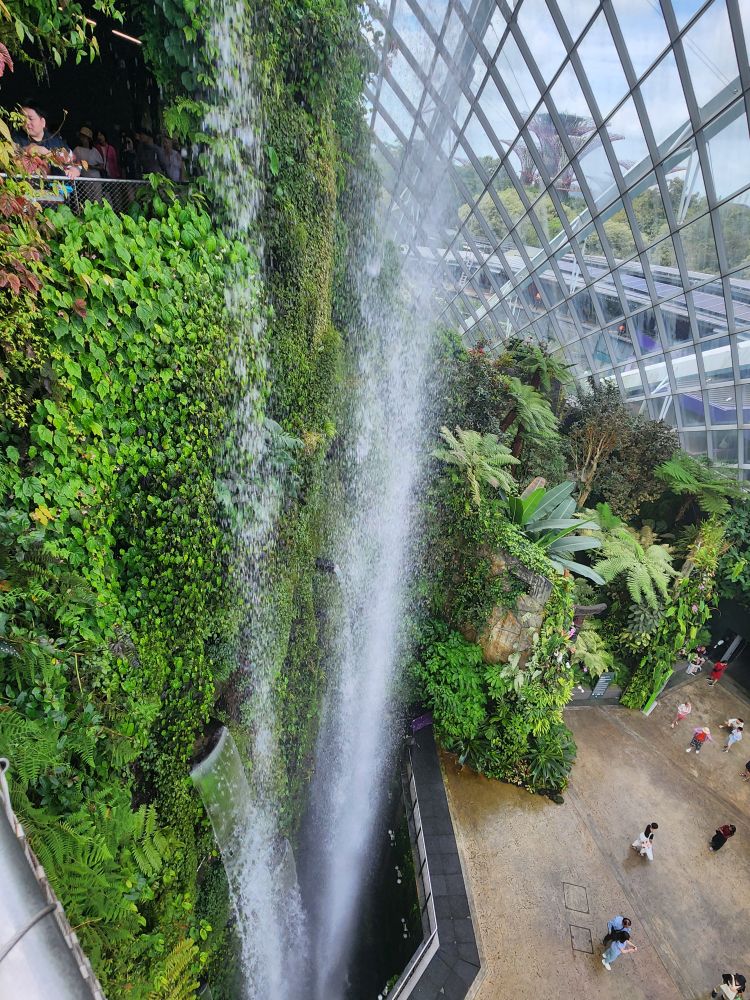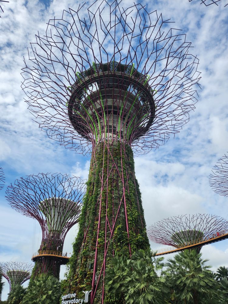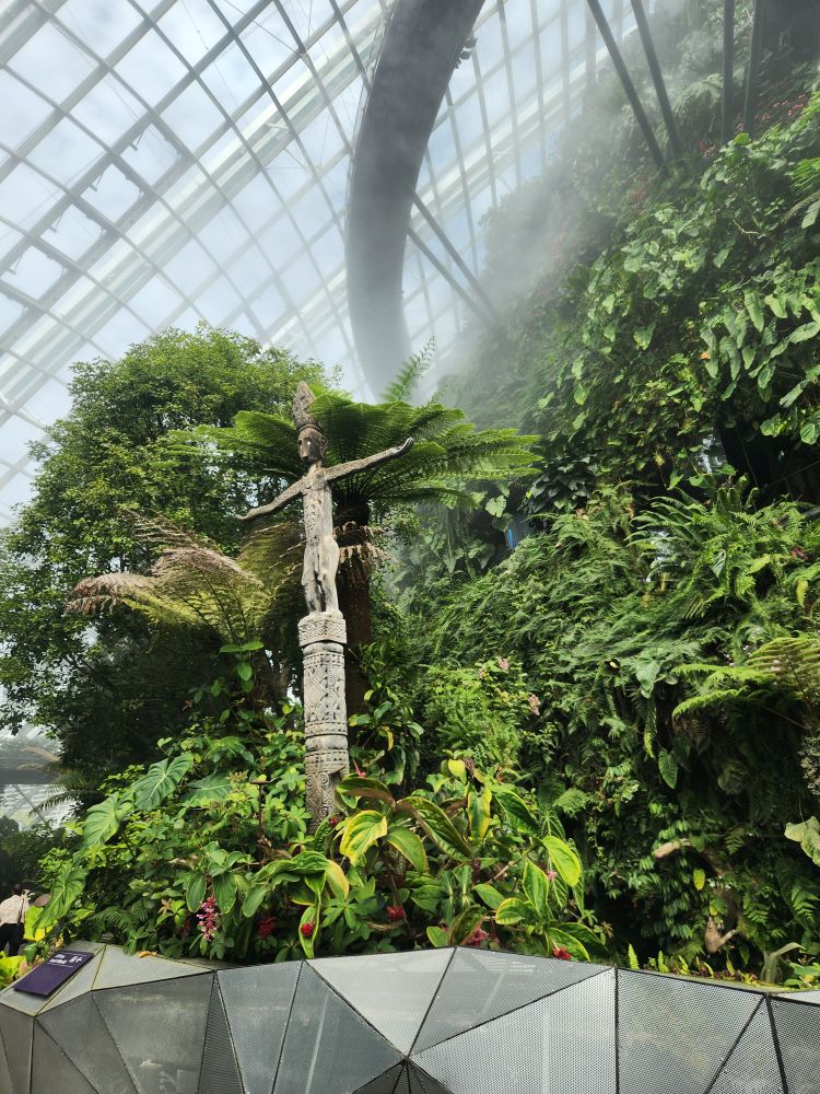 Even with the longer walk, we still get to the gardens right after opening. Being early has its advantages, there isn’t even a line at the ticket booth! Eschewing the Flower Dome, which has a Monet exhibit which makes the tickets much more expensive, we go for the budget option of the Cloud Forest and the Skytree Observatory (or the Skytree overhead walk). A nice little walk through the park finds us in the middle of the Skytree garden with the huge superstructures soaring above us. Its totally cool how they have live plants embedded almost all the way to the top of the trees structures. And how they have to have huge bucket trucks to work on the plants – fertilizing, trimming, replanting.
